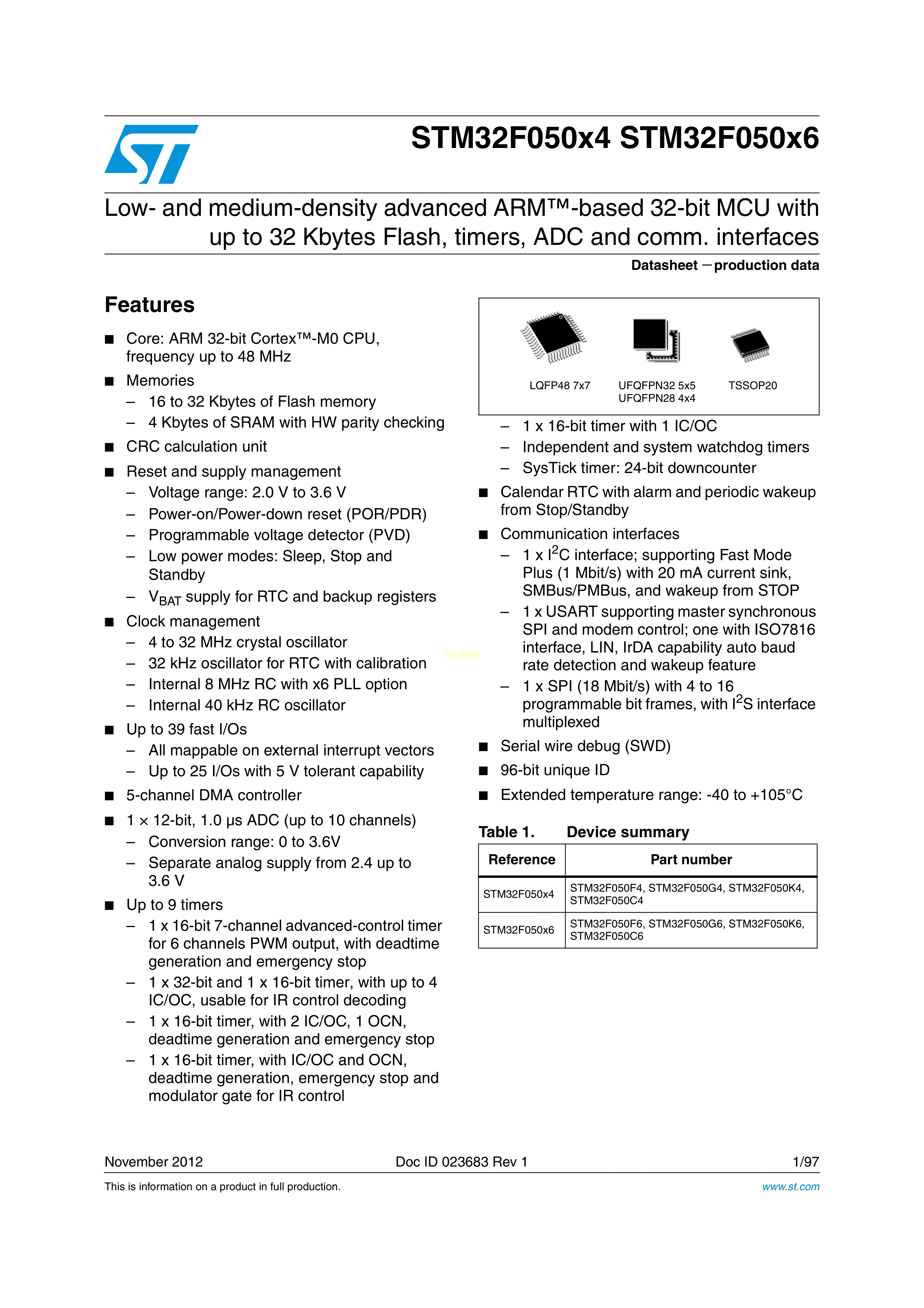 STM32F051C6U6数据手册UFQFPN-48(7x7)封装ST(意法半导体)PDF规格书,中