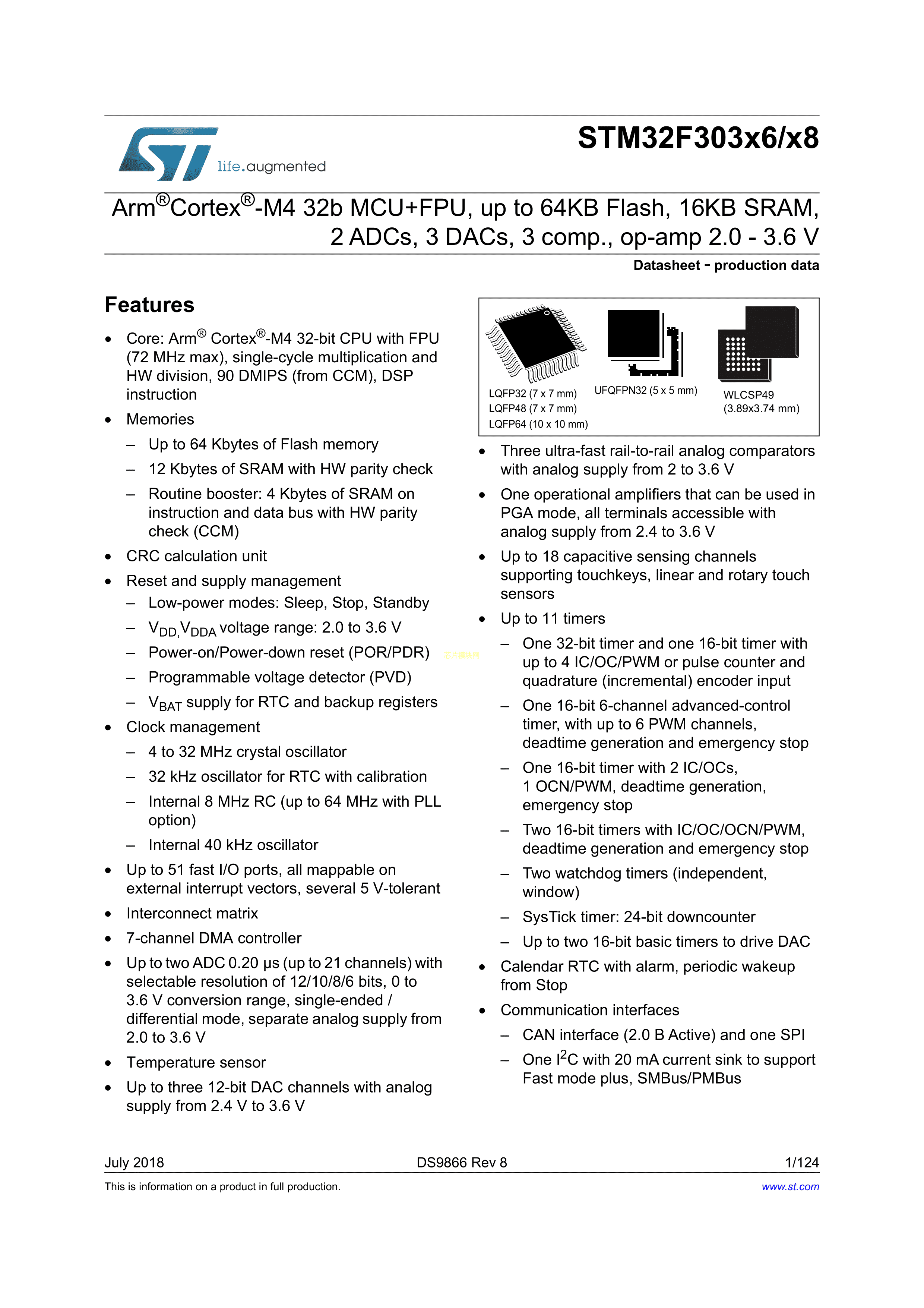 STM32F303R8T7数据手册LQFP-64(10x10)封装ST(意法半导体)PDF规格书,中