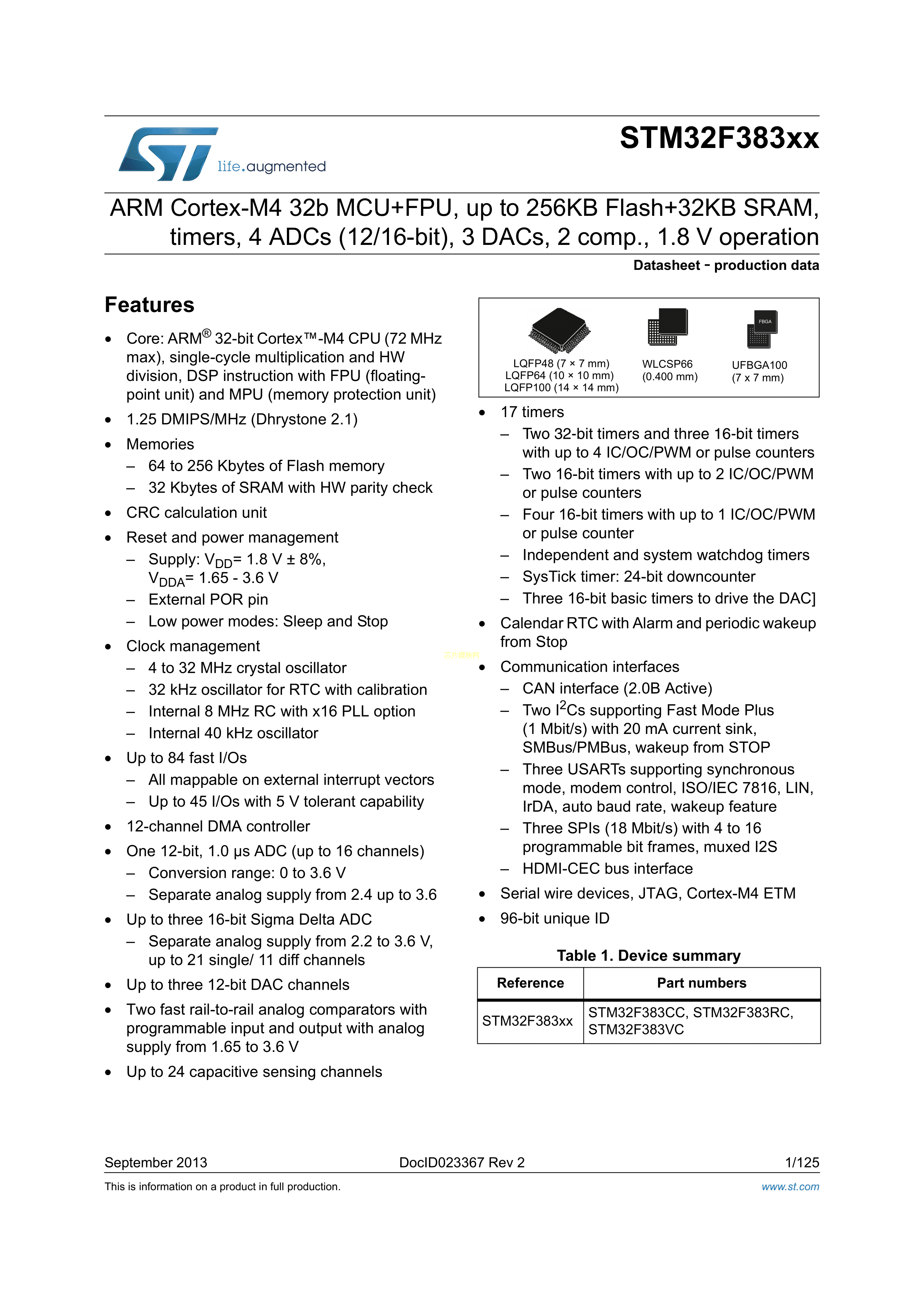 STM32F383RCY6TR数据手册WLCSP-66(3.8x4.2)封装ST(意法半导体)PDF