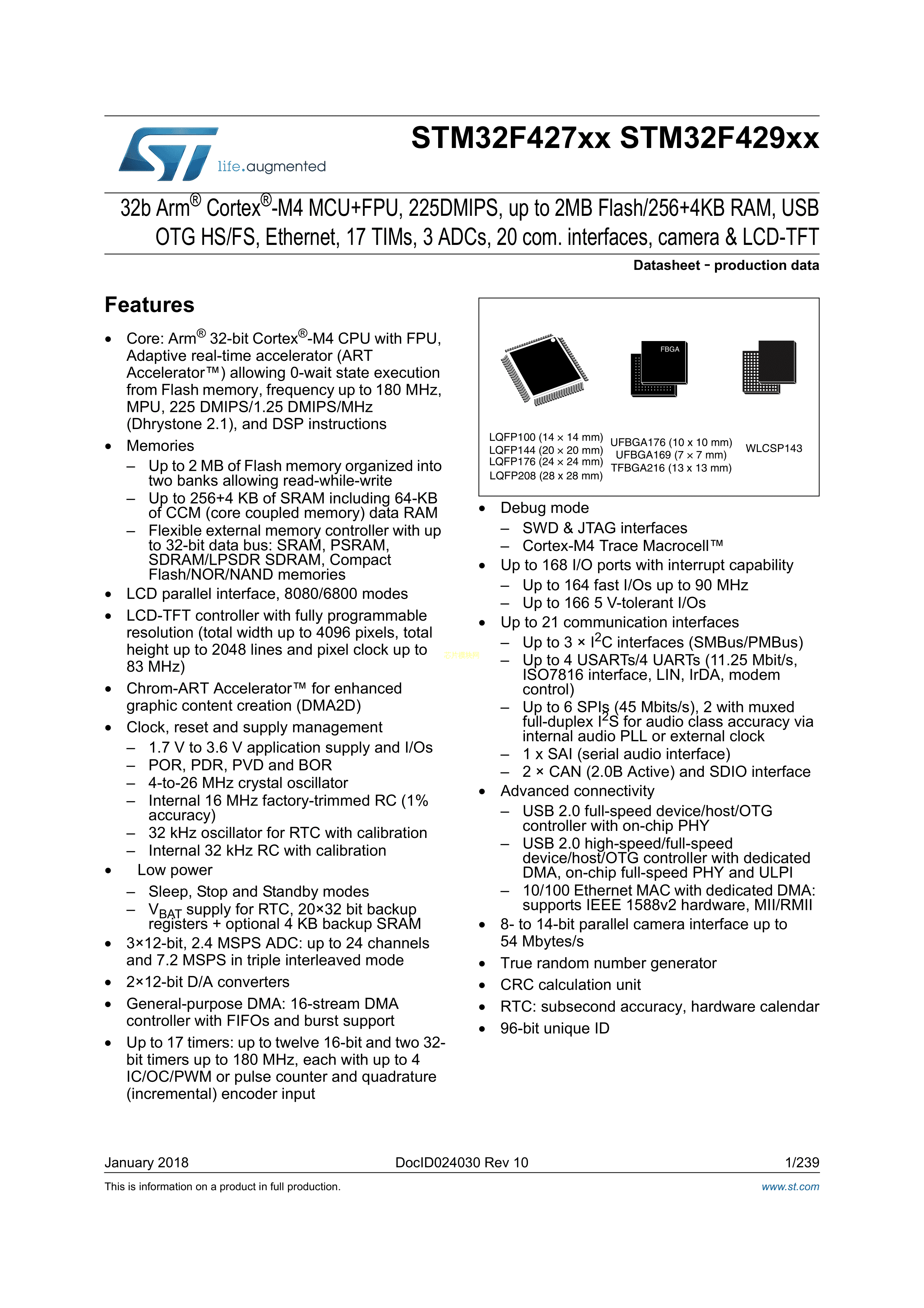 STM32F429ZGT6TR数据手册LQFP-144(20x20)封装ST(意法半导体)PDF规格