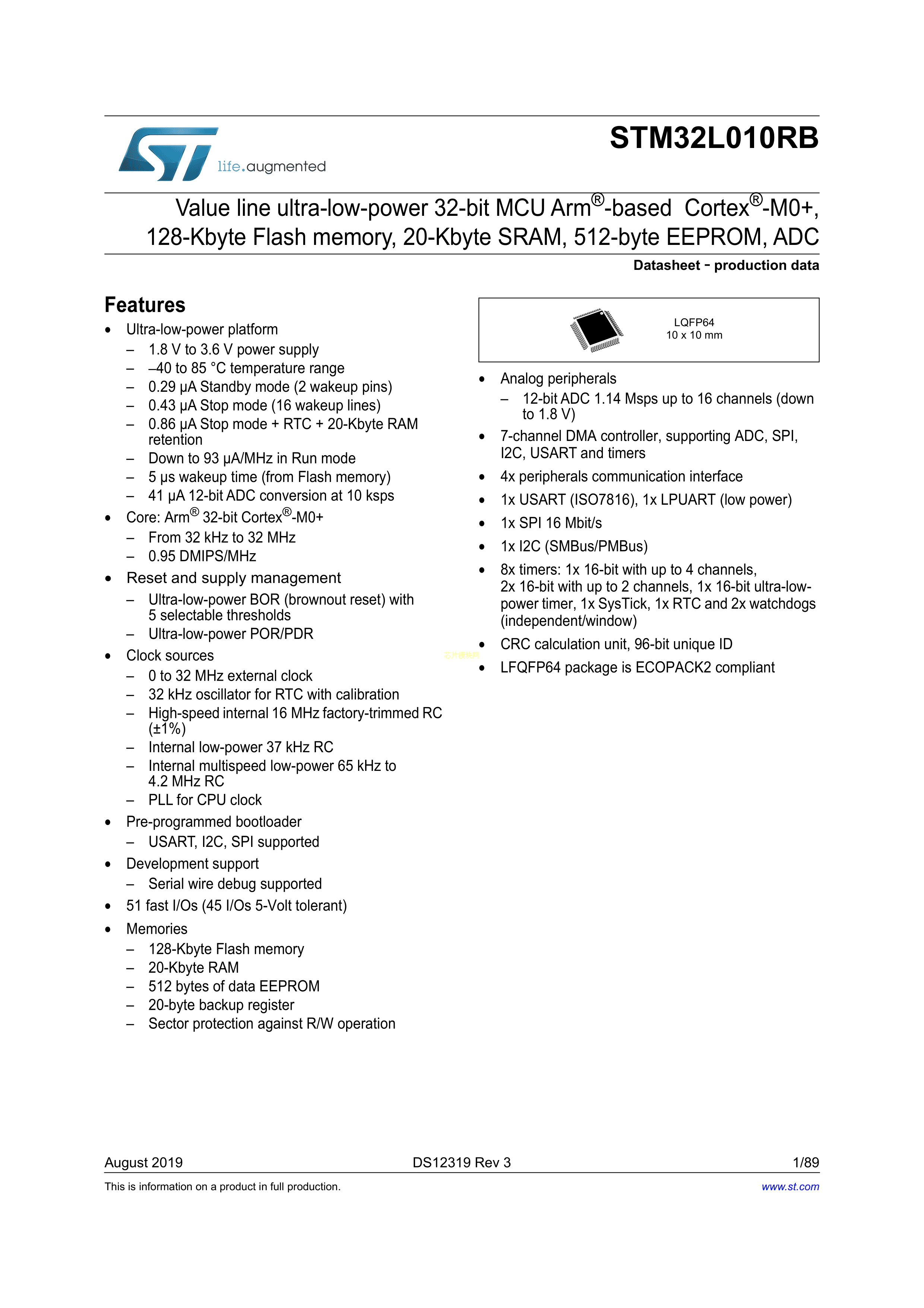 STM32L010RBT6数据手册LQFP-64封装ST(意法半导体)PDF规格书,中英文下载