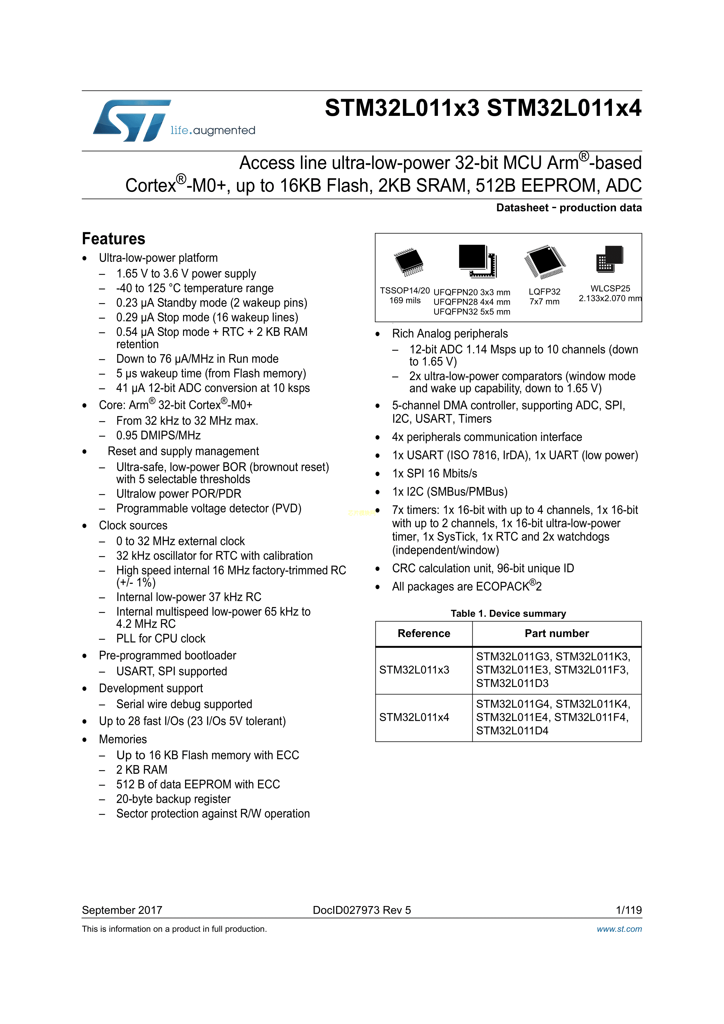 STM32L011E4Y6TR数据手册WLCSP-25封装ST(意法半导体)PDF规格书,中英文下载