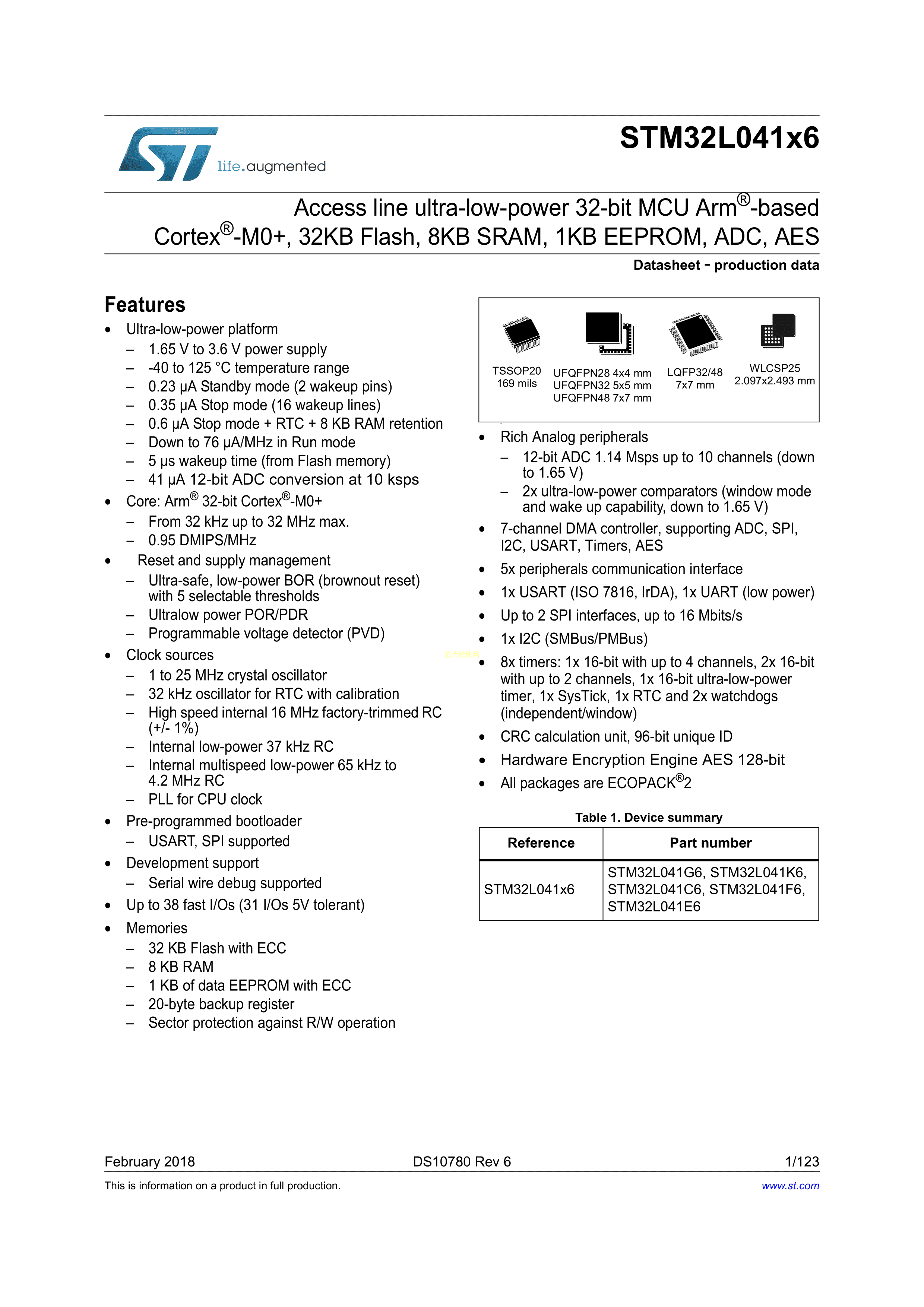 STM32L041K6U6D数据手册UFQFPN-32(5x5)封装ST(意法半导体)PDF规格书,