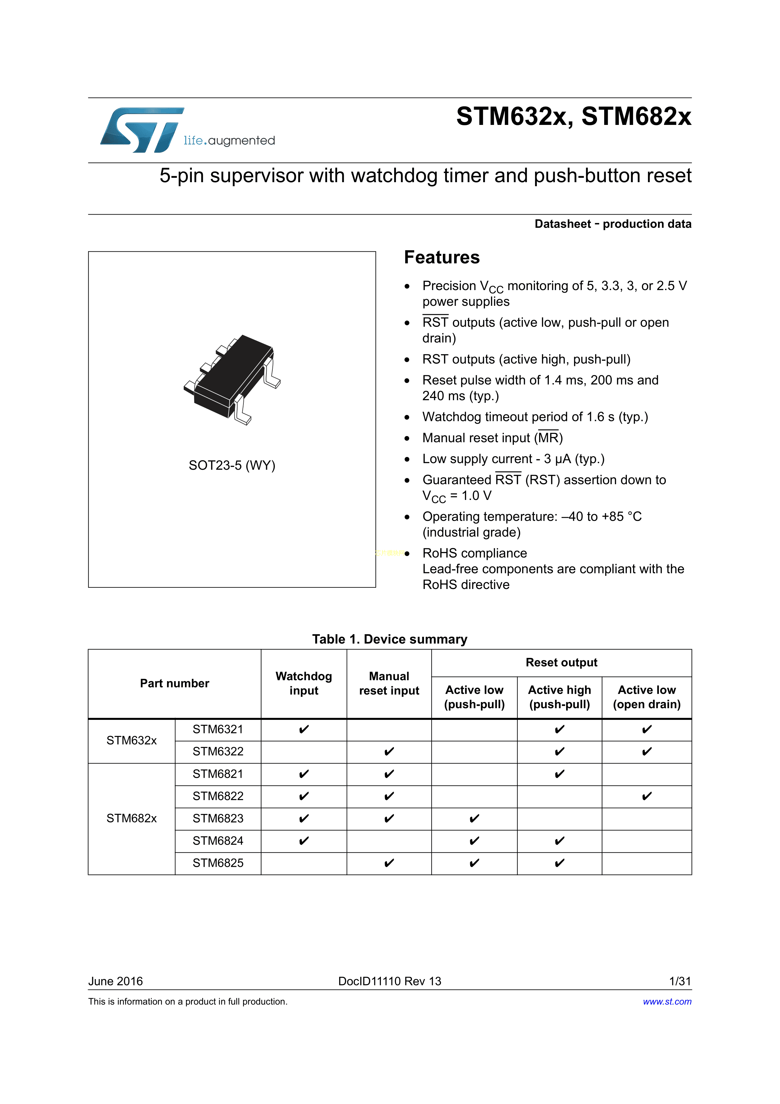STM6821RWY6F数据手册SOT-23-5封装ST(意法半导体)PDF规格书,中英文下载