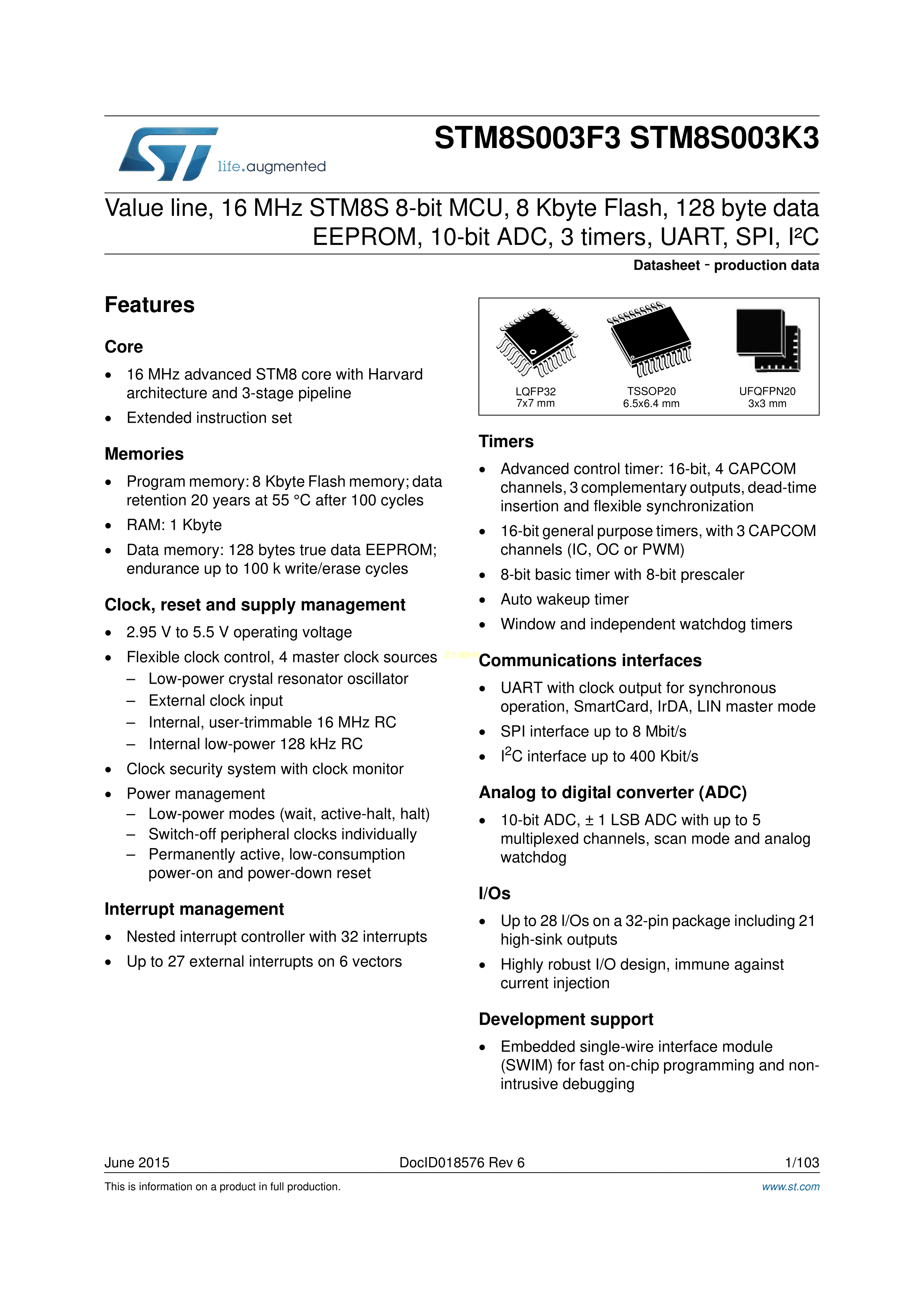 STM8S003F3U6TR数据手册UFQFPN-20封装ST(意法半导体)PDF规格书,中英文下载