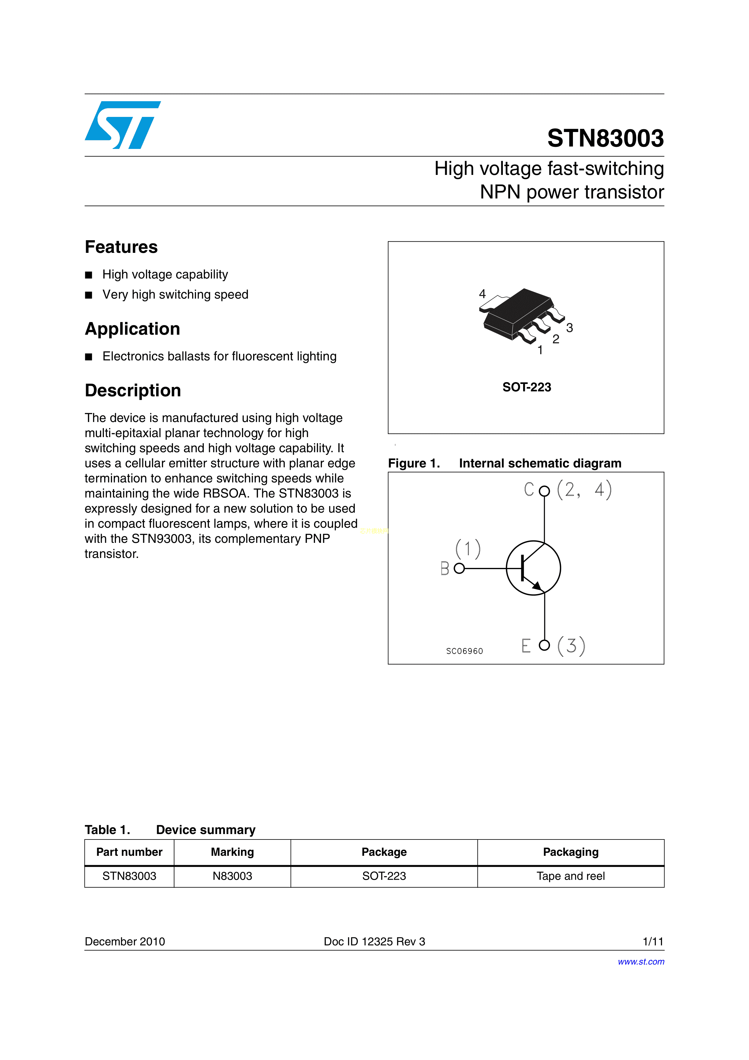 STN83003数据手册SOT-223-4封装ST(意法半导体)PDF规格书,中英文下载
