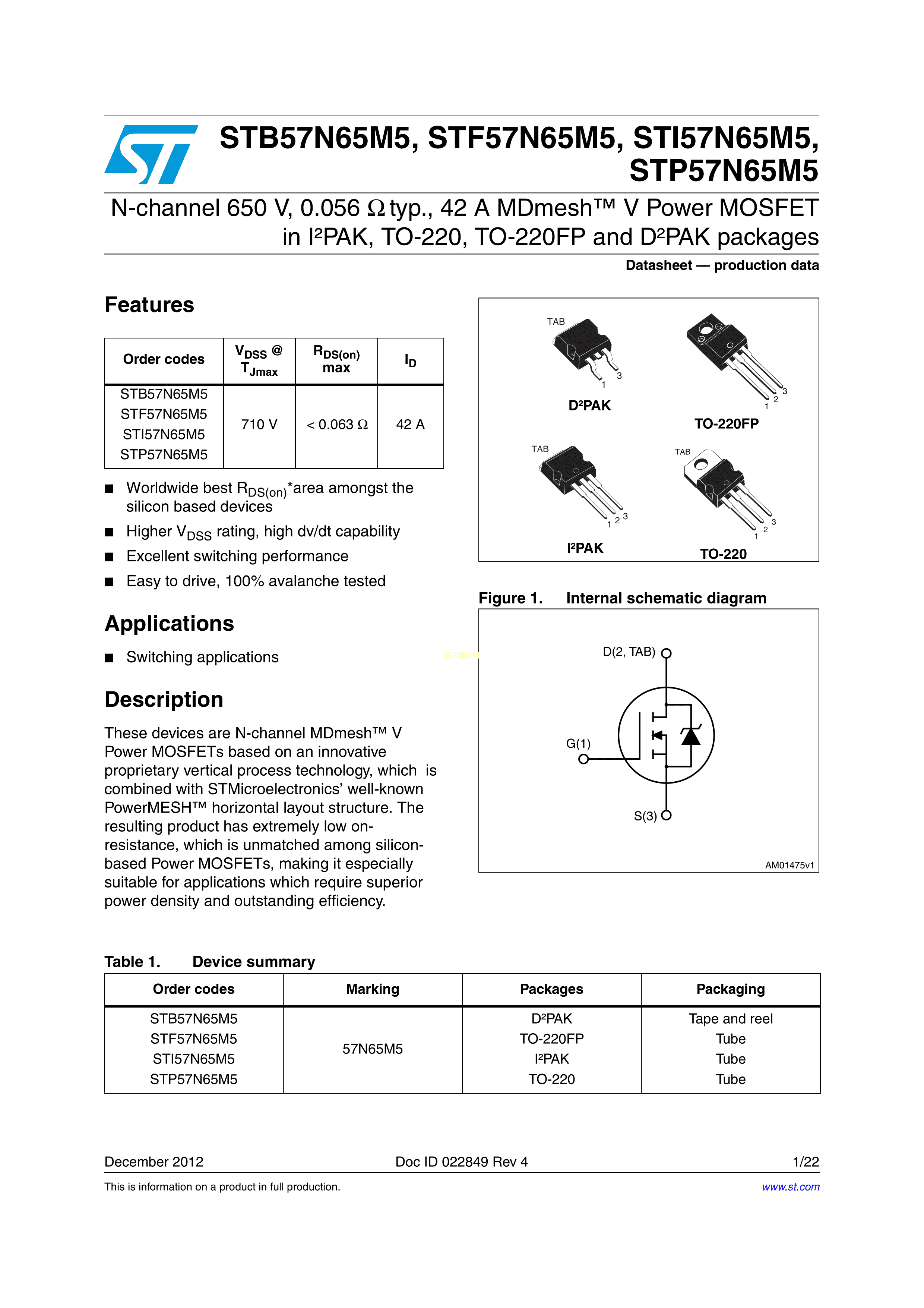 STP57N65M5数据手册TO-220封装ST(意法半导体)PDF规格书,中英文下载