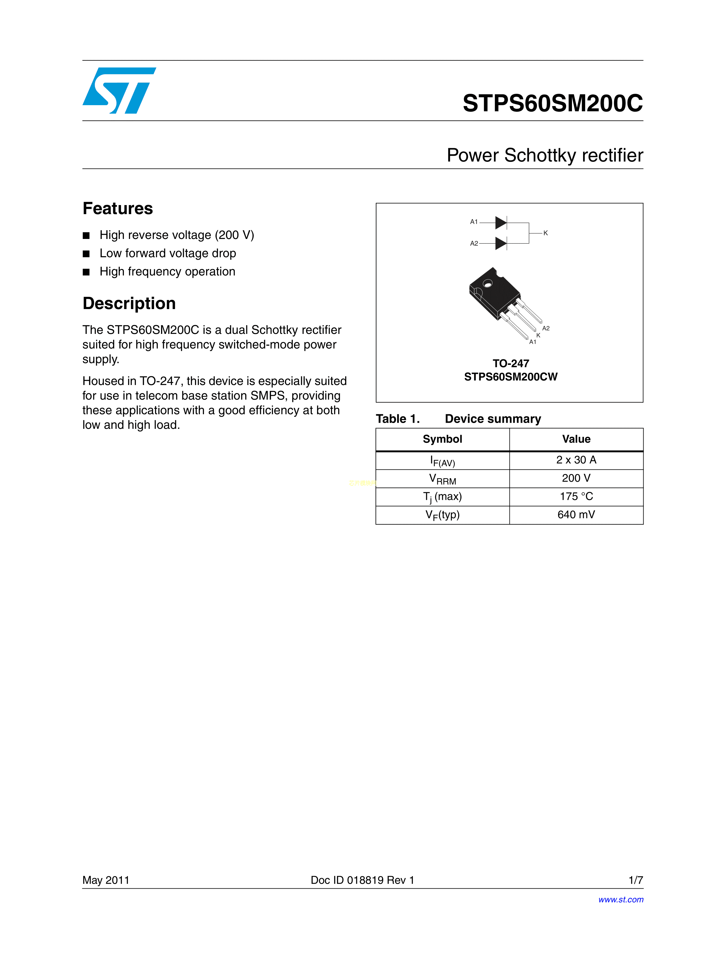 STPS60SM200CW数据手册TO-247-3封装ST(意法半导体)PDF规格书,中英文下载