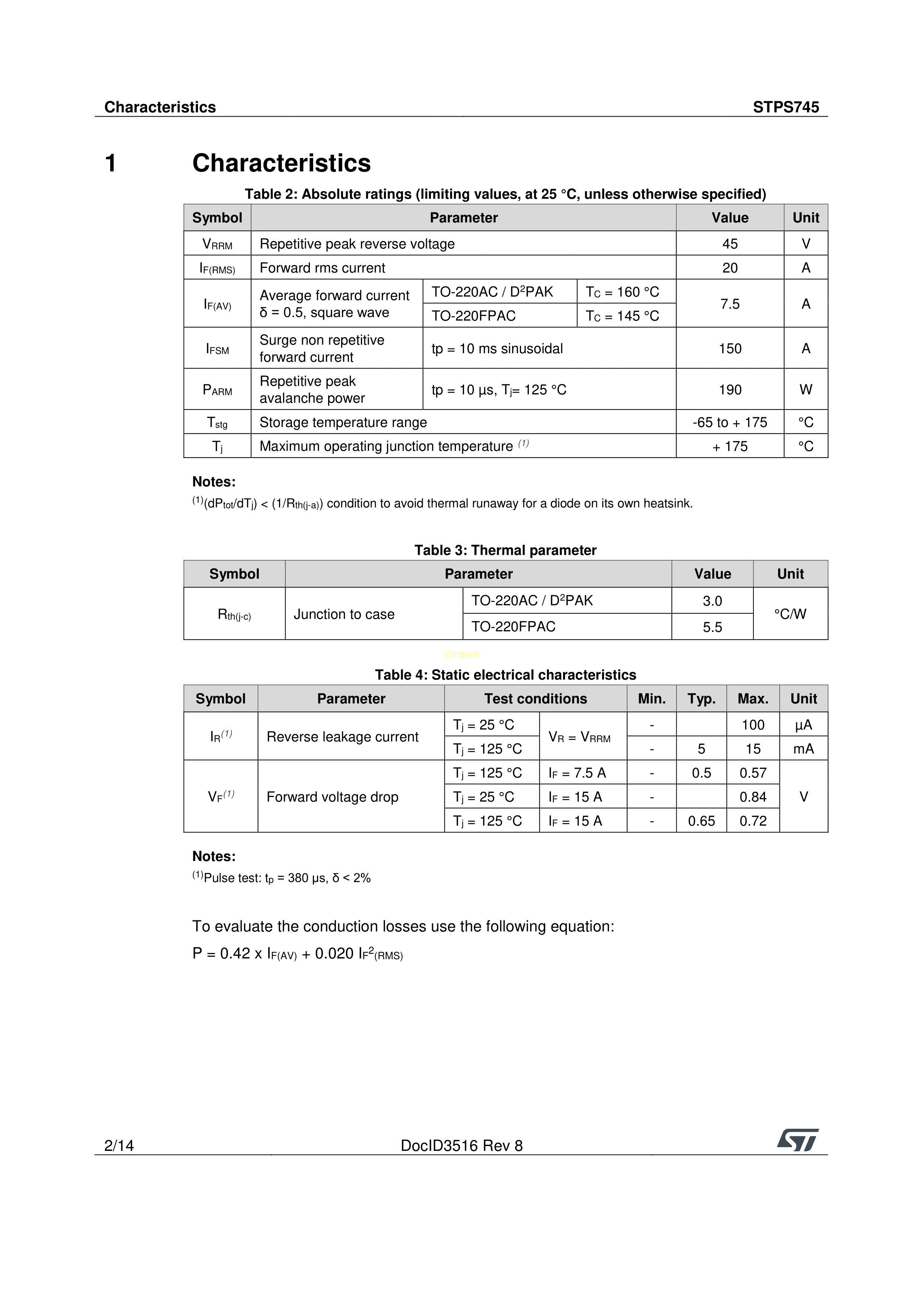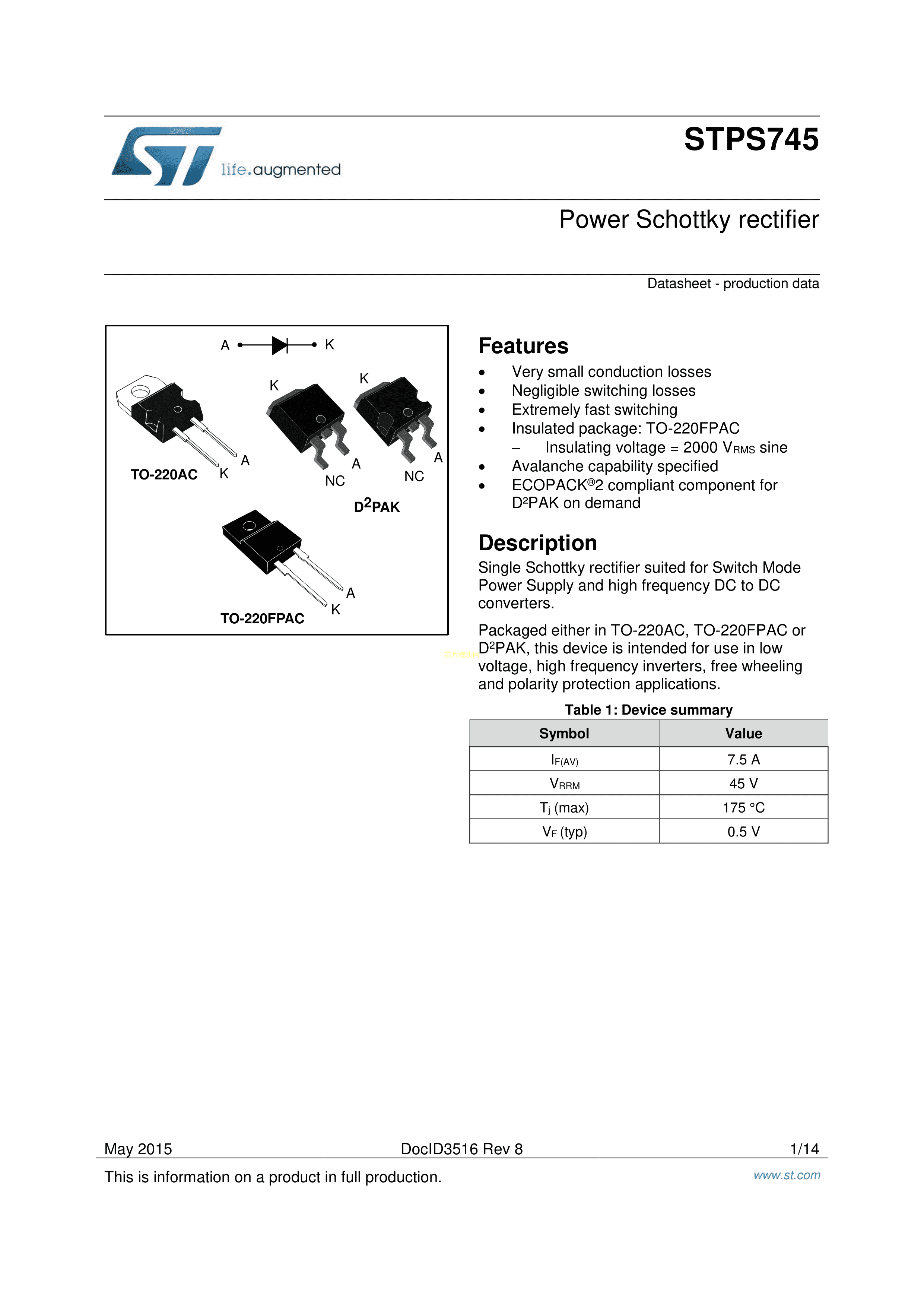 STPS745D数据手册TO-220AC封装ST(意法半导体)PDF规格书,中英文下载