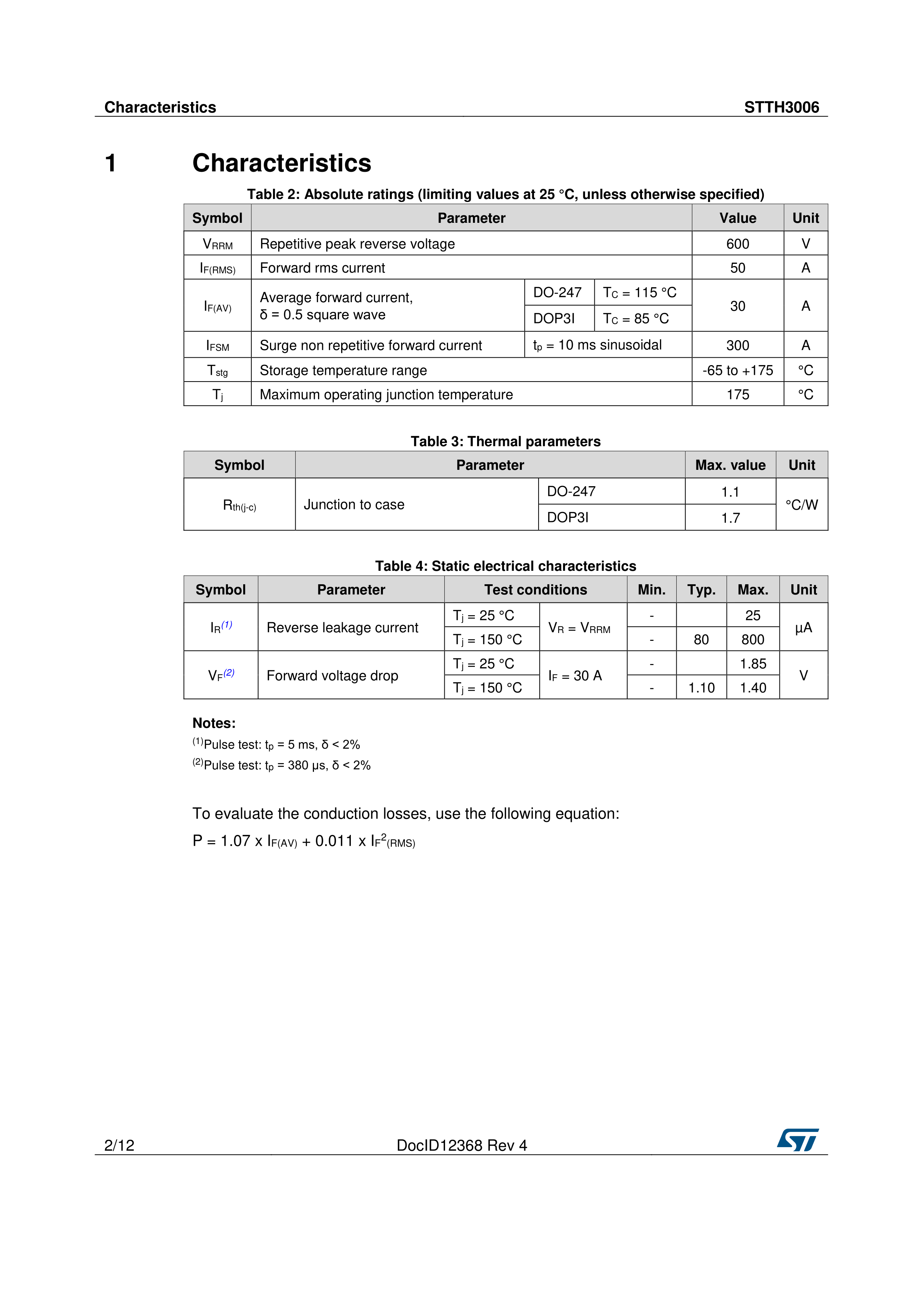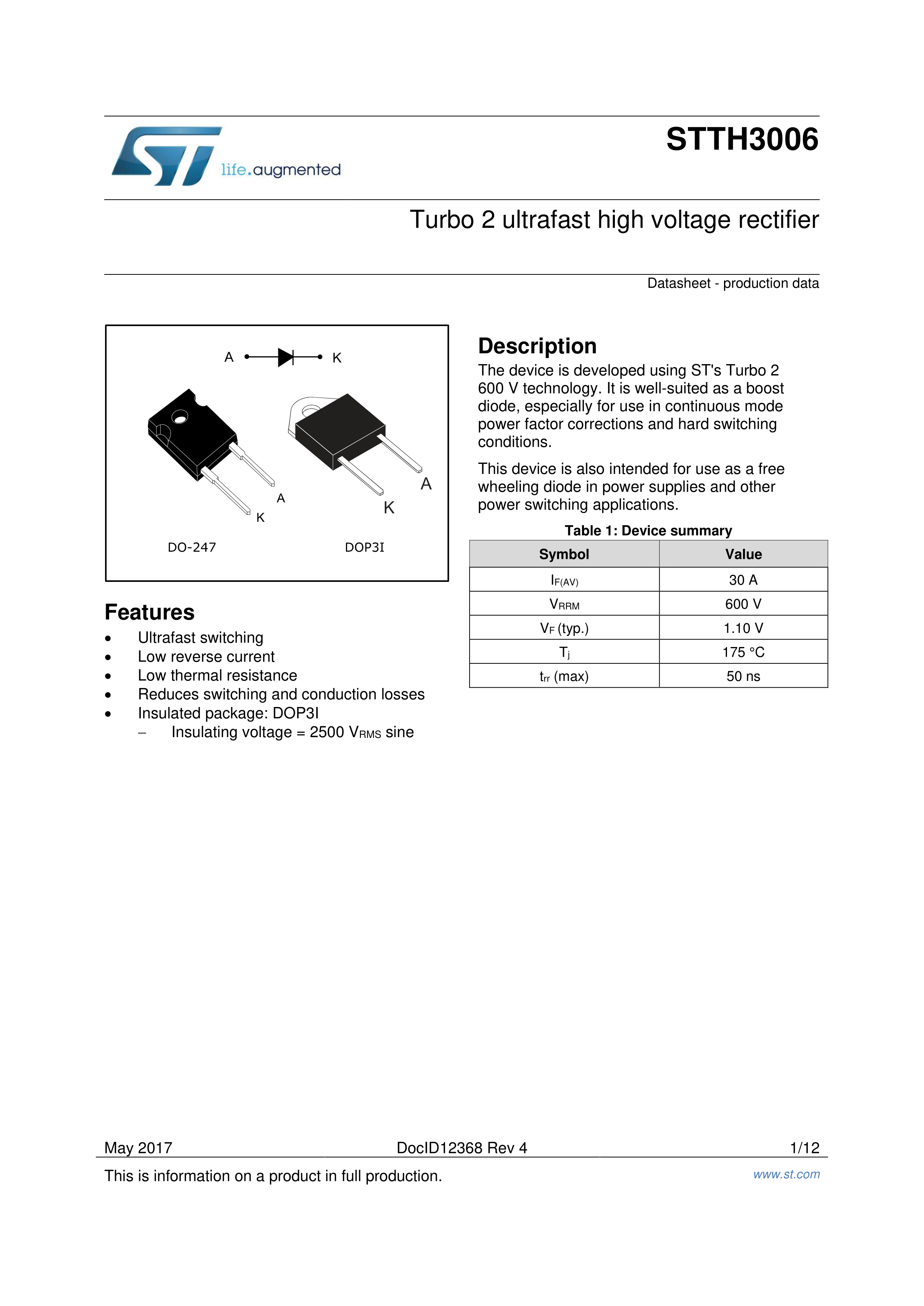 STTH3006PI数据手册DOP3I封装ST(意法半导体)PDF规格书,中英文下载