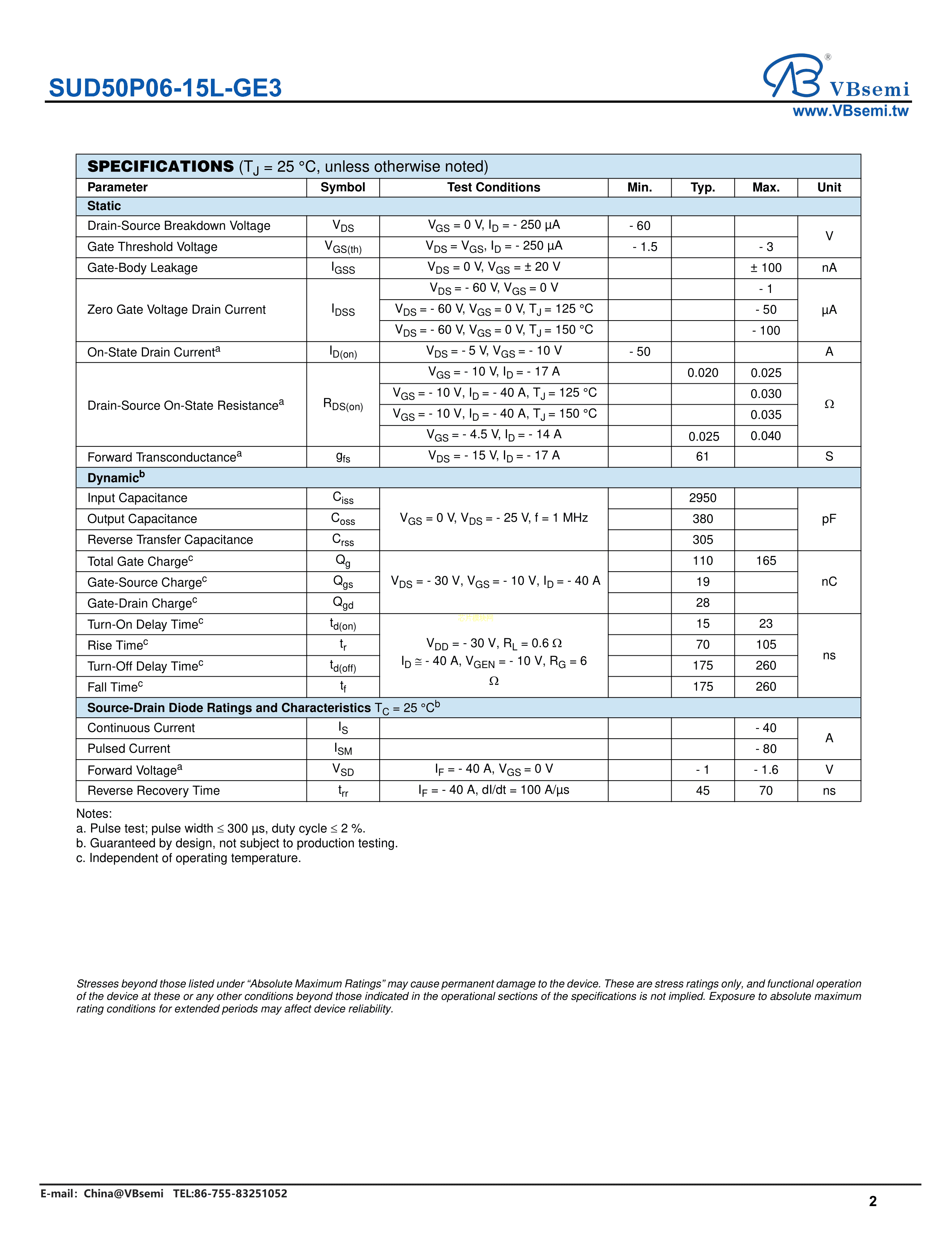 SUD50P06-15L-GE3数据手册TO-252封装VBsemi(台湾微碧)PDF规格书,中英文