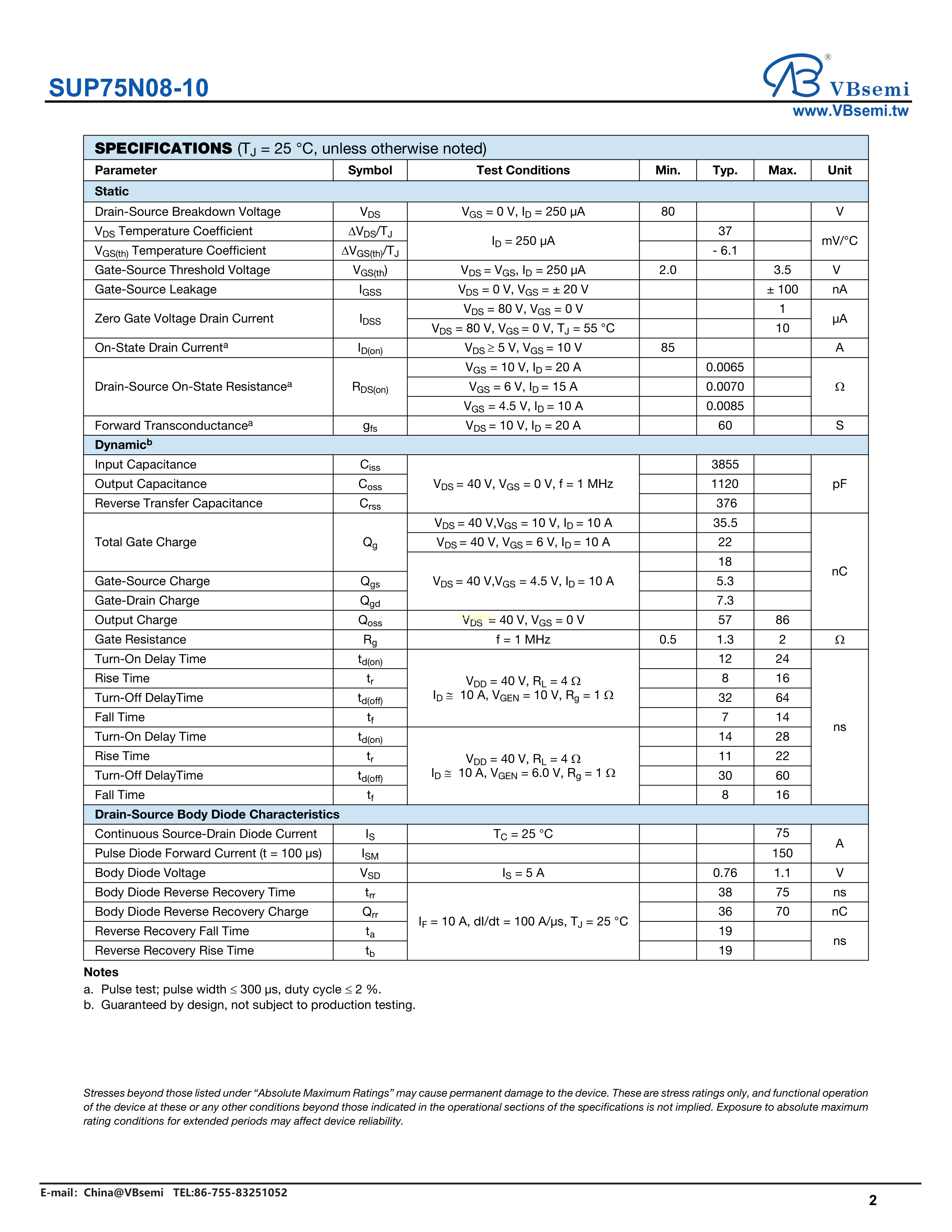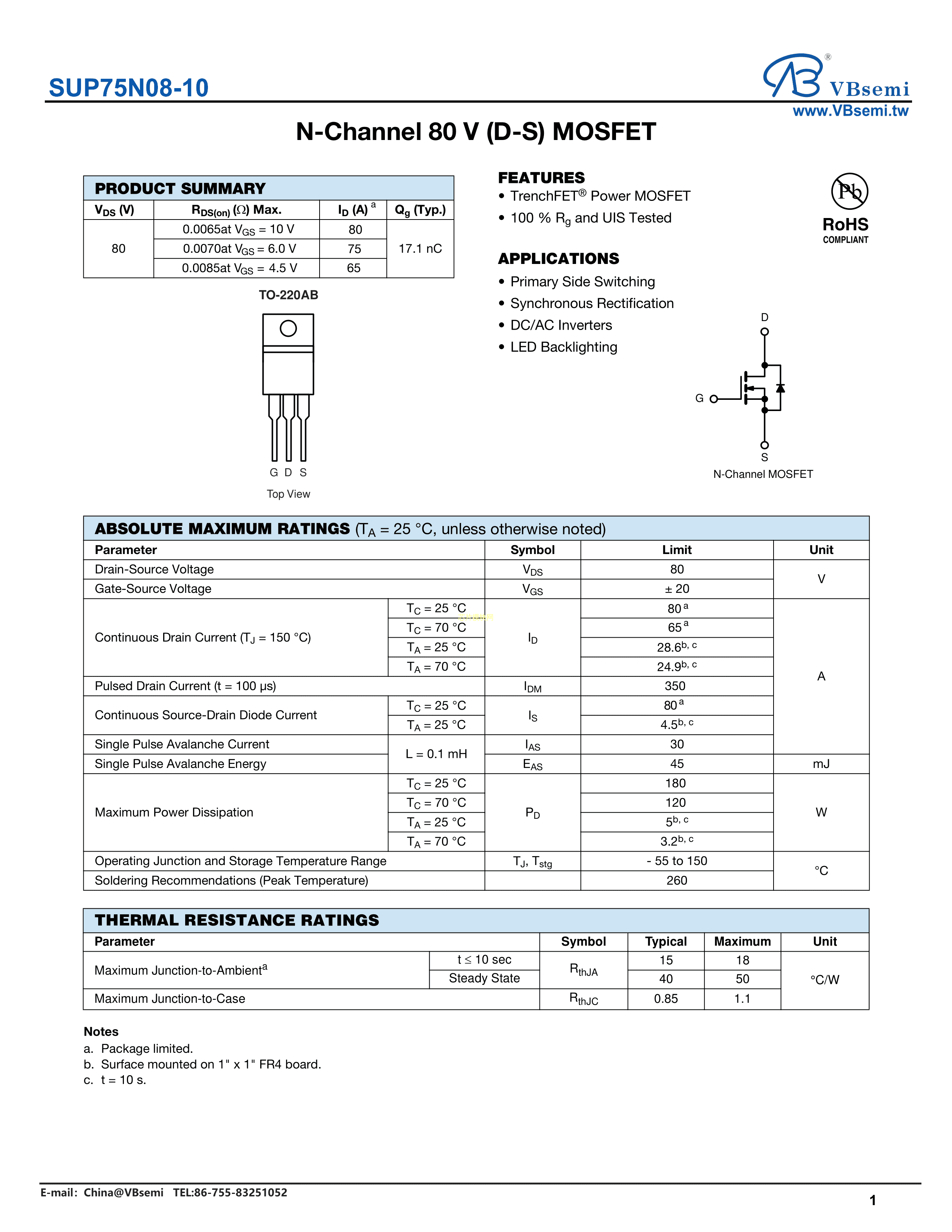 SUP75N08-10数据手册TO-220AB封装VBsemi(台湾微碧)PDF规格书,中英文下载