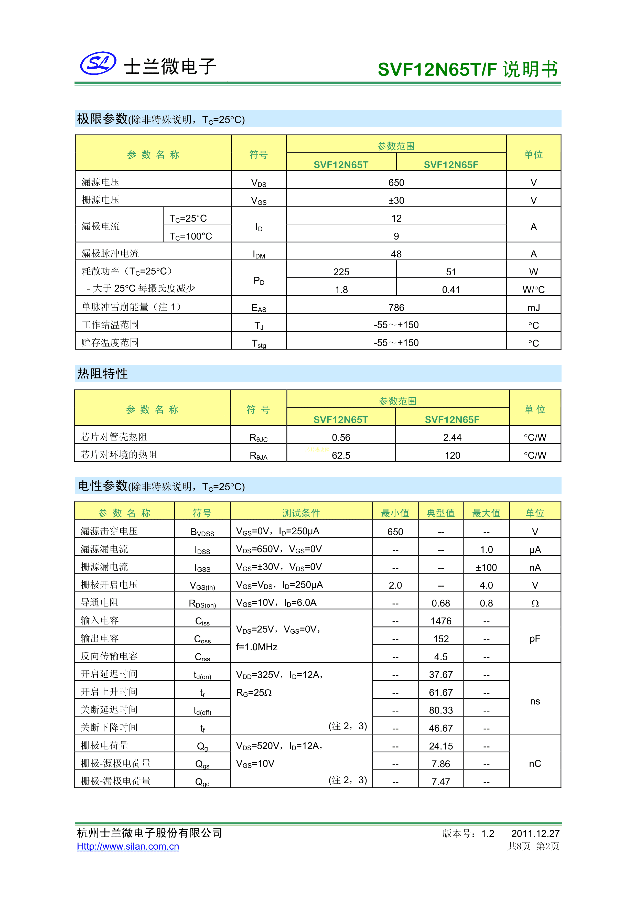 SVF12N65F数据手册TO-220F(TO-220IS)封装SILAN(士兰微)PDF规格书,中