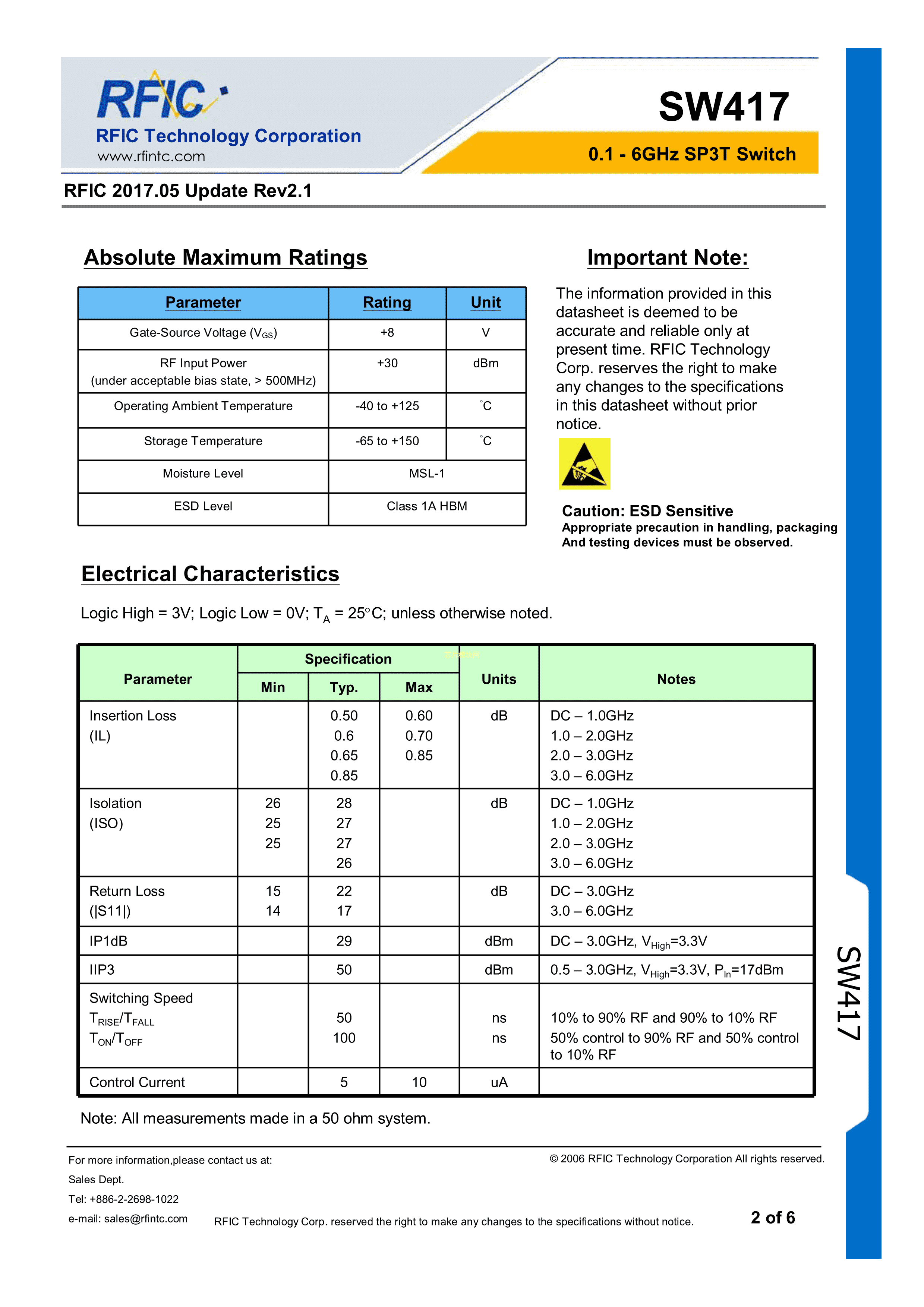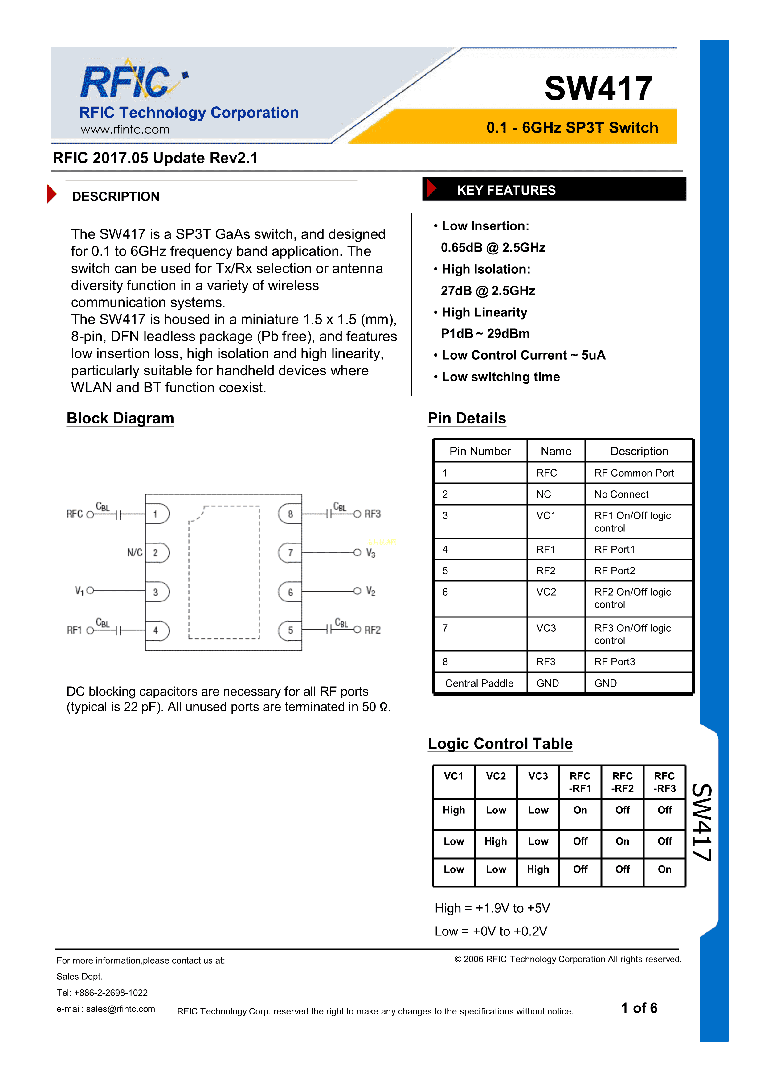 SW417数据手册DFN-8封装RFIC(台湾朗弗)PDF规格书,中英文下载