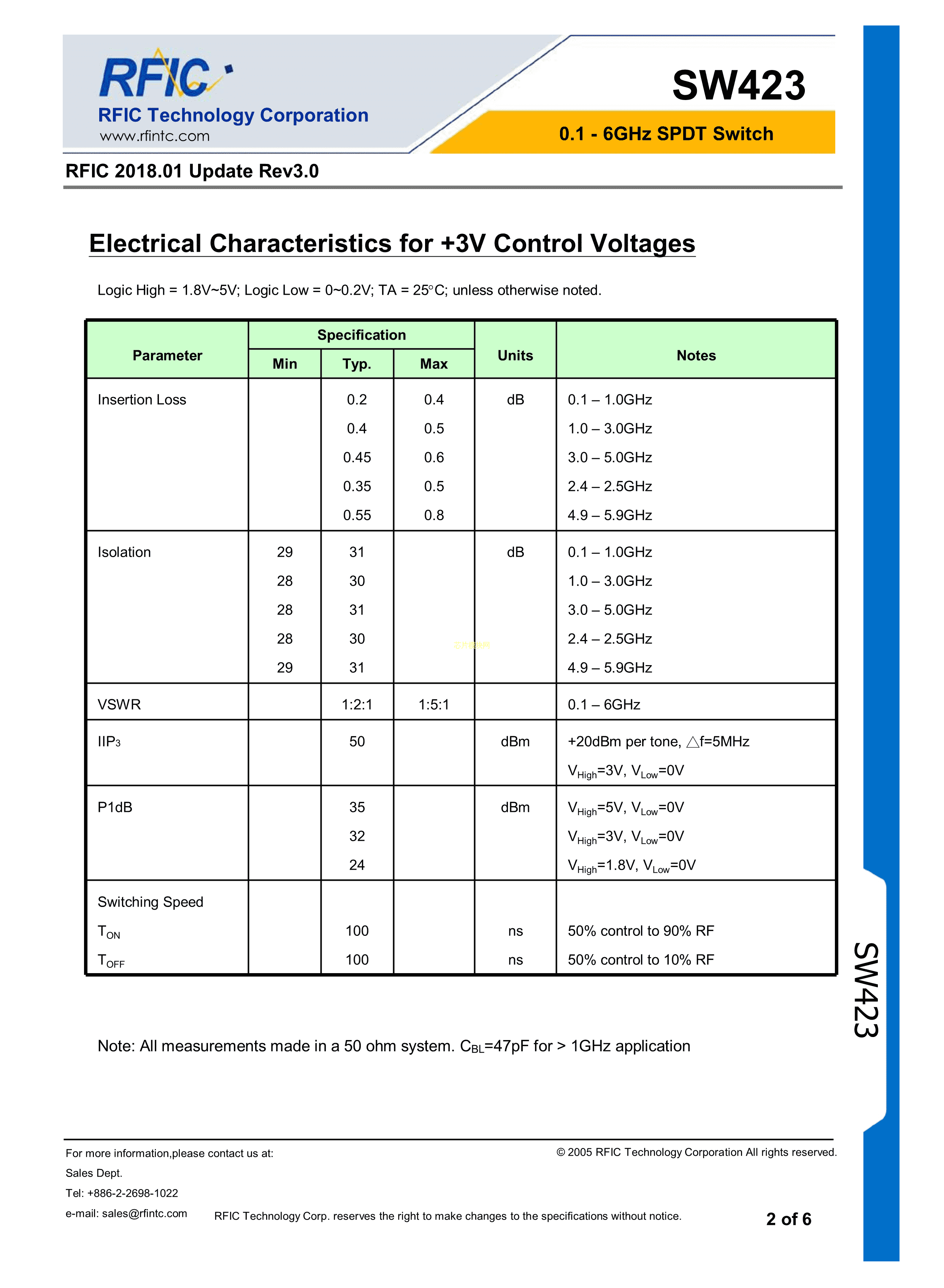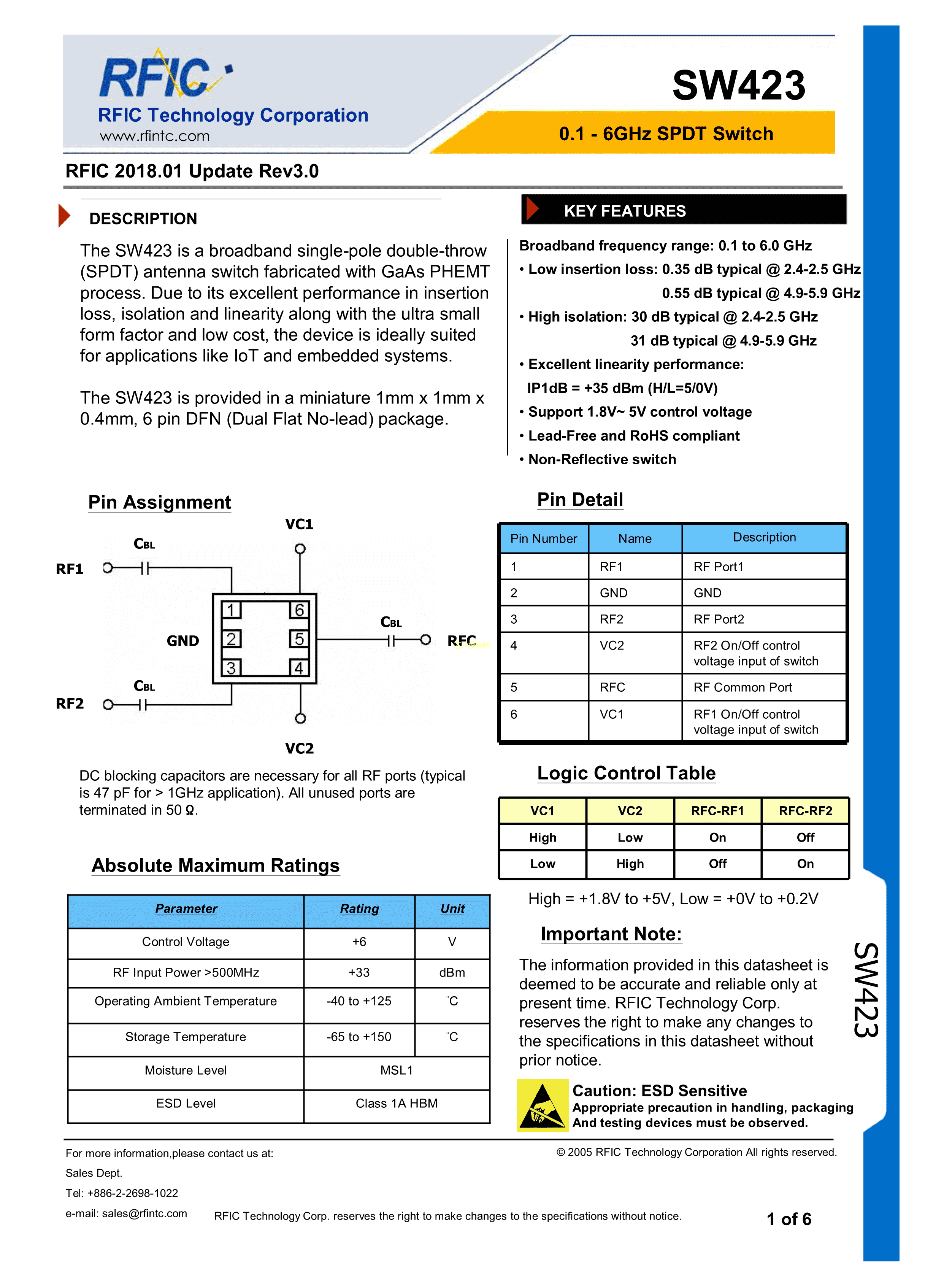 SW423数据手册DFN-6封装RFIC(台湾朗弗)PDF规格书,中英文下载