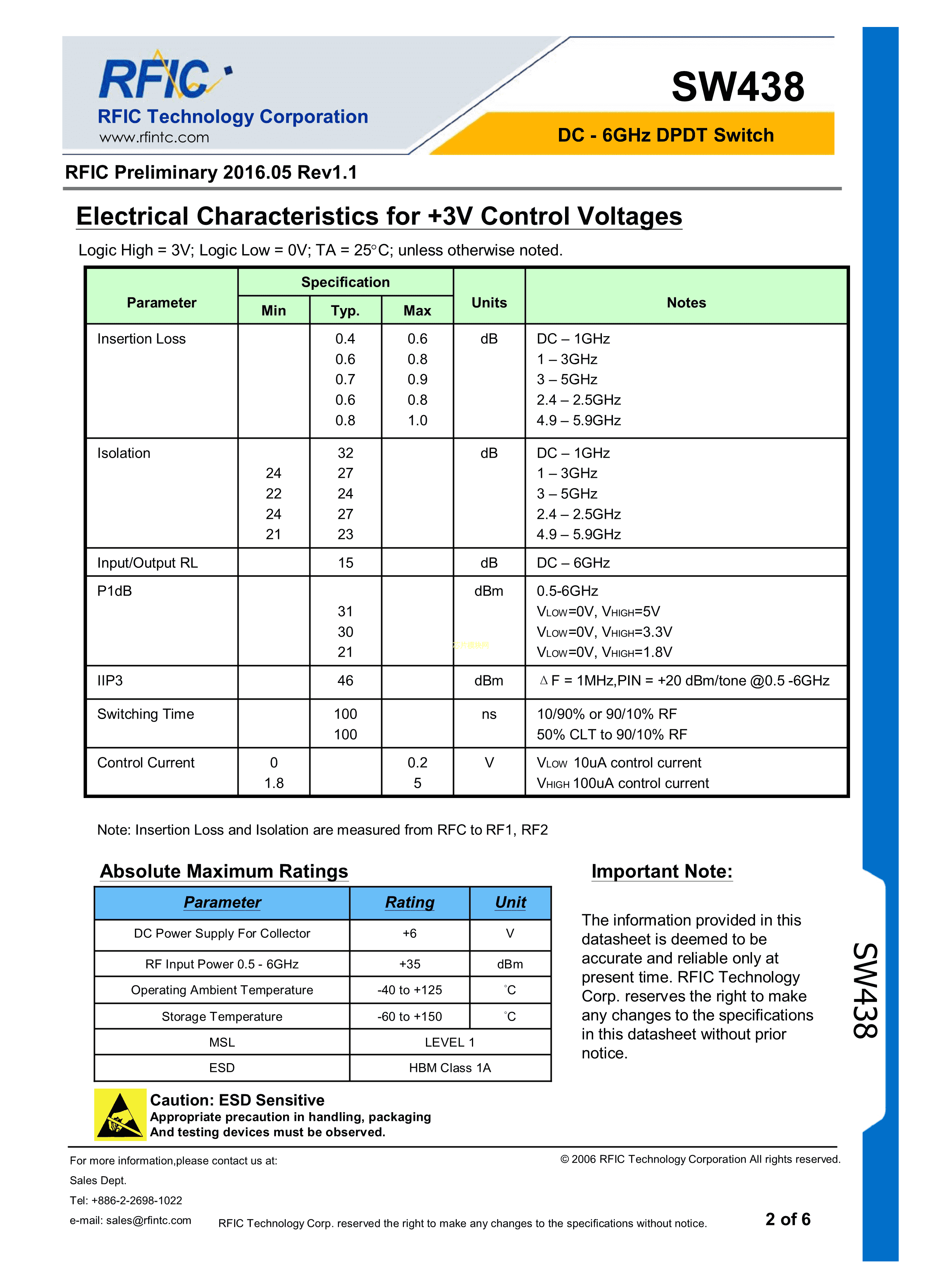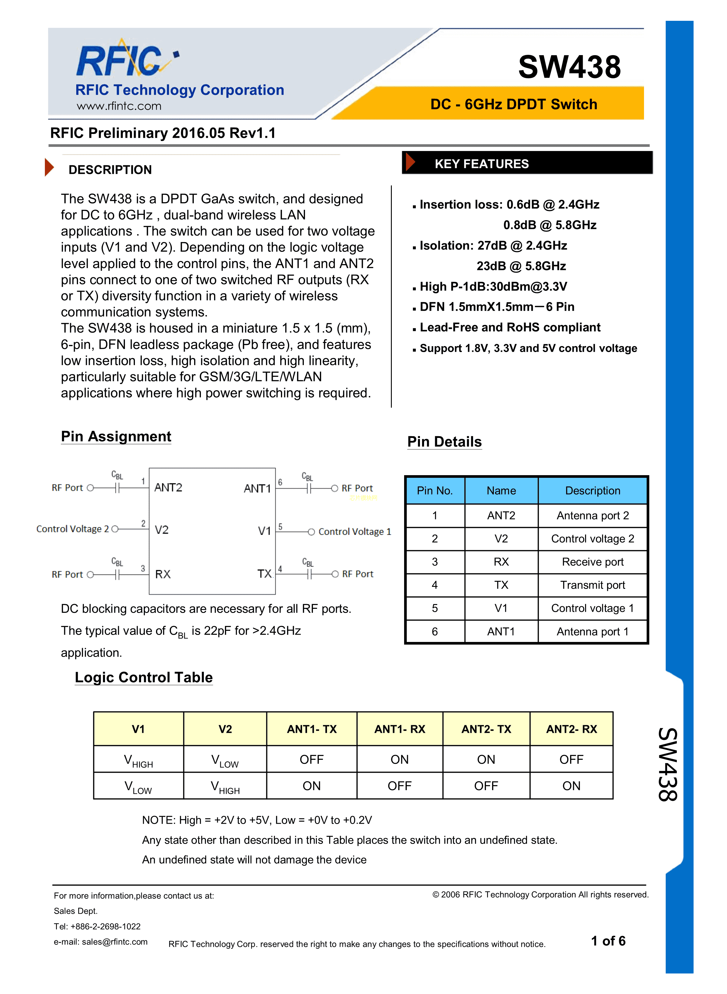 SW438数据手册DFN-6封装RFIC(台湾朗弗)PDF规格书,中英文下载