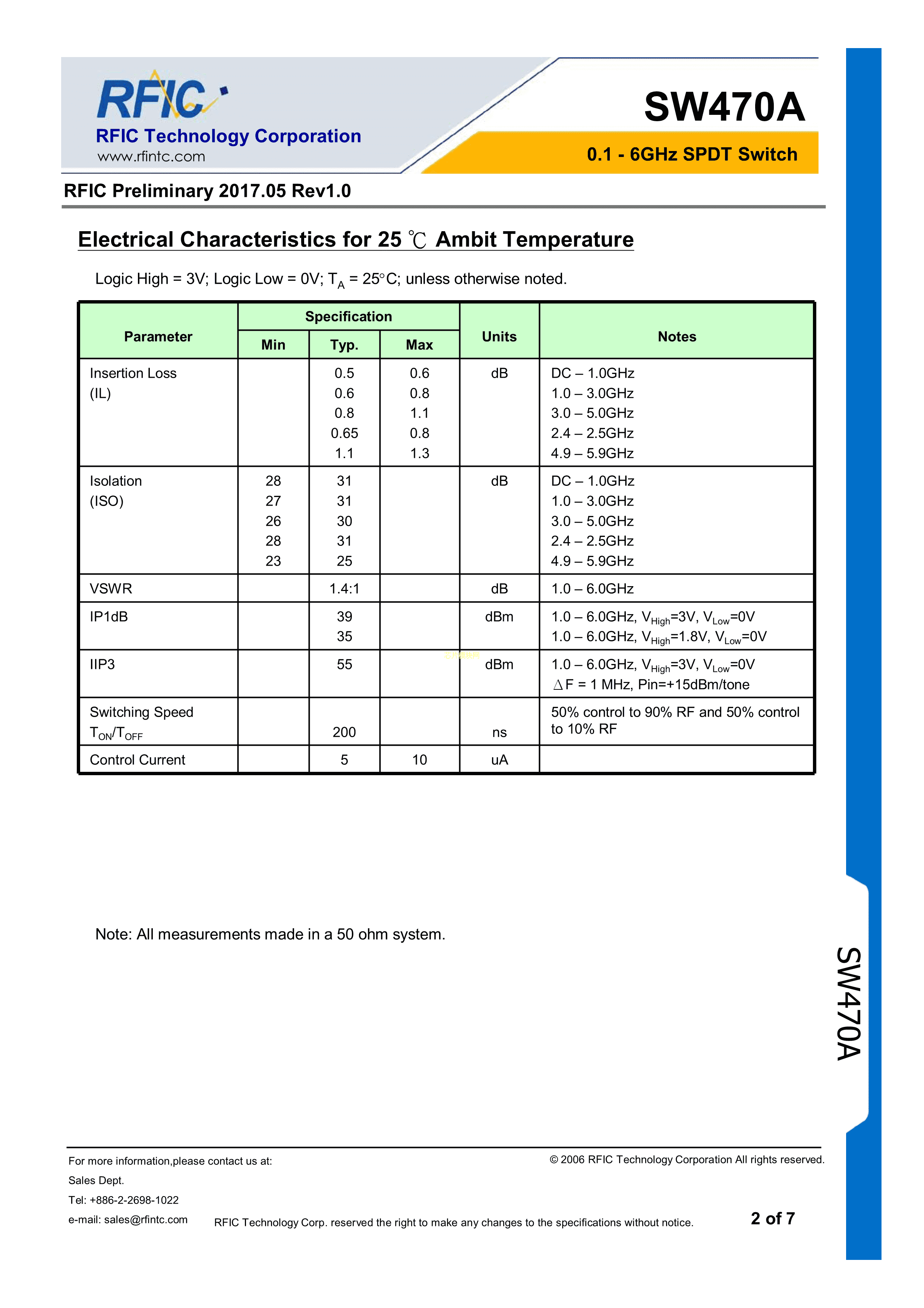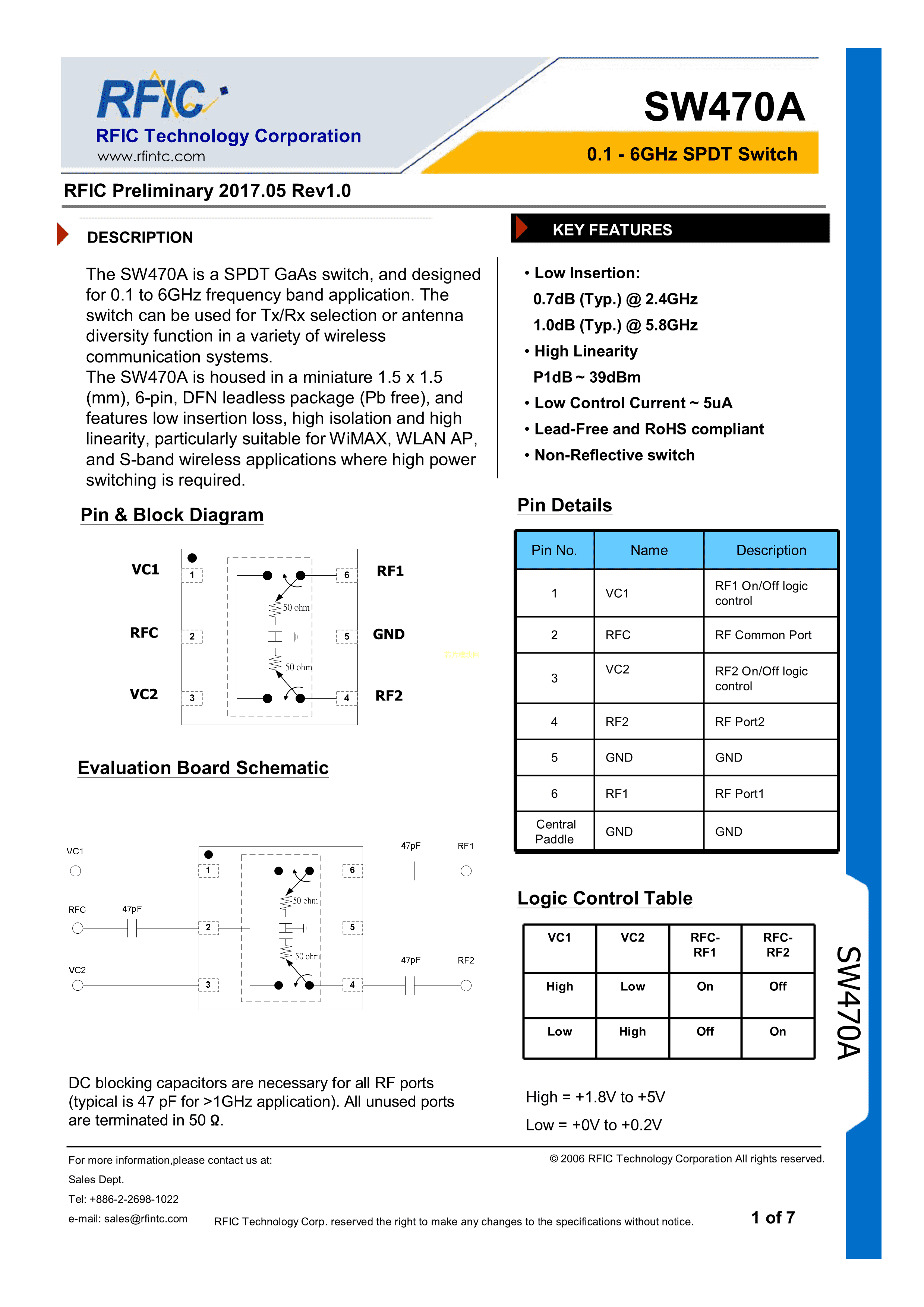 SW470A数据手册DFN-6封装RFIC(台湾朗弗)PDF规格书,中英文下载