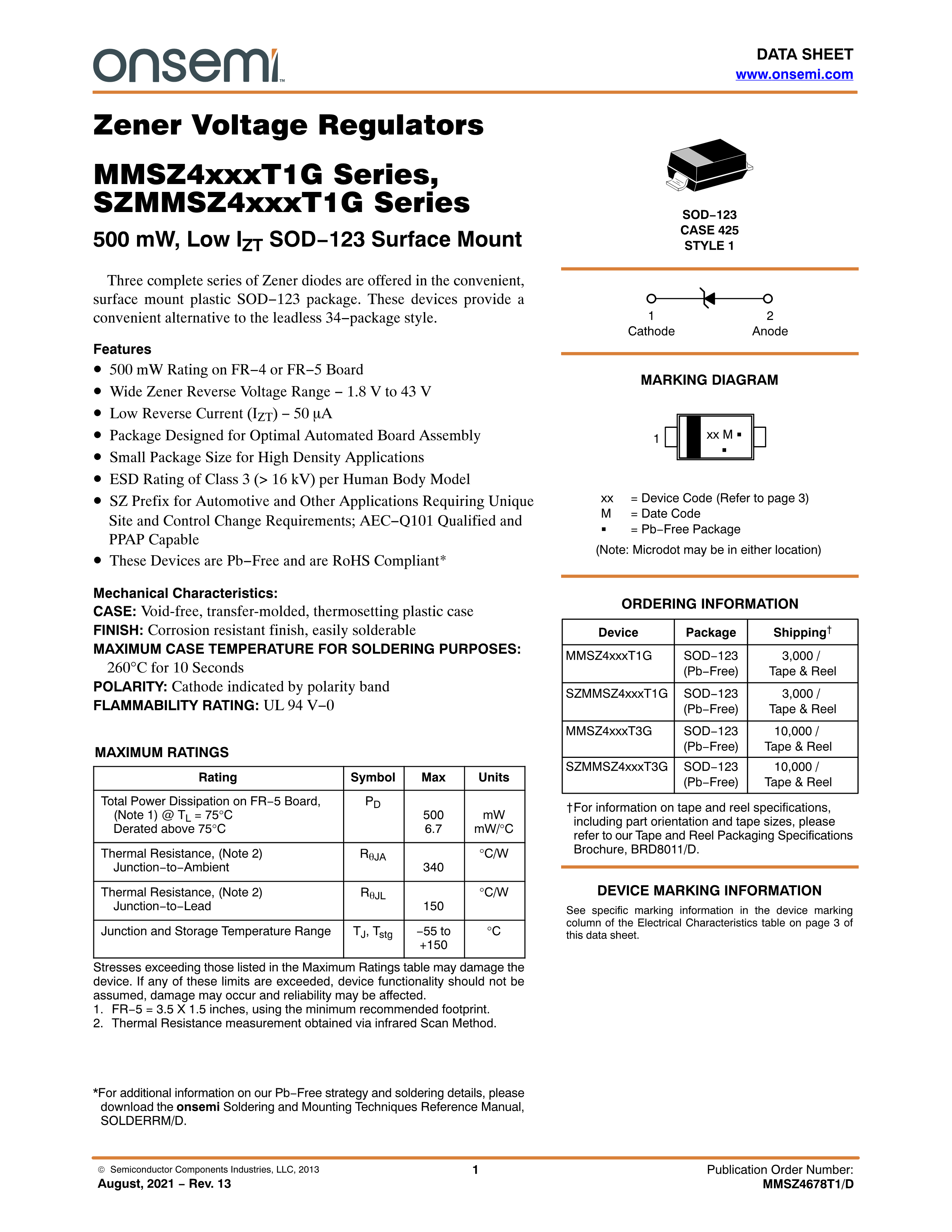 SZMMSZ4699T1G数据手册SOD-123封装onsemi(安森美)PDF规格书,中英文下载