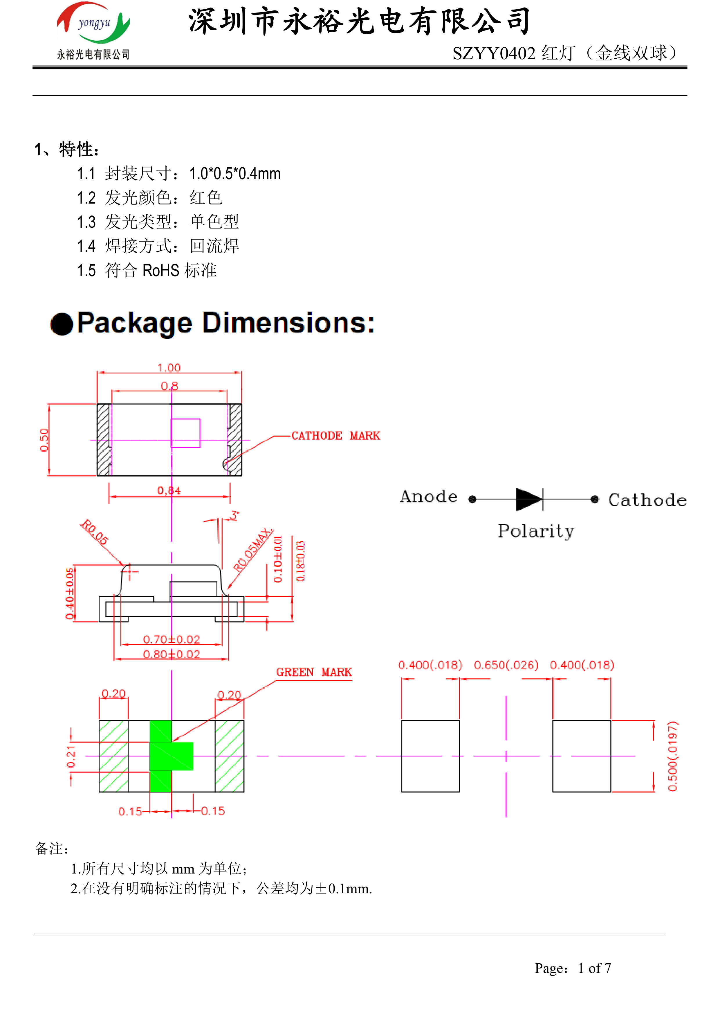 SZYY0402R数据手册SMD封装yongyu(永裕光电)PDF规格书,中英文下载