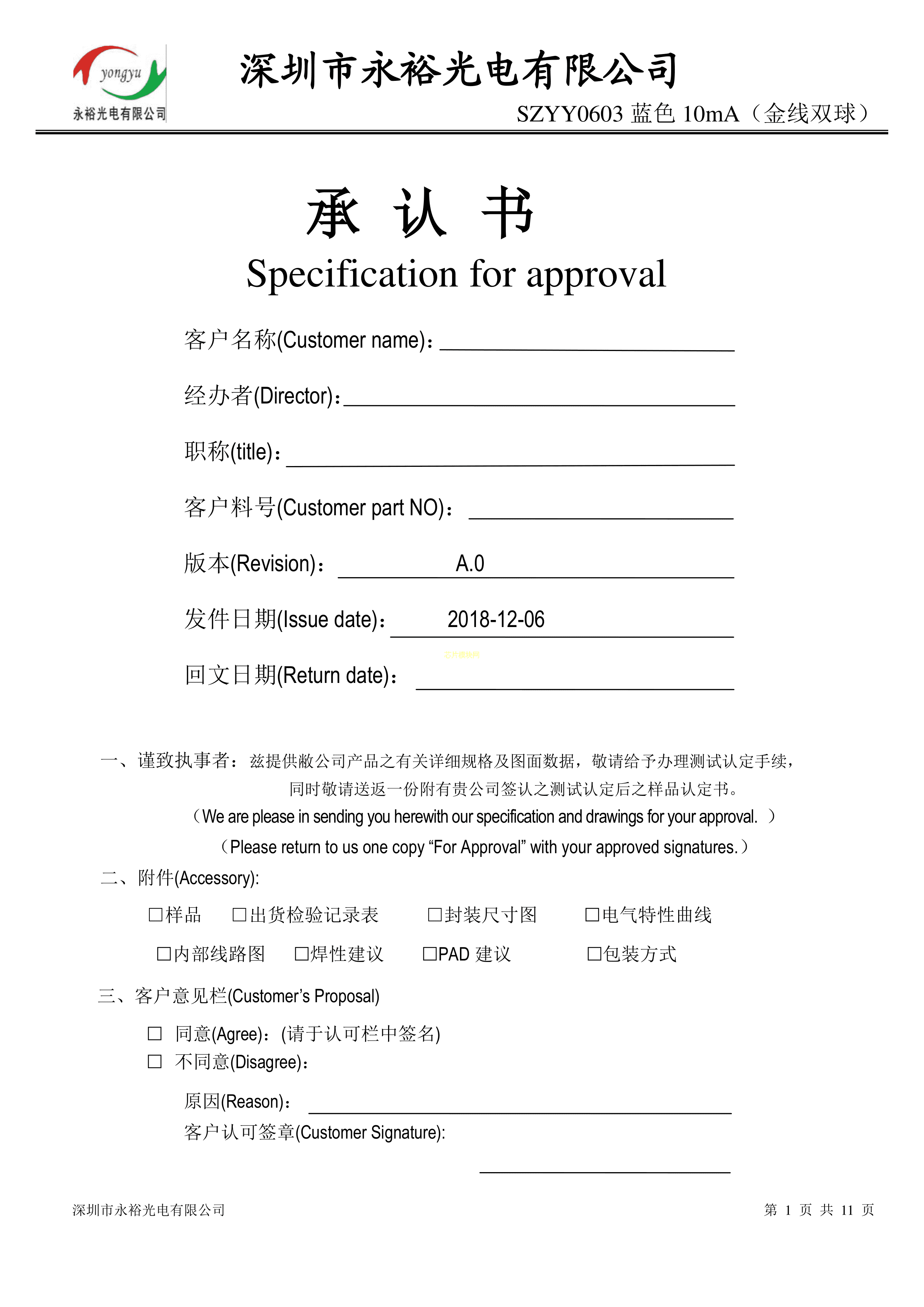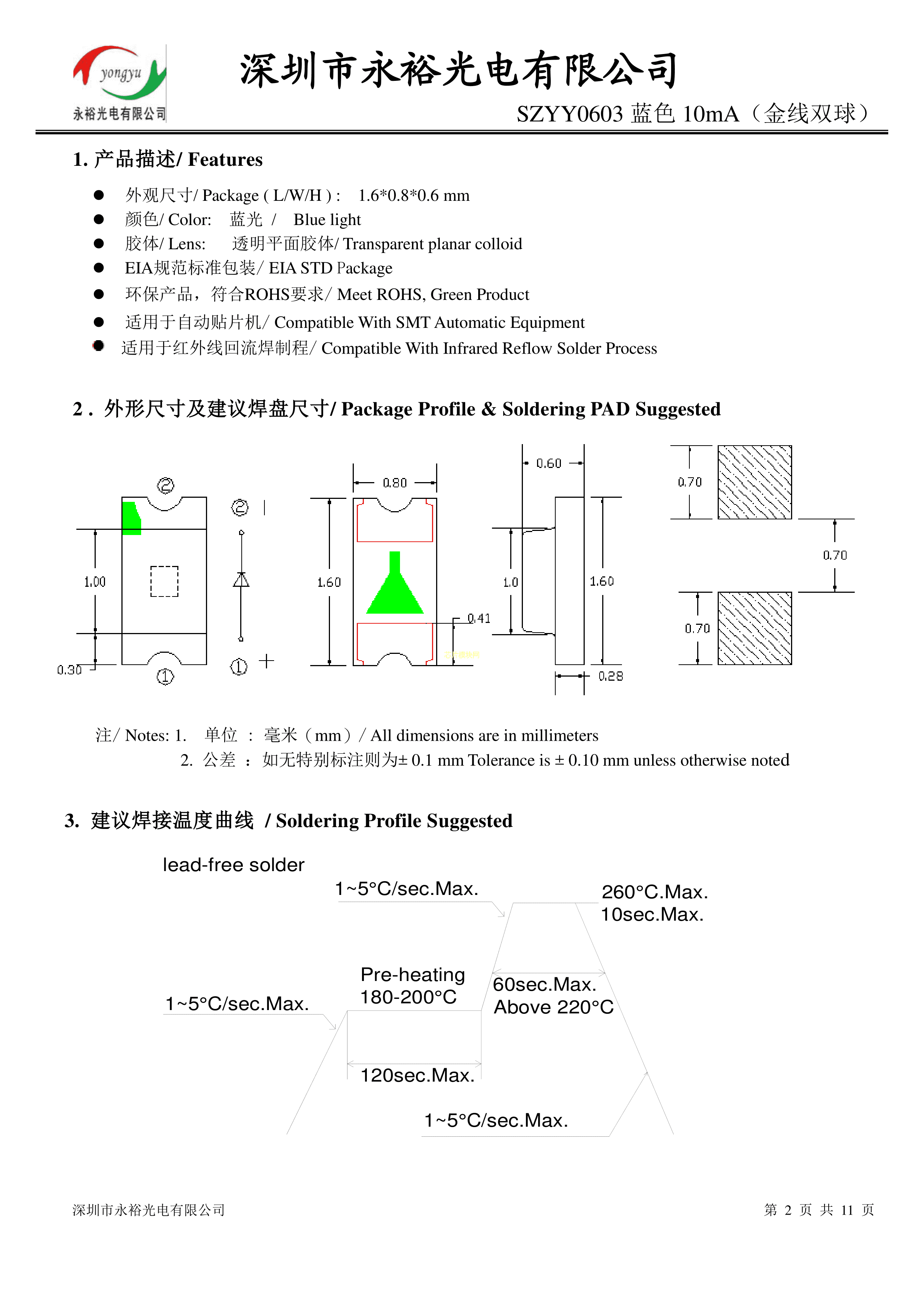 SZYY0603B数据手册0603封装yongyu(永裕光电)PDF规格书,中英文下载