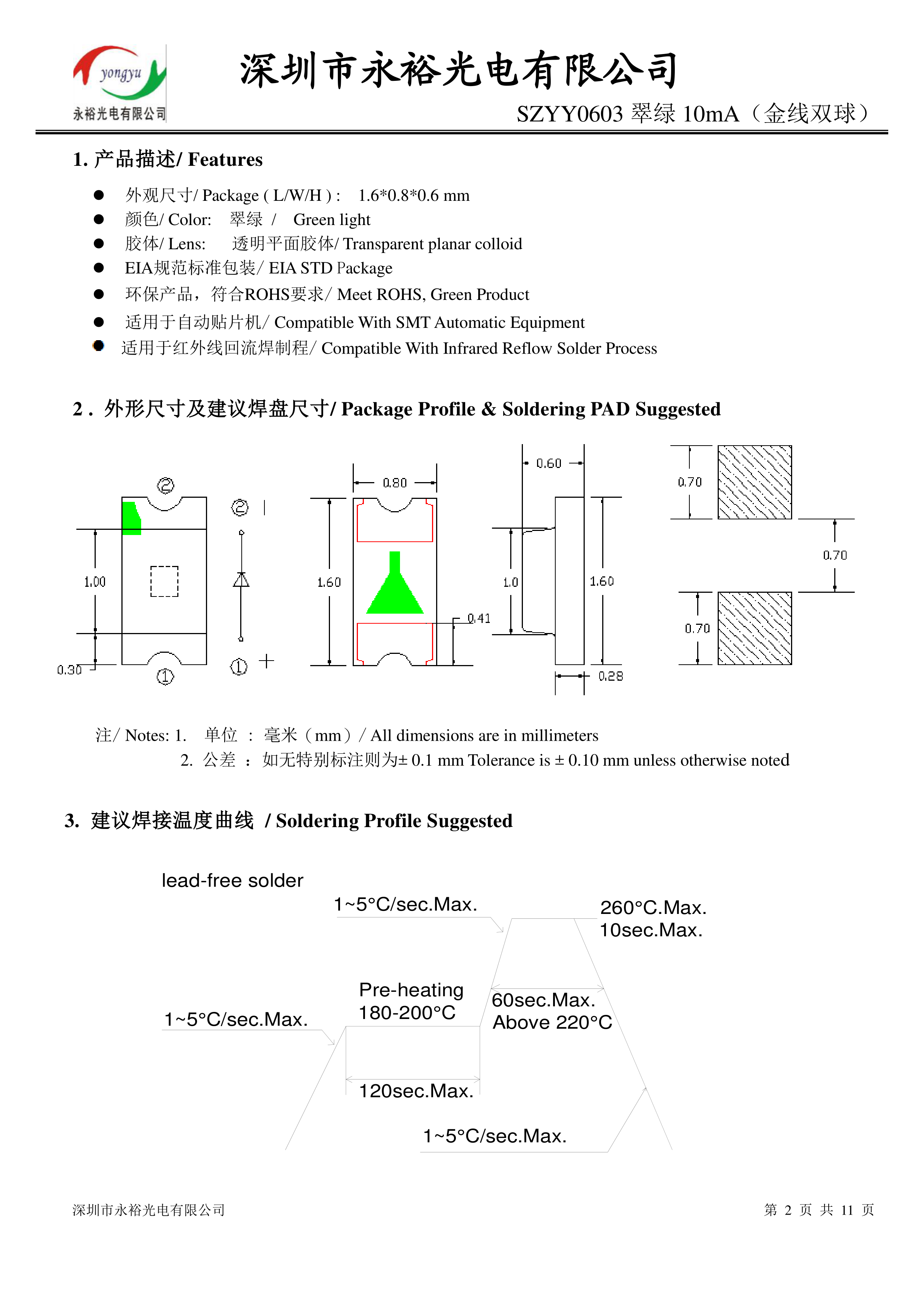 SZYY0603G数据手册0603封装yongyu(永裕光电)PDF规格书,中英文下载