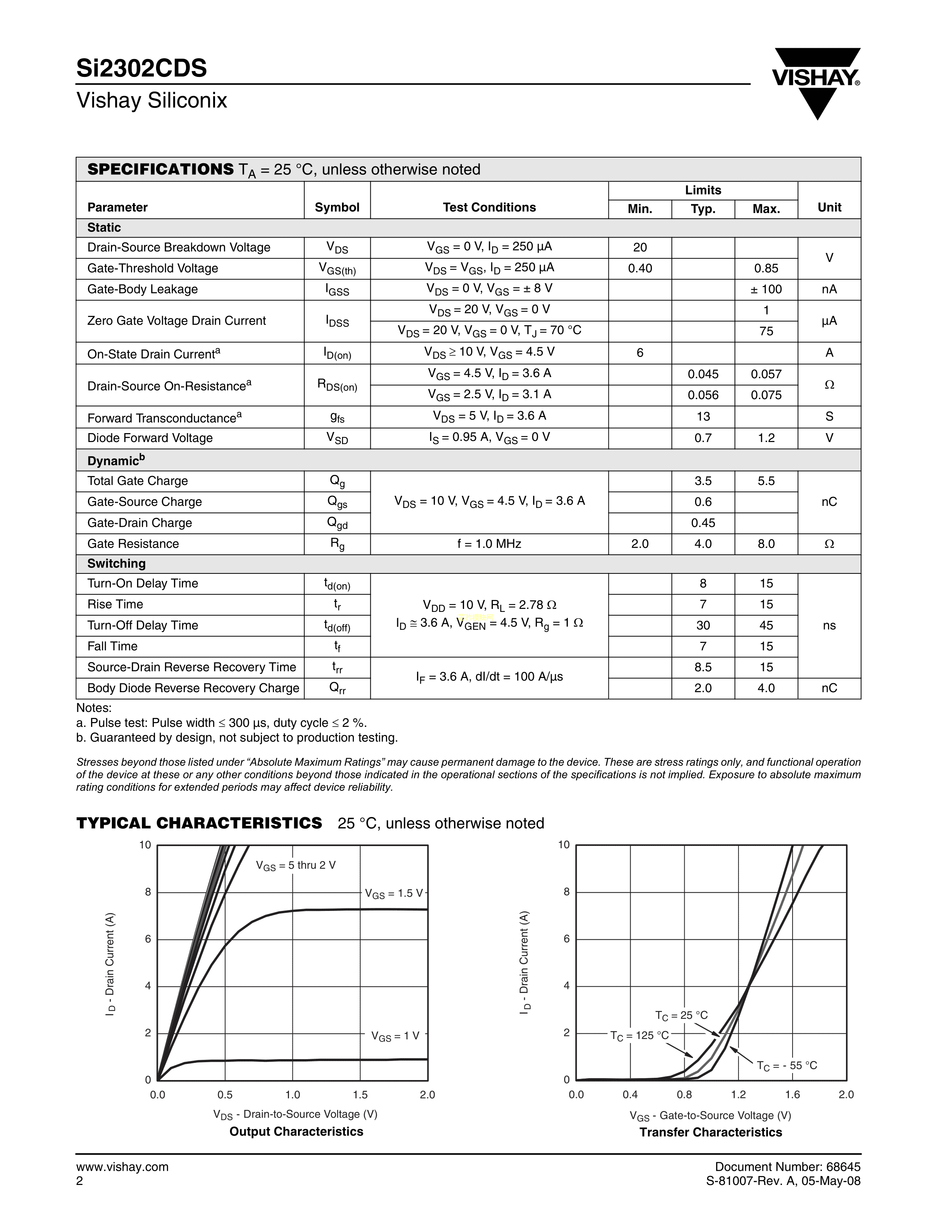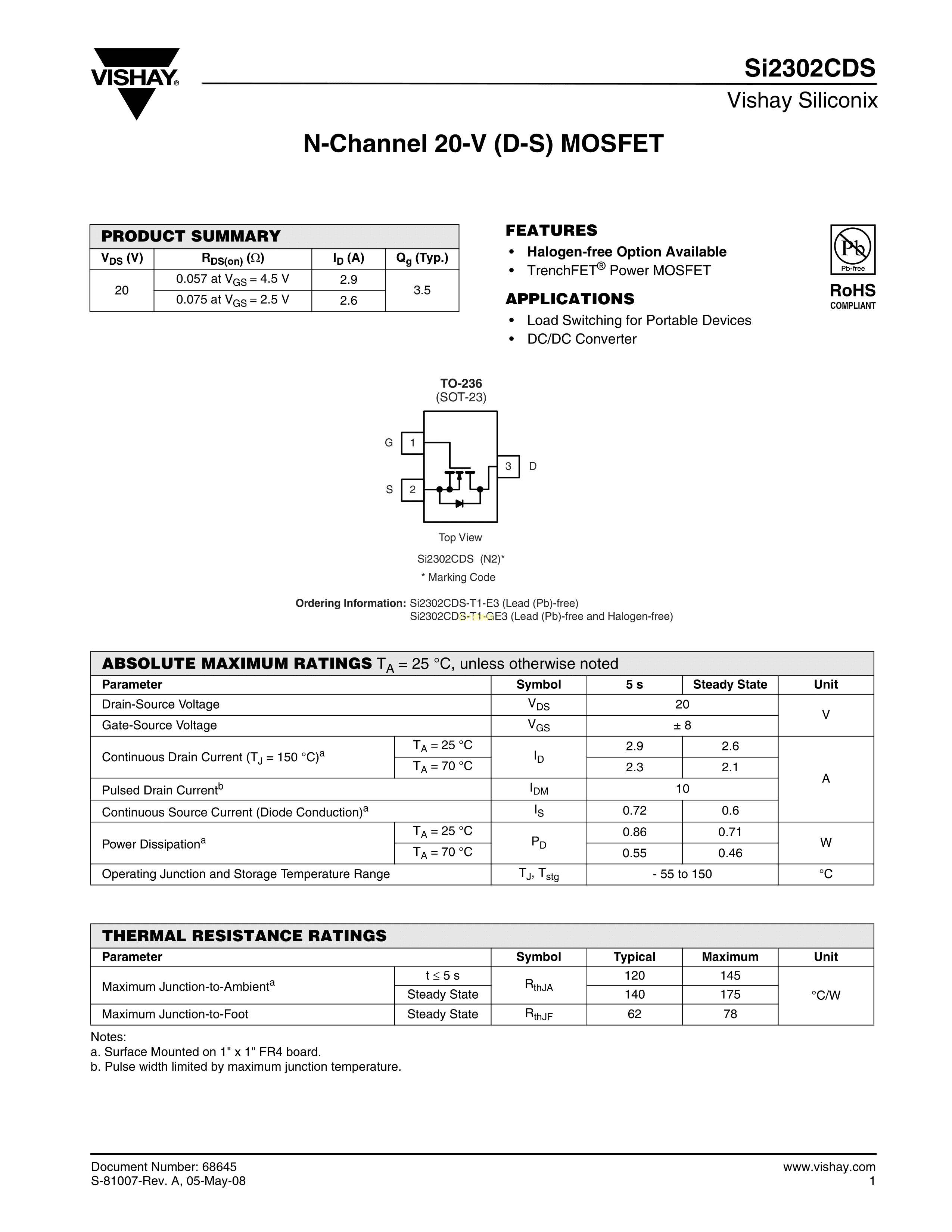 Si2302CDS-T1-GE3数据手册SOT-23(SOT-23-3)封装VISHAY(威世)PD