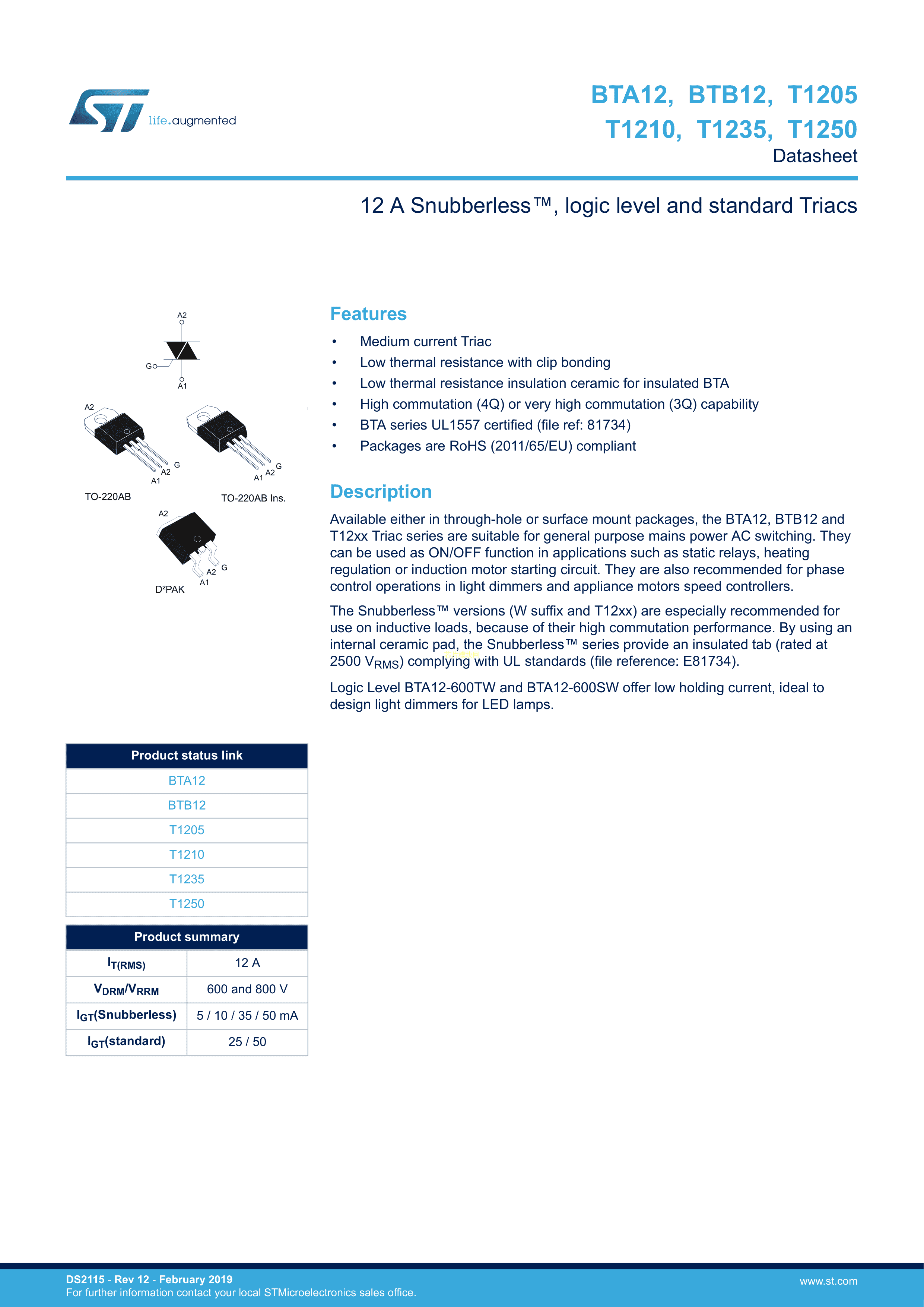 T1235-800G-TR数据手册D2PAK封装ST(意法半导体)PDF规格书,中英文下载