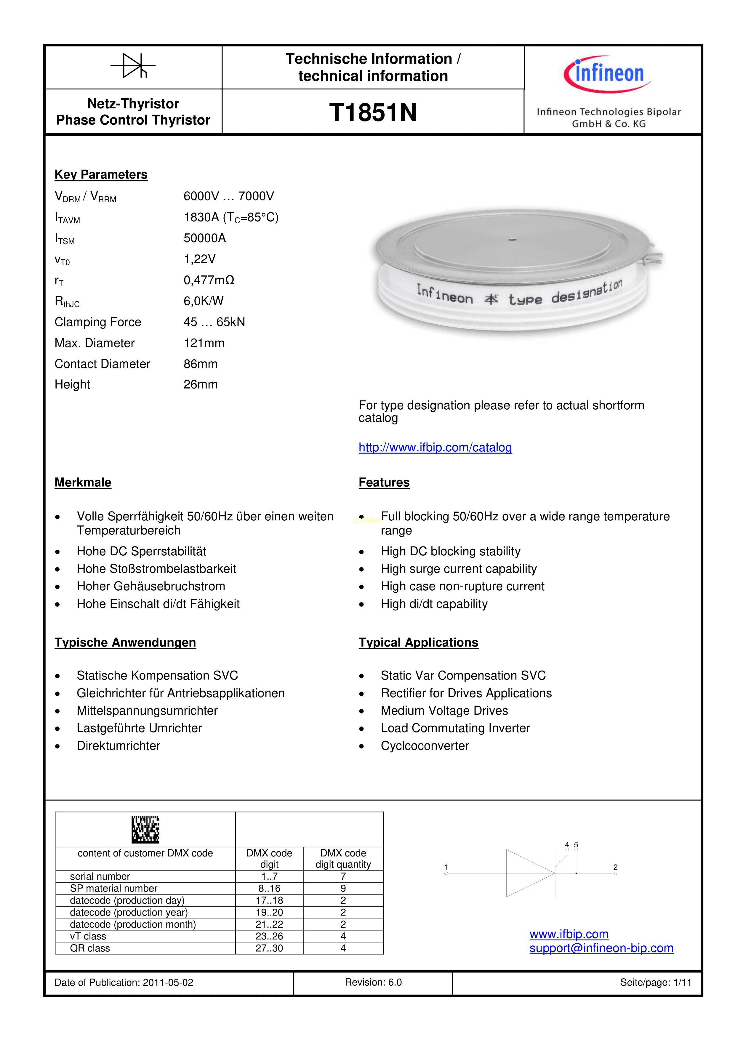 T1851N70TOH数据手册-封装Infineon(英飞凌)PDF规格书,中英文下载