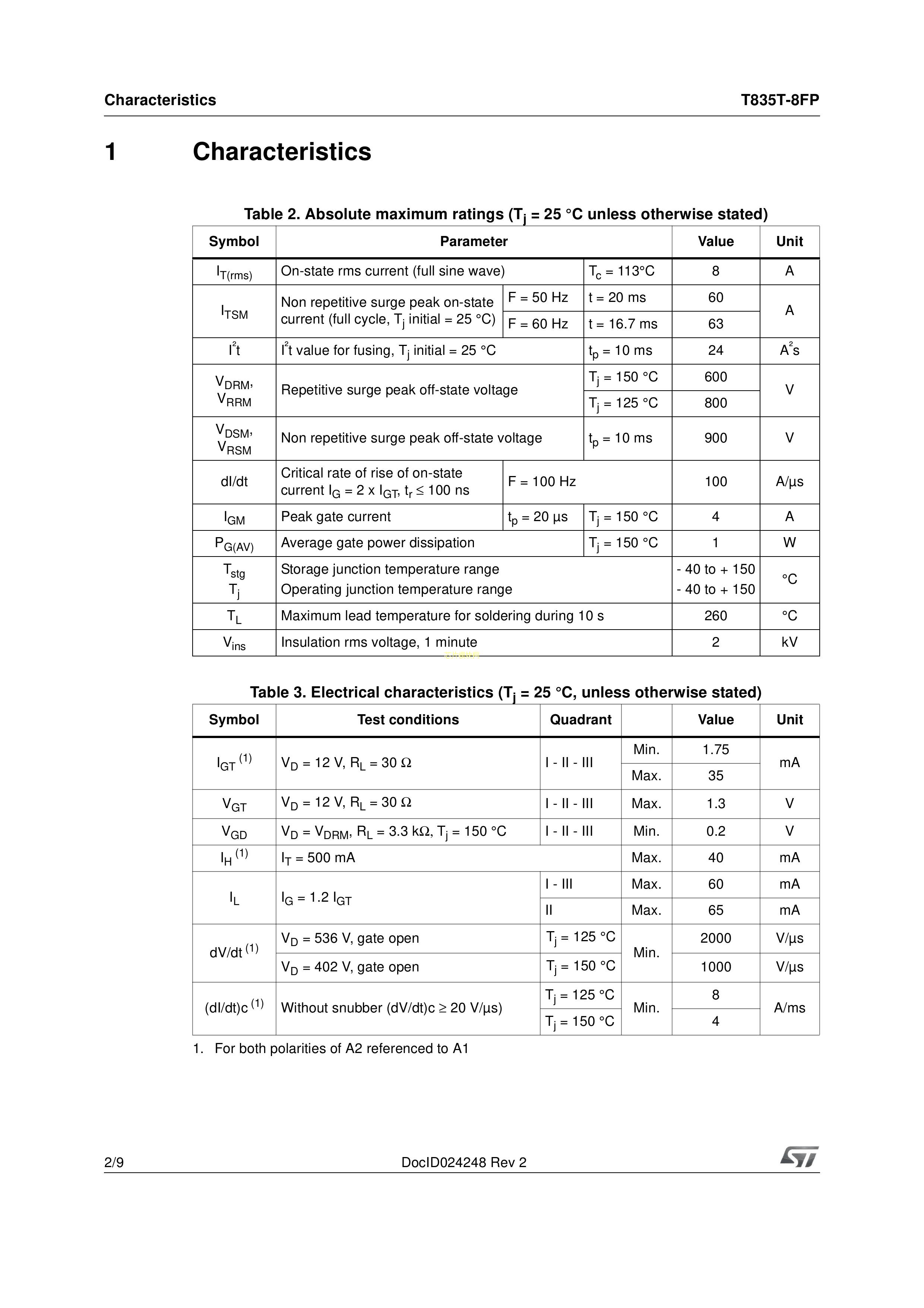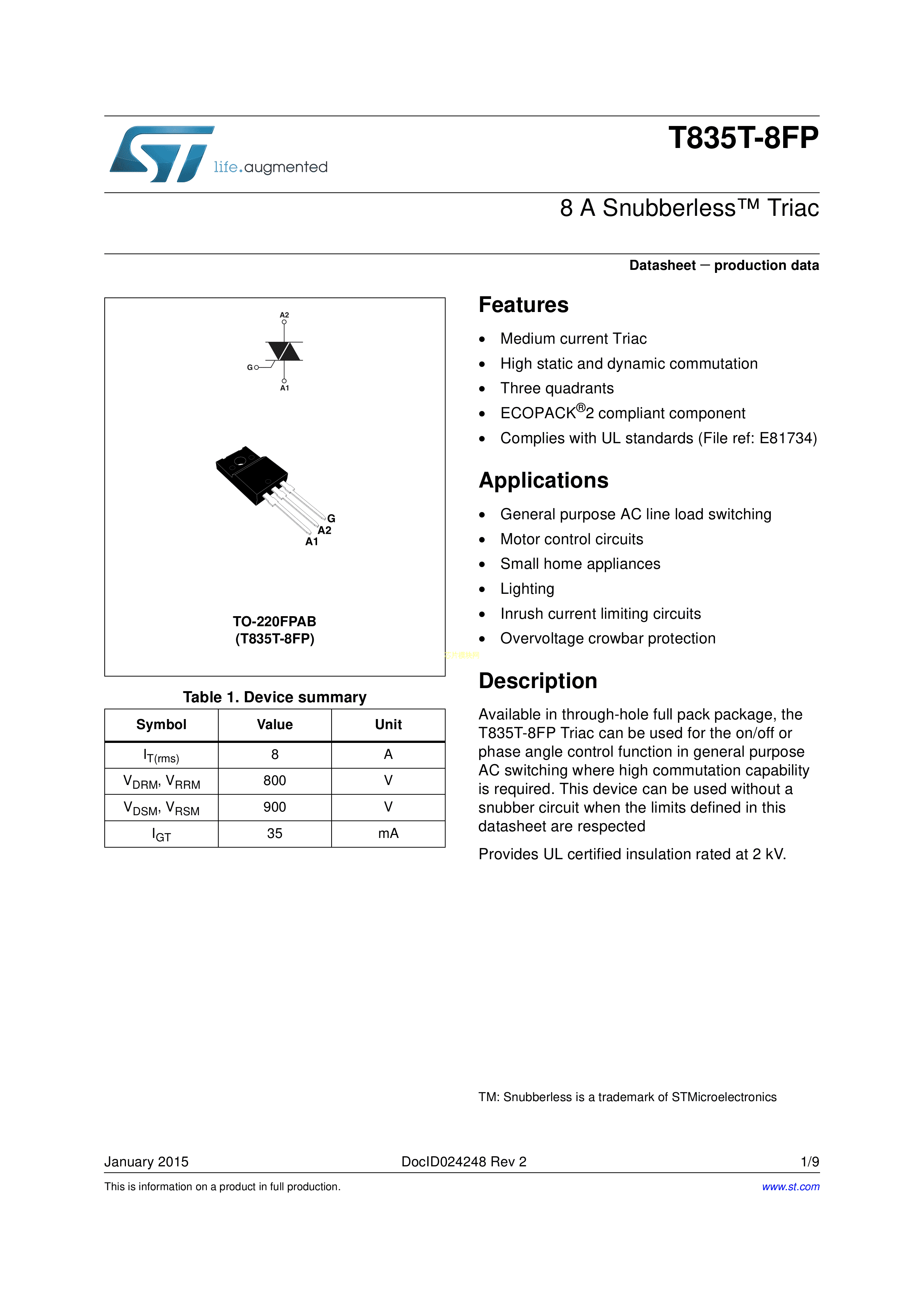 T835T-8FP数据手册TO-220FP封装ST(意法半导体)PDF规格书,中英文下载