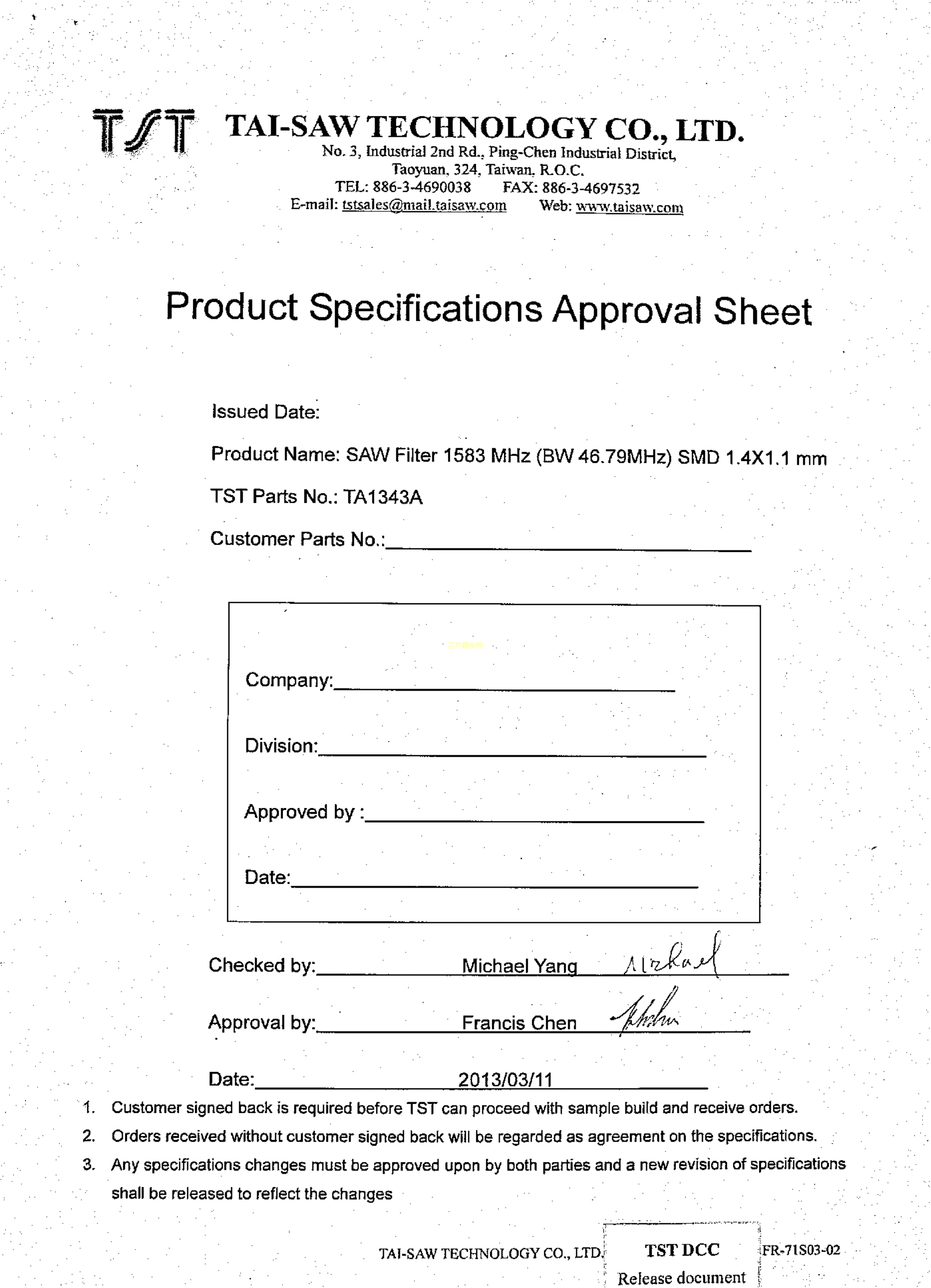 TA1343A-TR数据手册SMD1.4x1.1mm封装TST(台湾嘉硕)PDF规格书,中英文下载