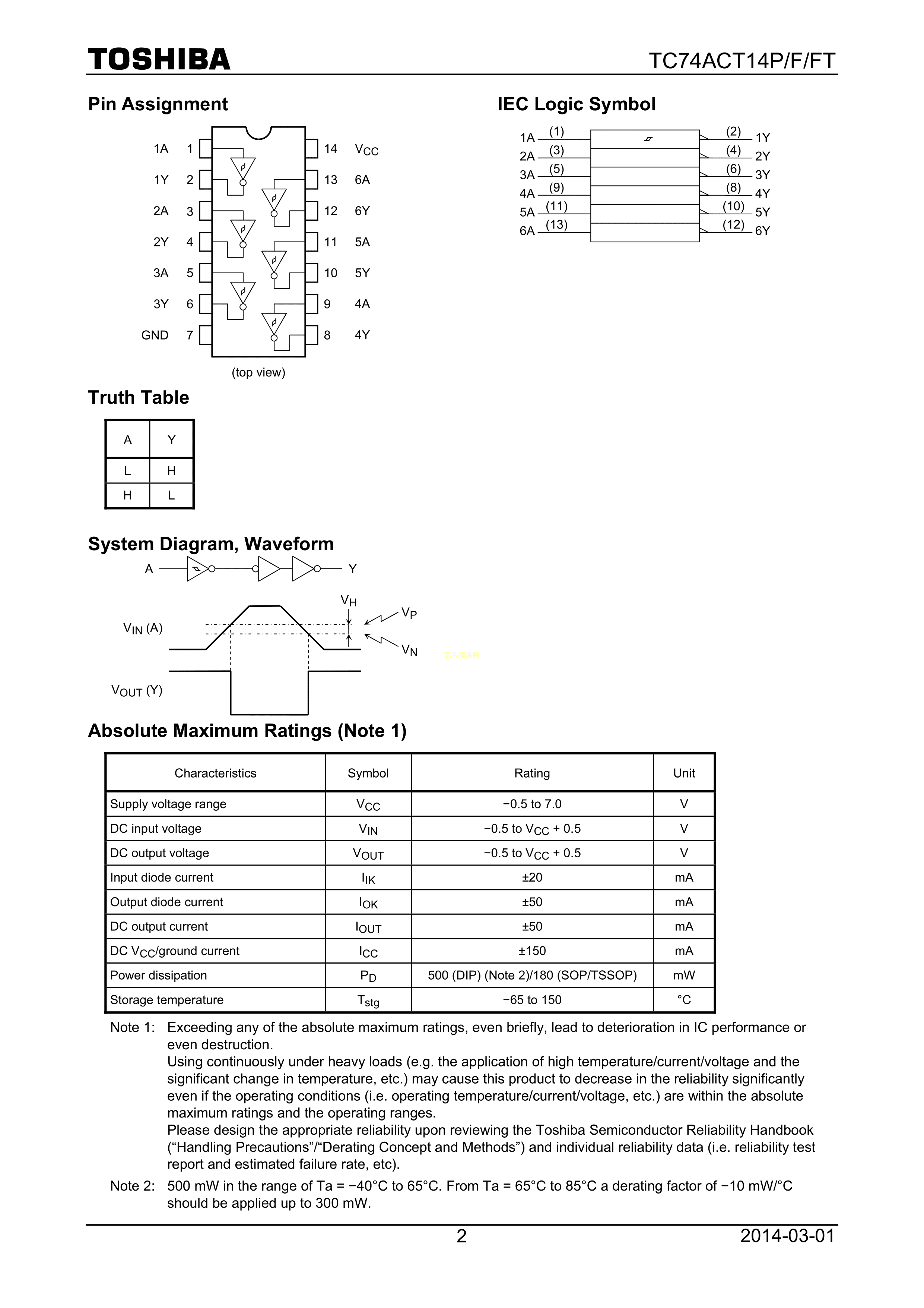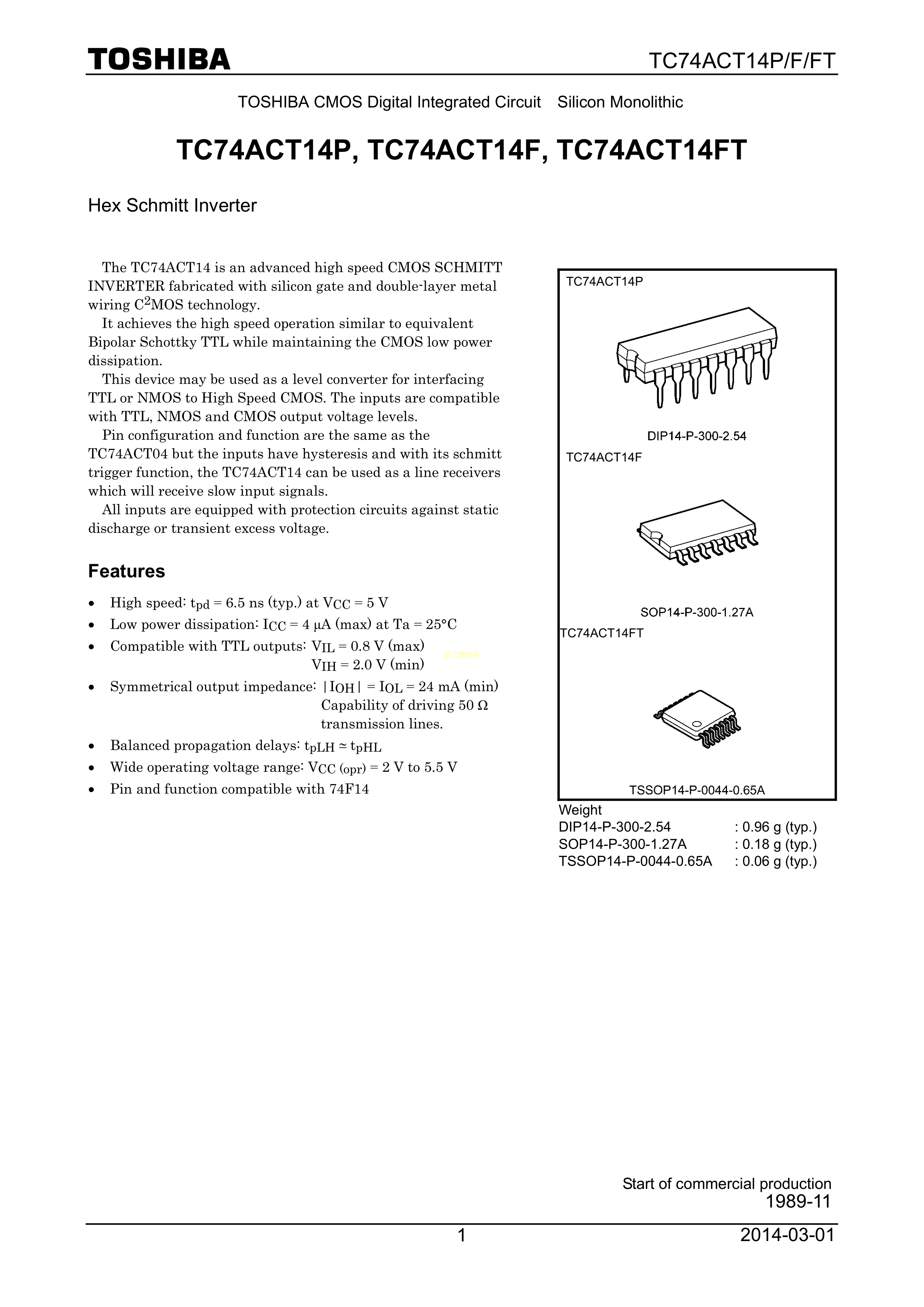 TC74ACT14FT(EL)数据手册TSSOP-14封装TOSHIBA(东芝)PDF规格书,中英文