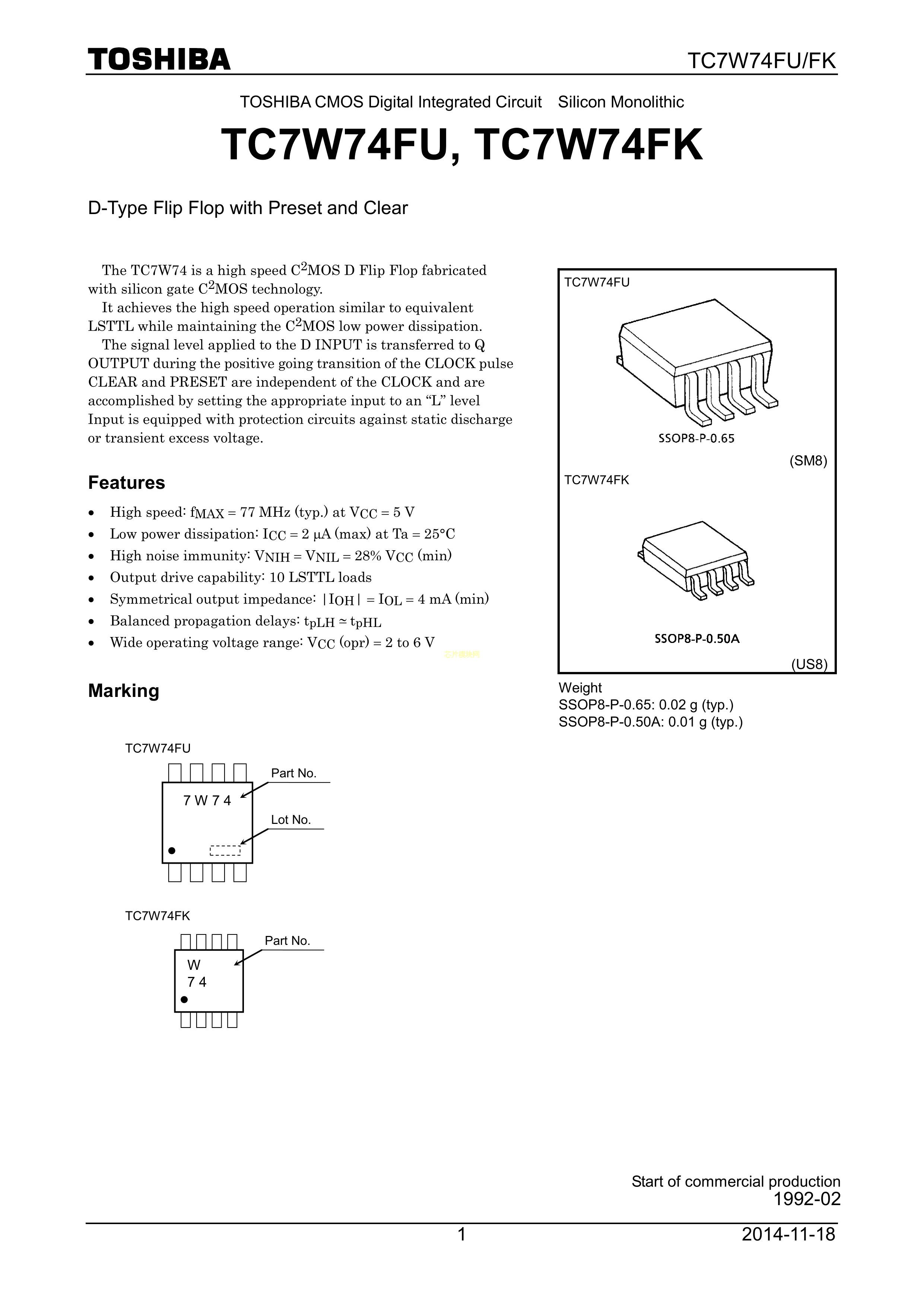 TC7W74FKLF数据手册US8封装TOSHIBA(东芝)PDF规格书,中英文下载
