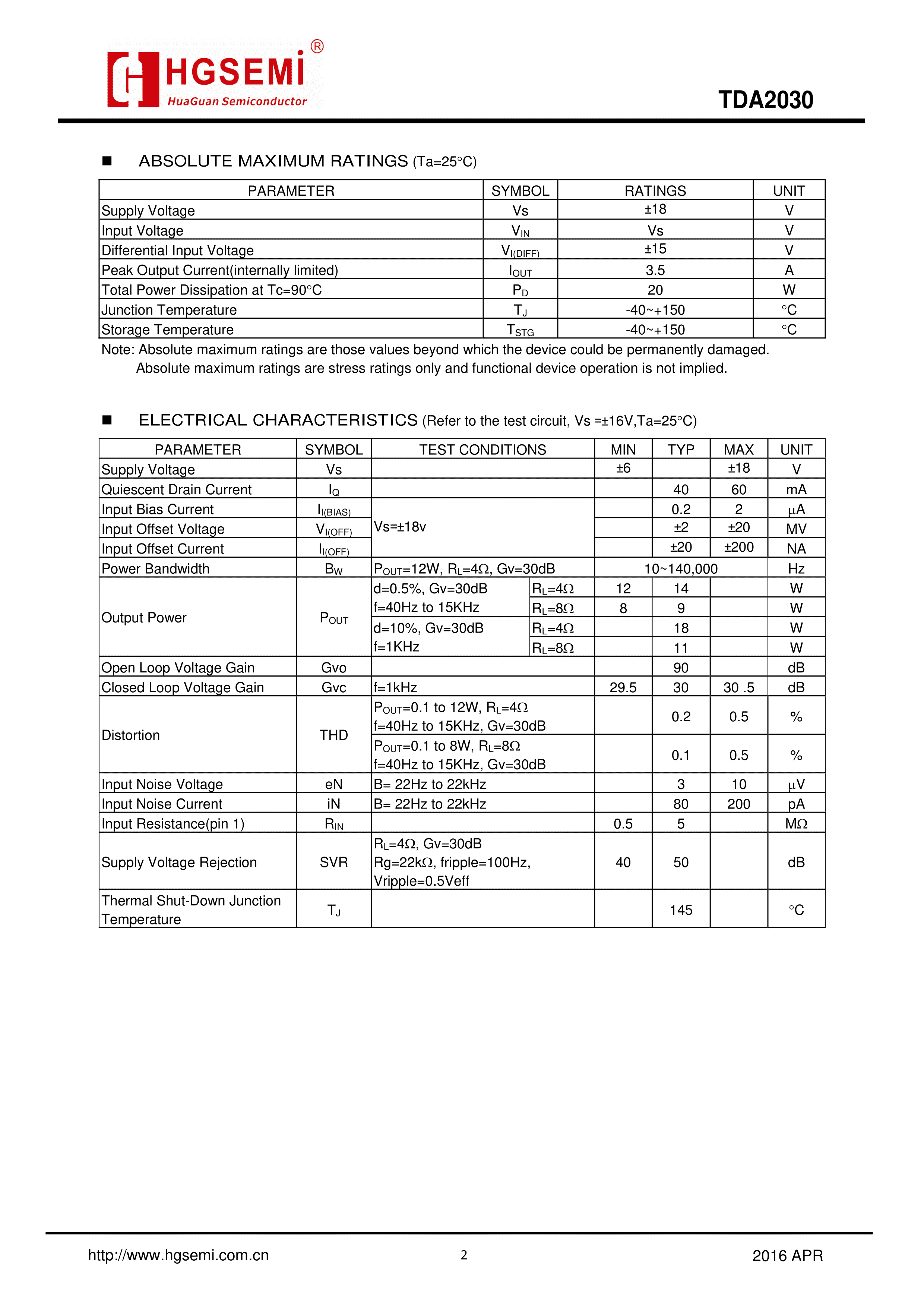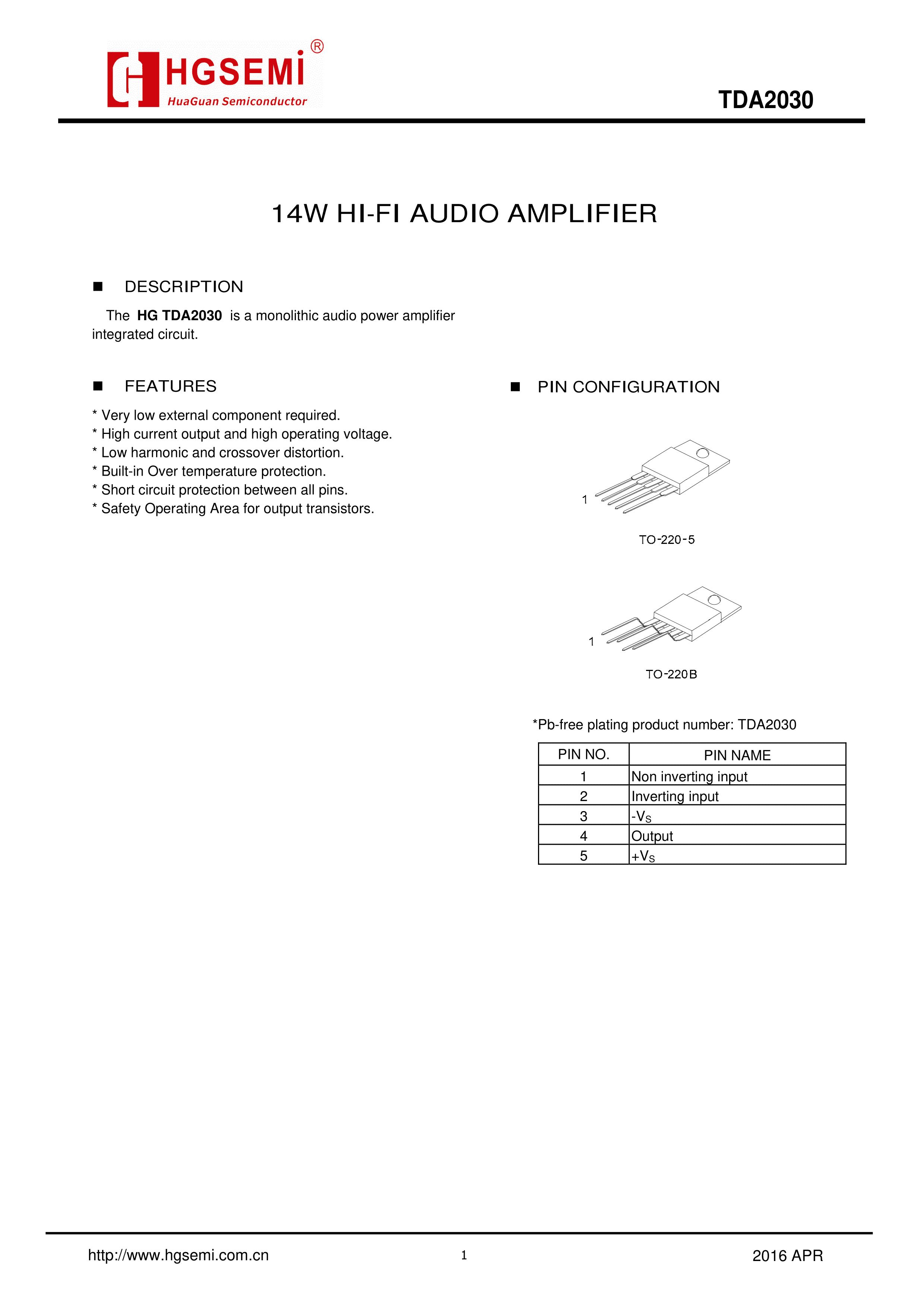TDA2030数据手册TO-220-5B封装HGSEMI(华冠)PDF规格书,中英文下载