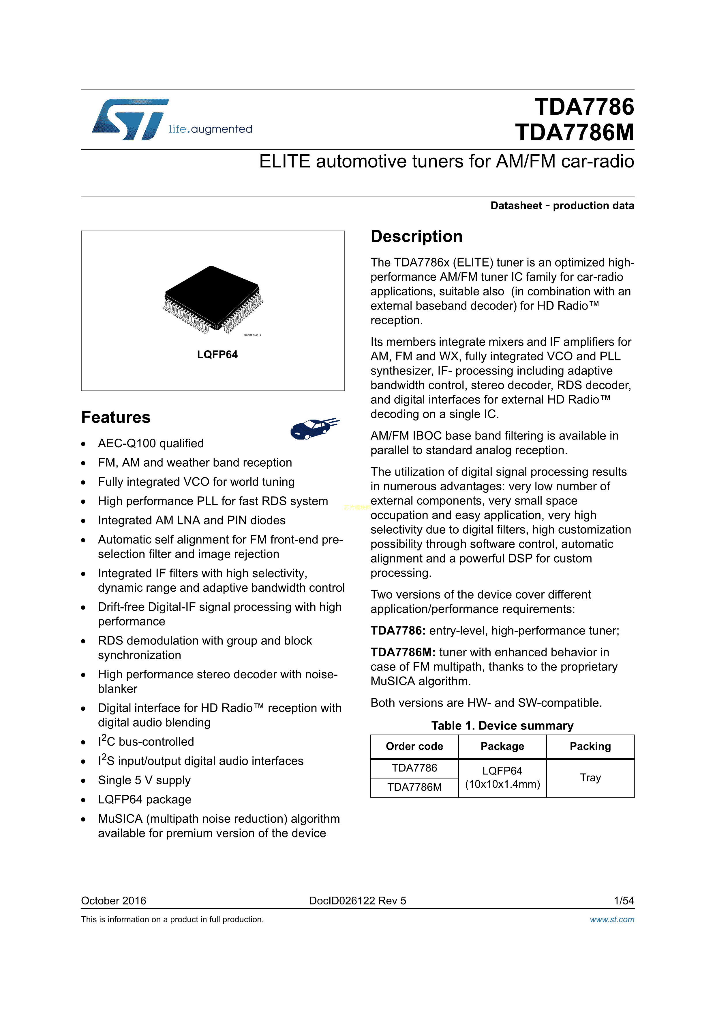TDA7786MTR数据手册LQFP-64(10x10)封装ST(意法半导体)PDF规格书,中英文下