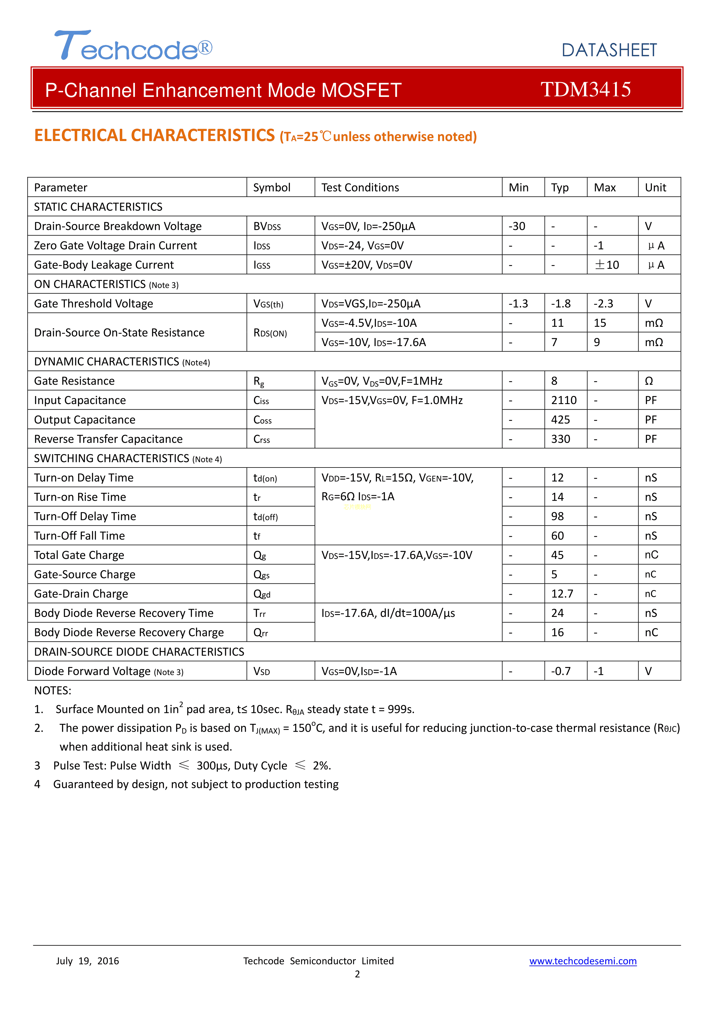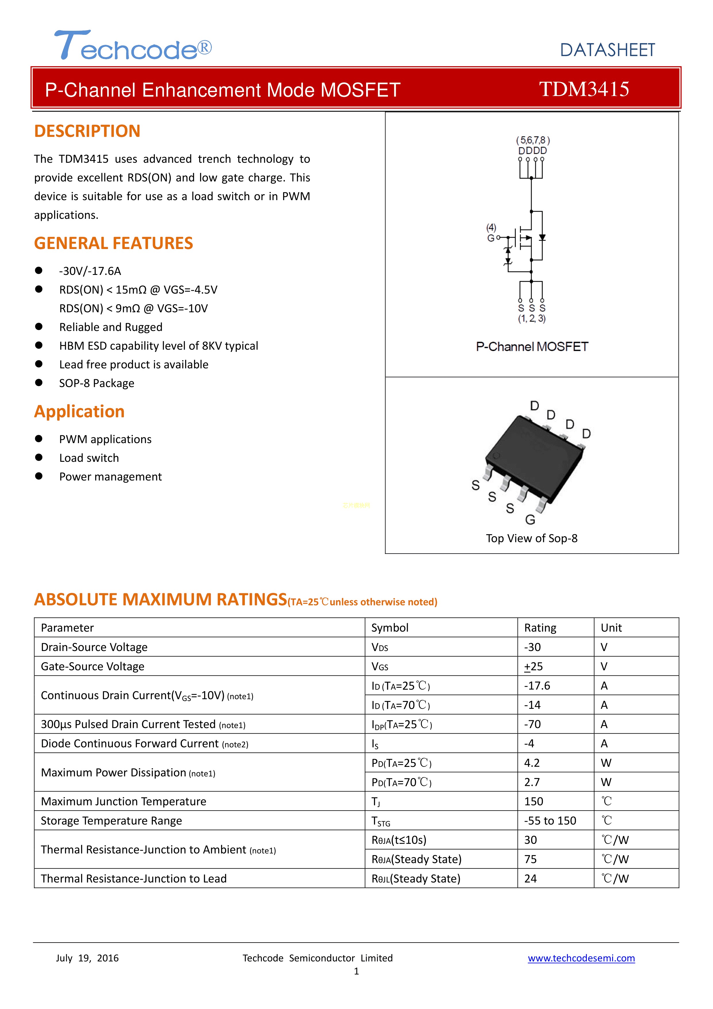 TDM3415数据手册SOP-8_150mil封装Techcode(泰德)PDF规格书,中英文下载