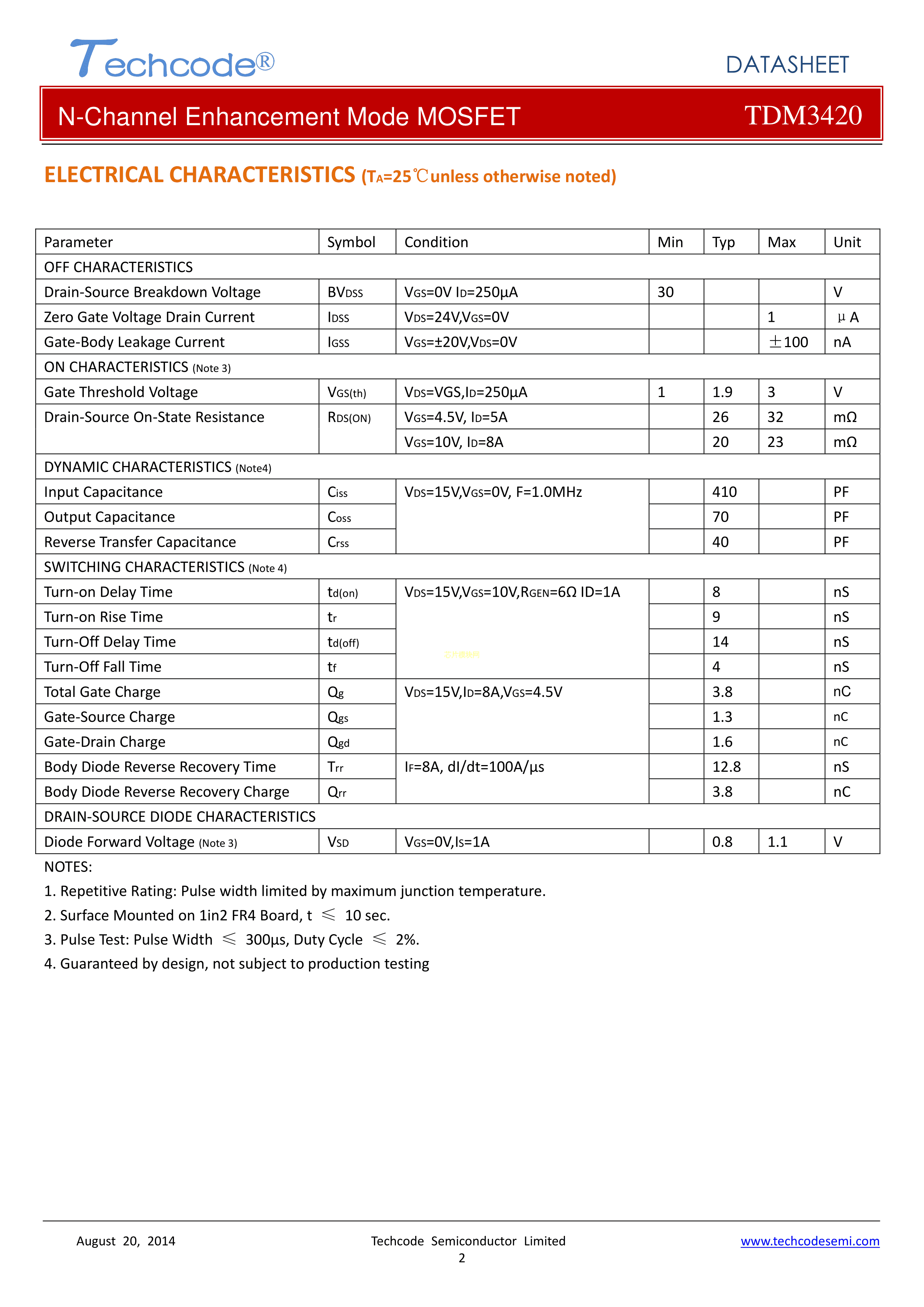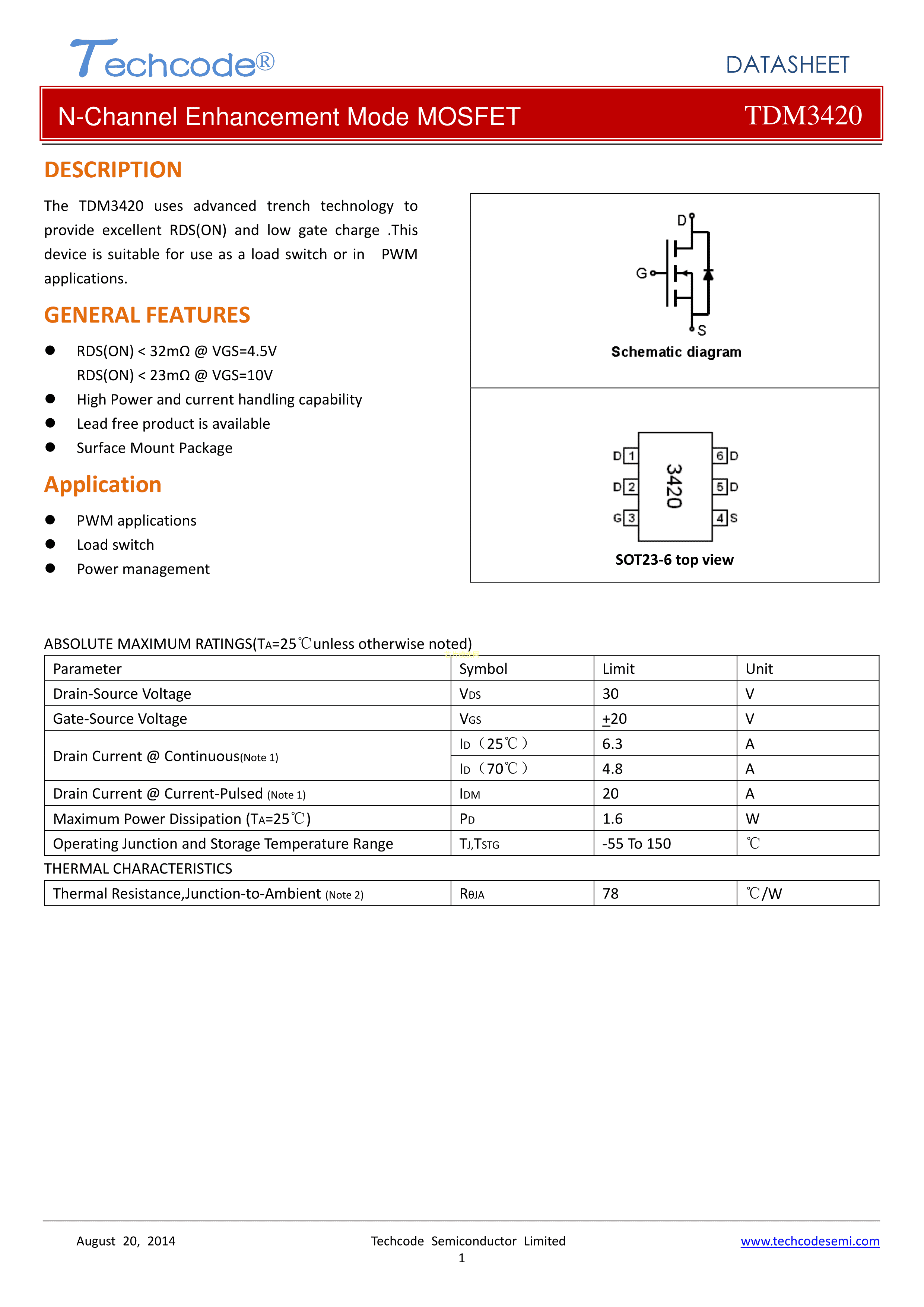 TDM3420TR数据手册SOT-23-6封装Techcode(泰德)PDF规格书,中英文下载