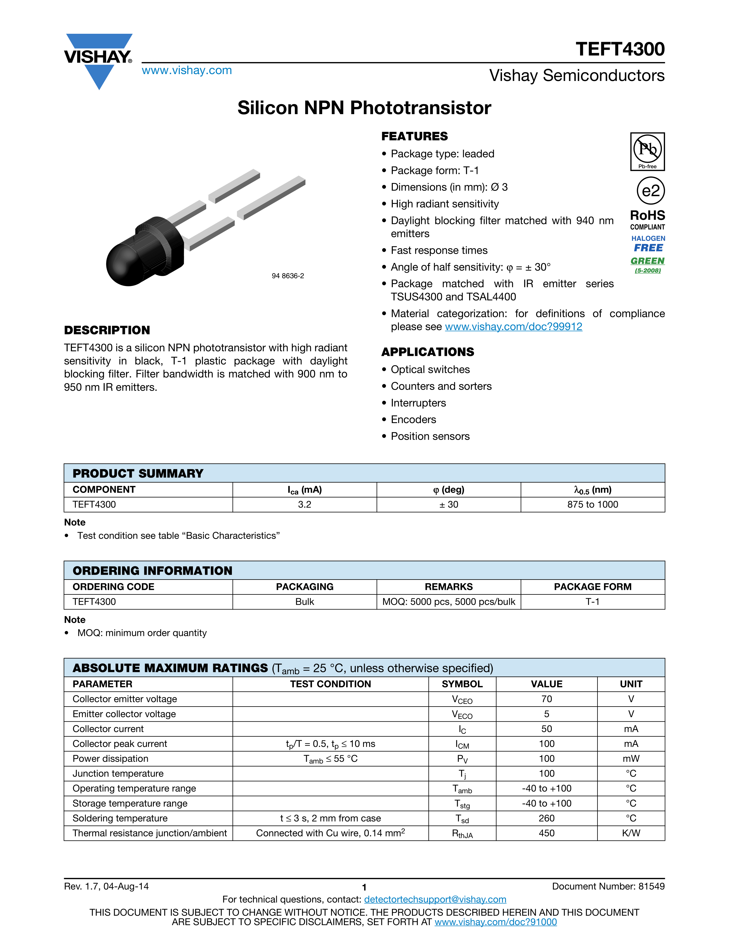TEFT4300数据手册Through Hole封装VISHAY(威世)PDF规格书,中英文下载