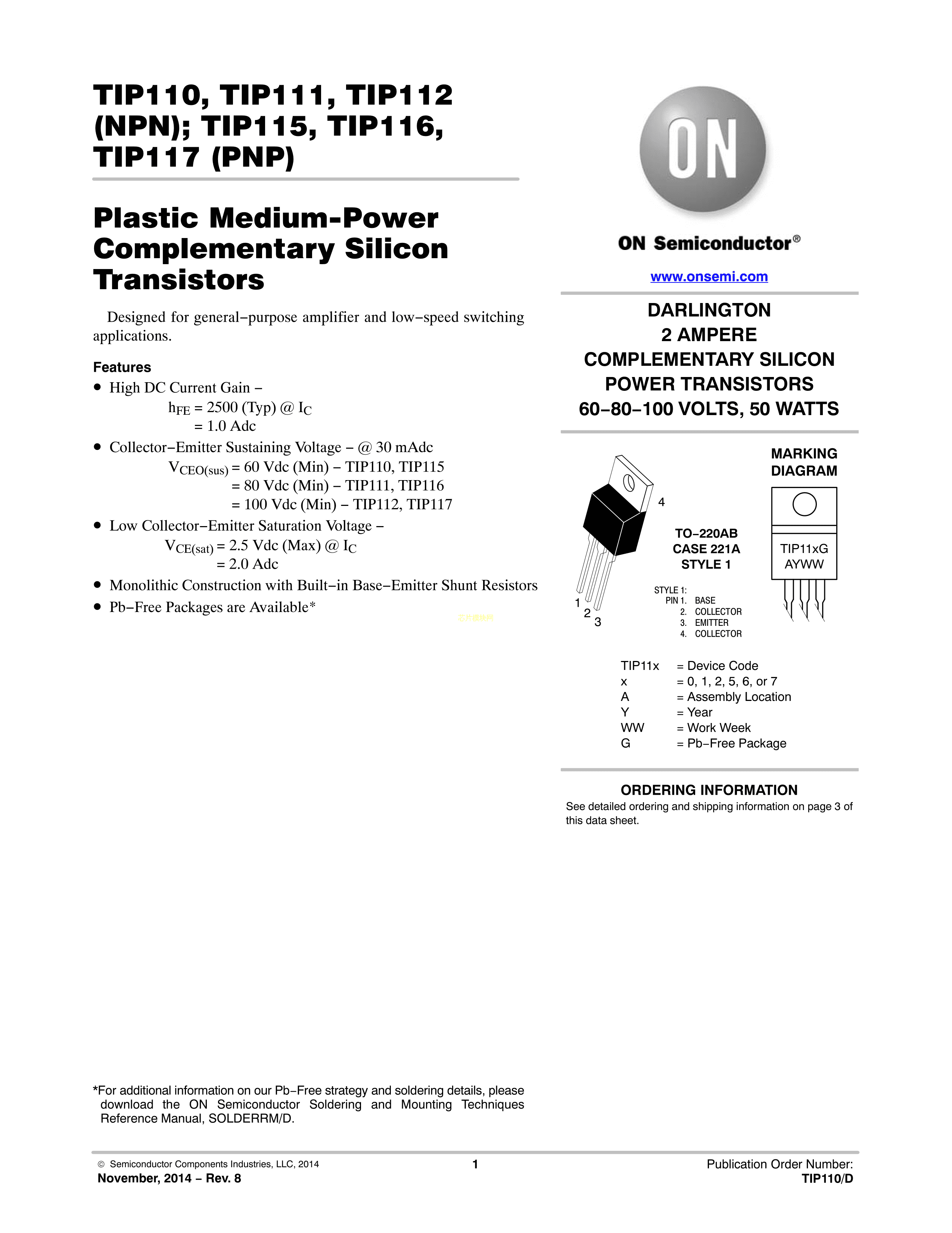 TIP110G数据手册TO-220(TO-220-3)封装onsemi(安森美)PDF规格书,中英文下载