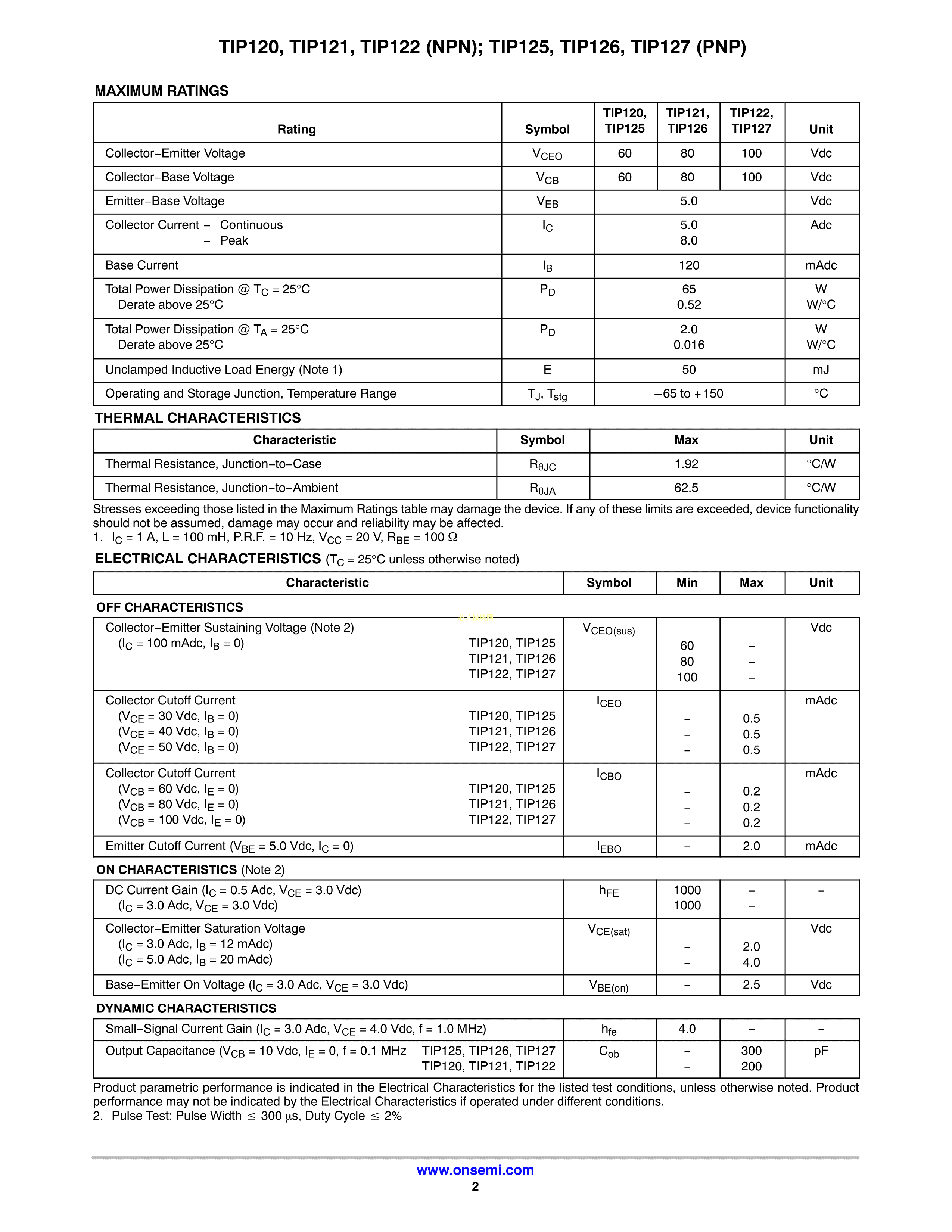 TIP121G数据手册TO-220(TO-220-3)封装onsemi(安森美)PDF规格书,中英文下载