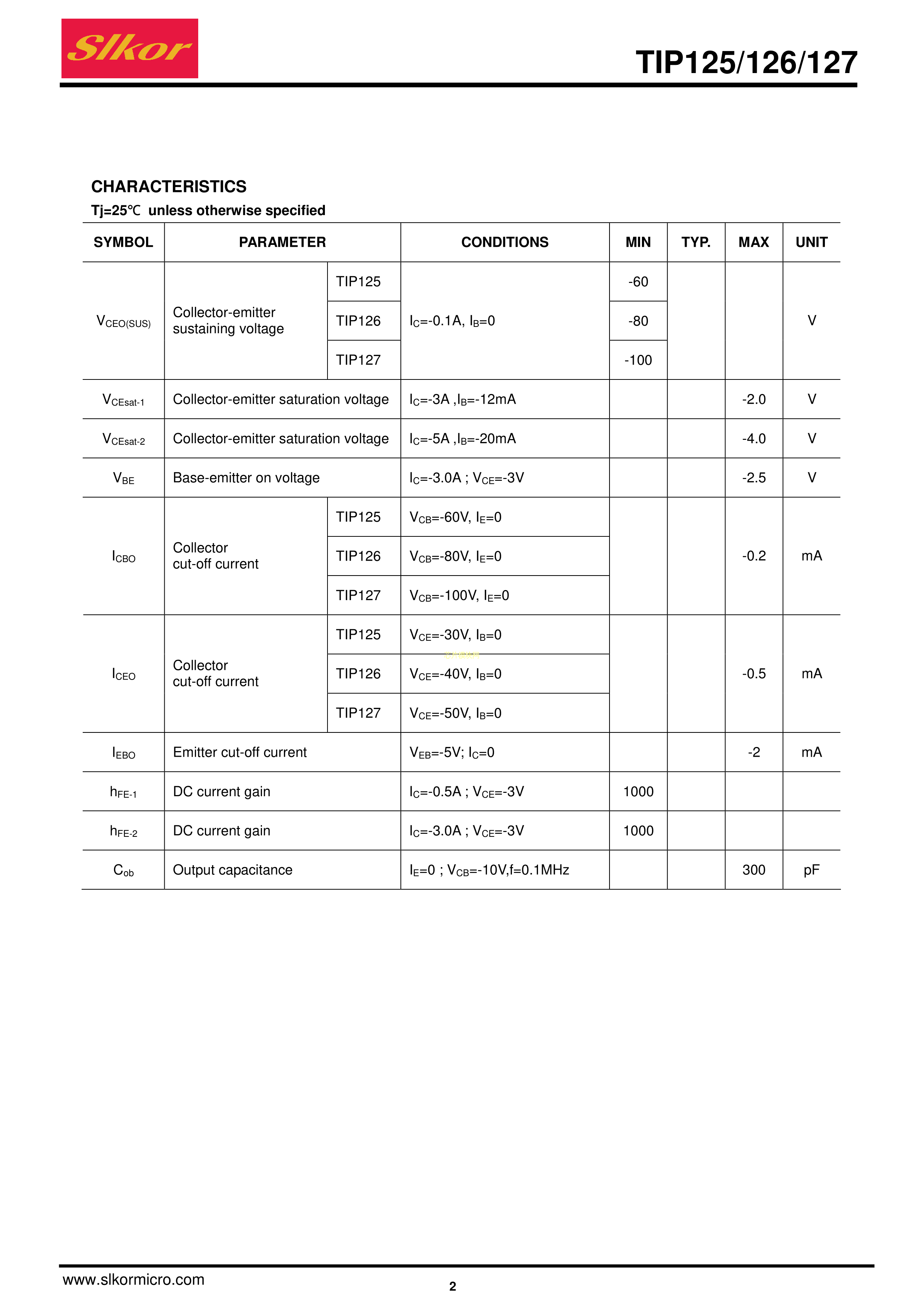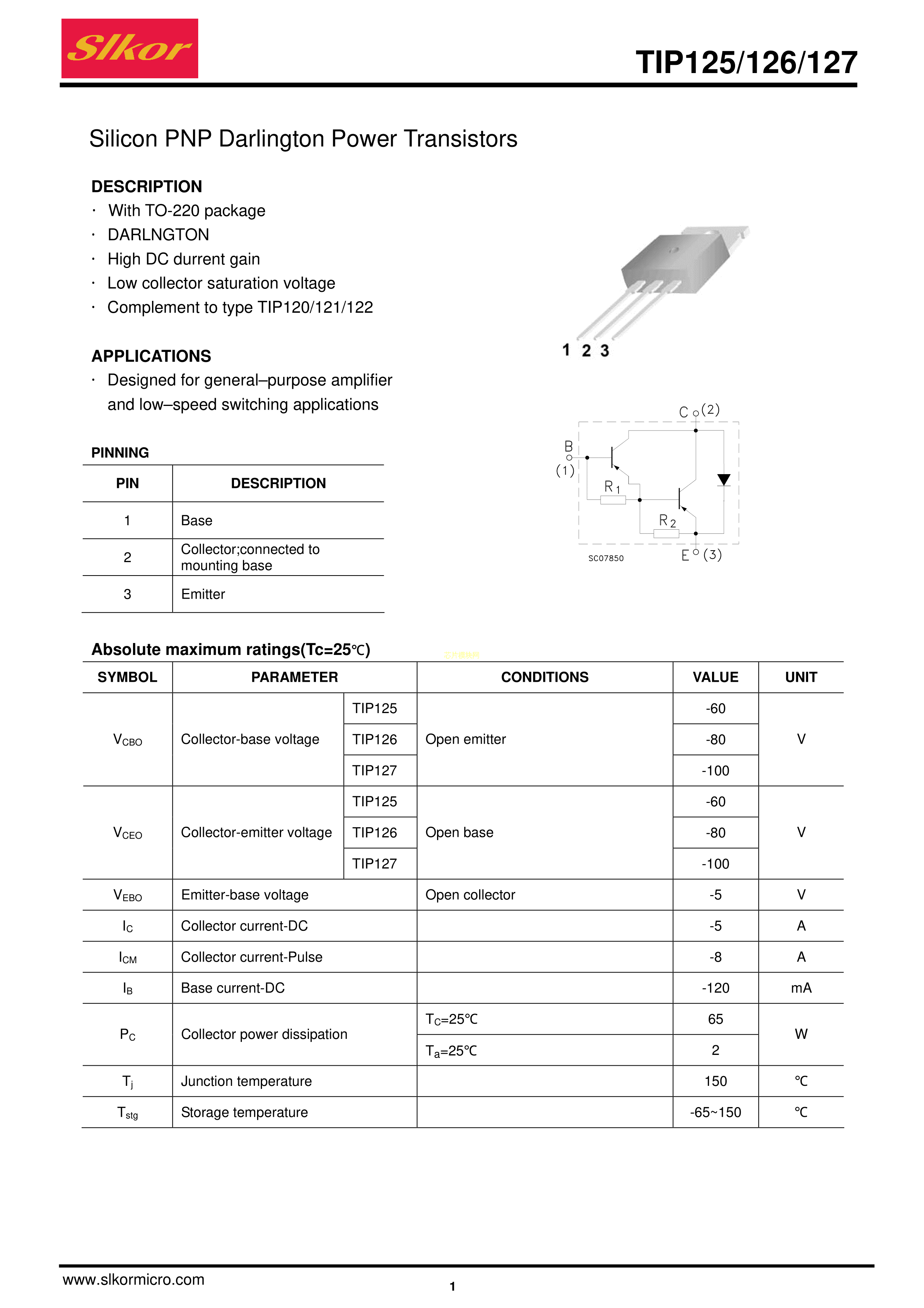 TIP127数据手册TO-220封装Slkor(萨科微)PDF规格书,中英文下载