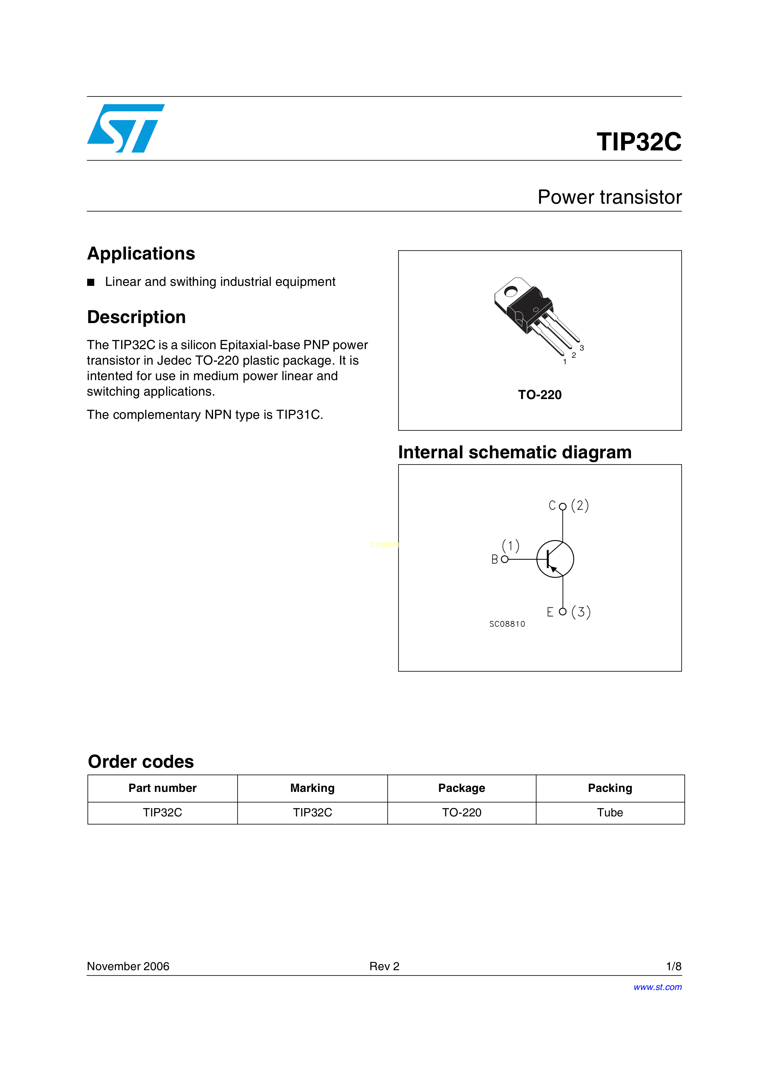 TIP32C数据手册TO-220(TO-220-3)封装ST(意法半导体)PDF规格书,中英文下载