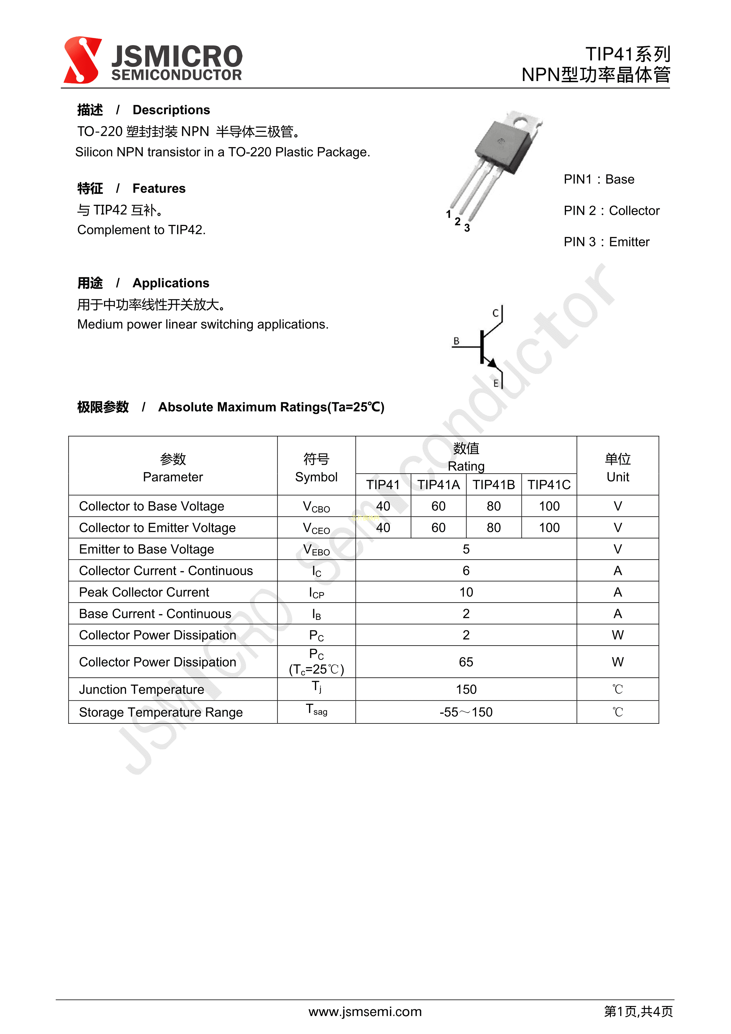 TIP41C数据手册TO-220封装JSMSEMI(杰盛微)PDF规格书,中英文下载
