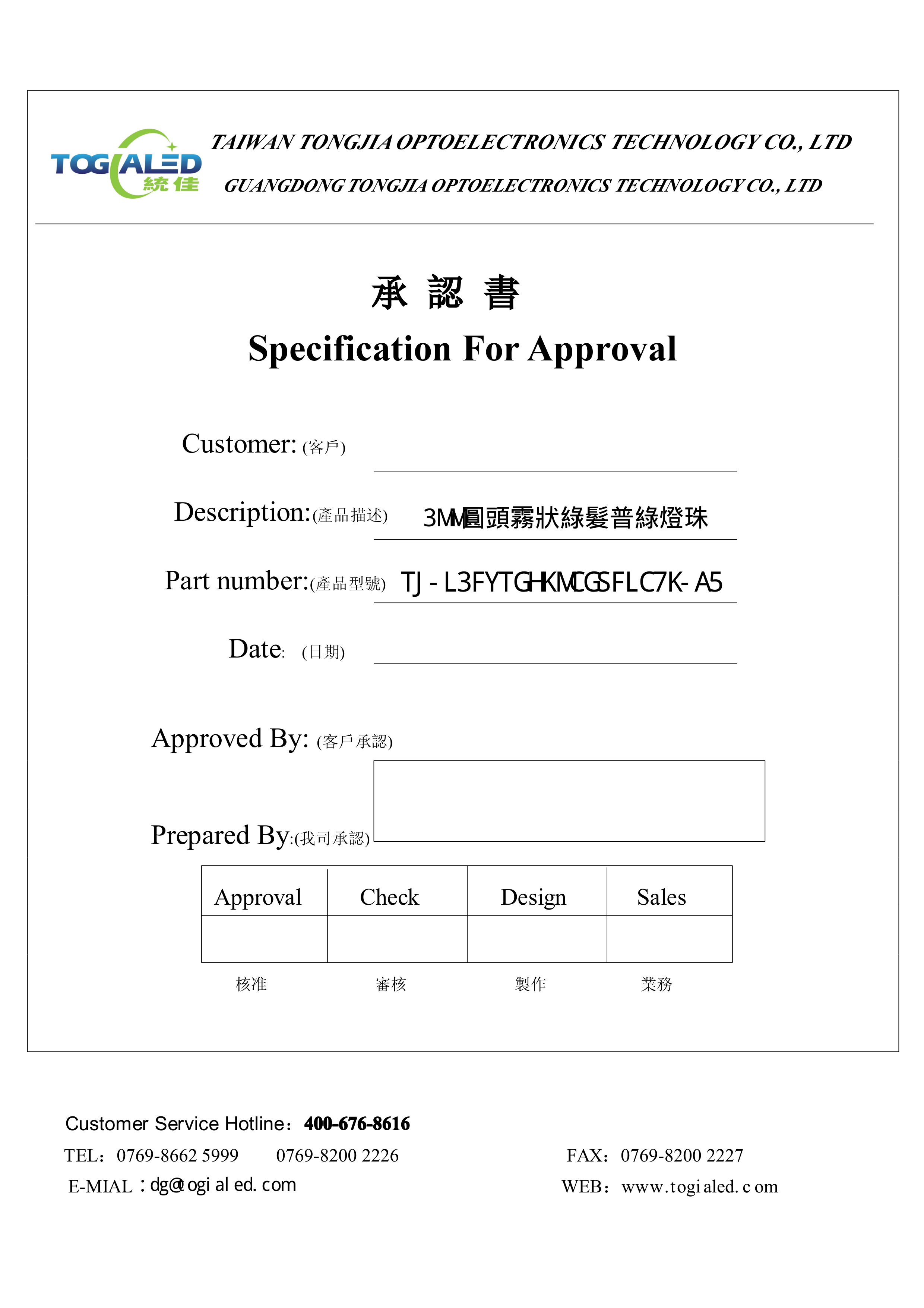 TJ-L3FYTGHKMCGSFLC7K-A5数据手册插件封装TOGIALED(台湾统佳)PDF规格