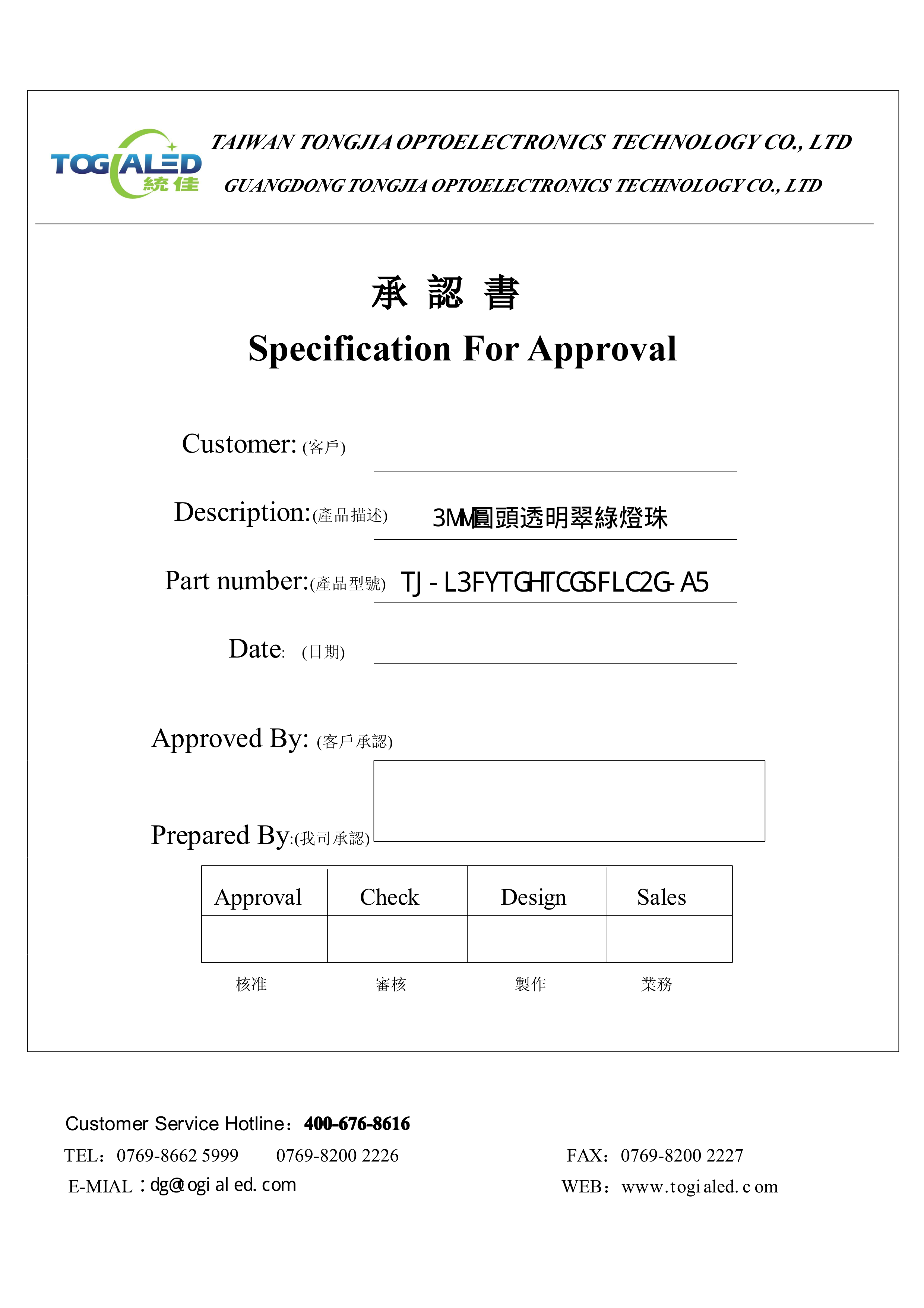 TJ-L3FYTGHTCGSFLC2G-A5数据手册插件封装TOGIALED(台湾统佳)PDF规格书