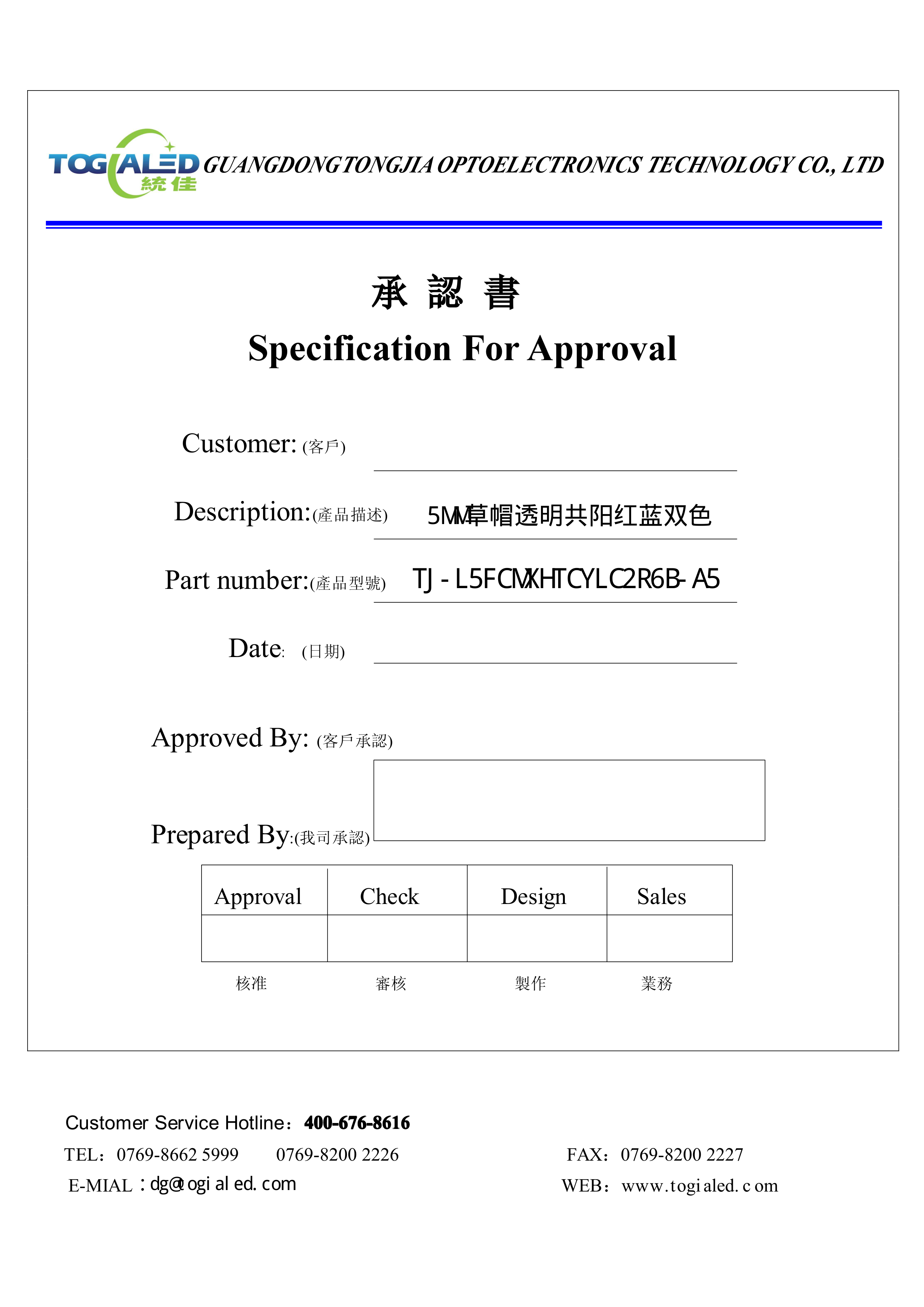 TJ-L5FCMXHTCYLC2R6B-A5数据手册插件封装TOGIALED(台湾统佳)PDF规格书
