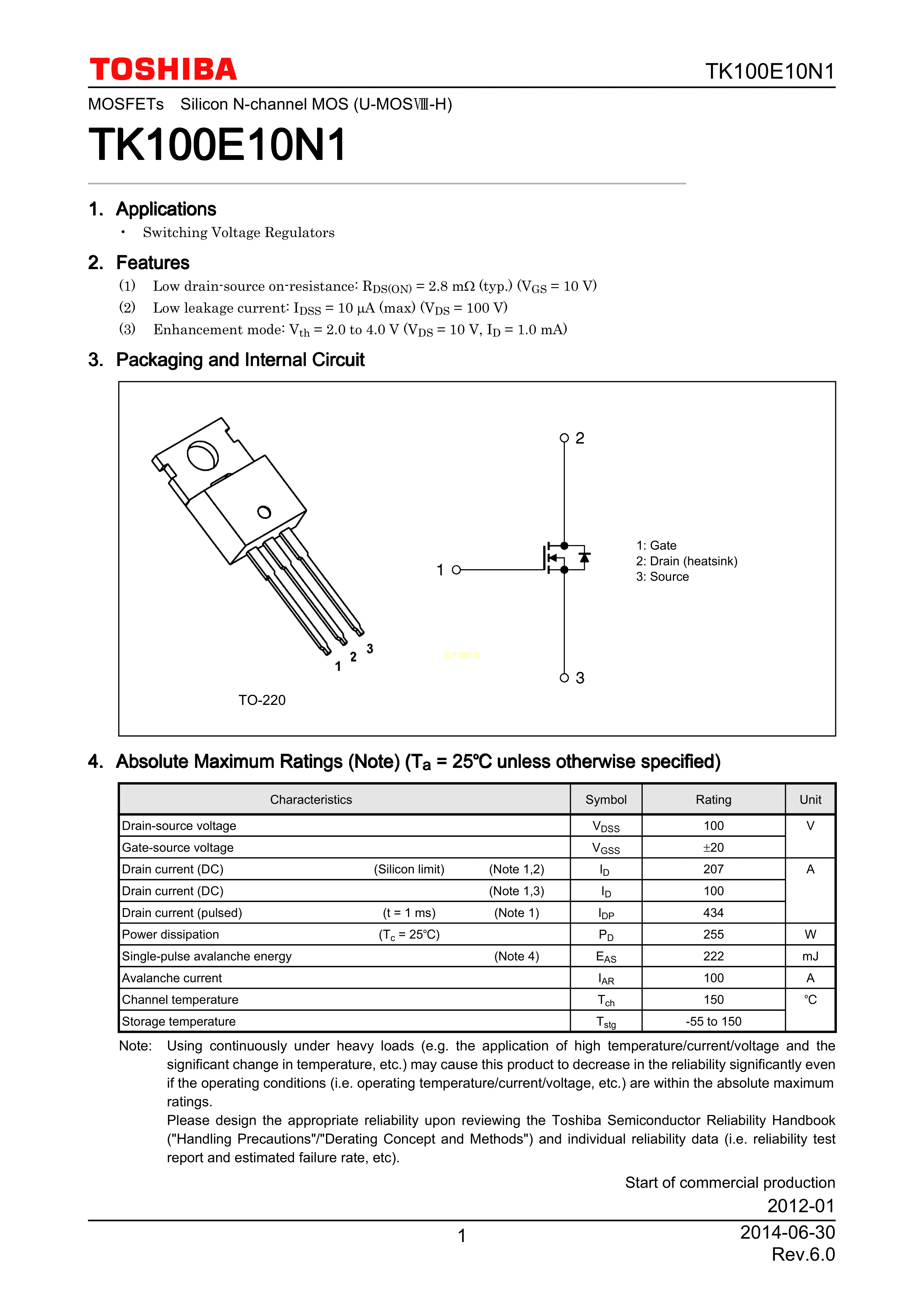 TK100E10N1S1X(S数据手册TO-220封装TOSHIBA(东芝)PDF规格书,中英文下载