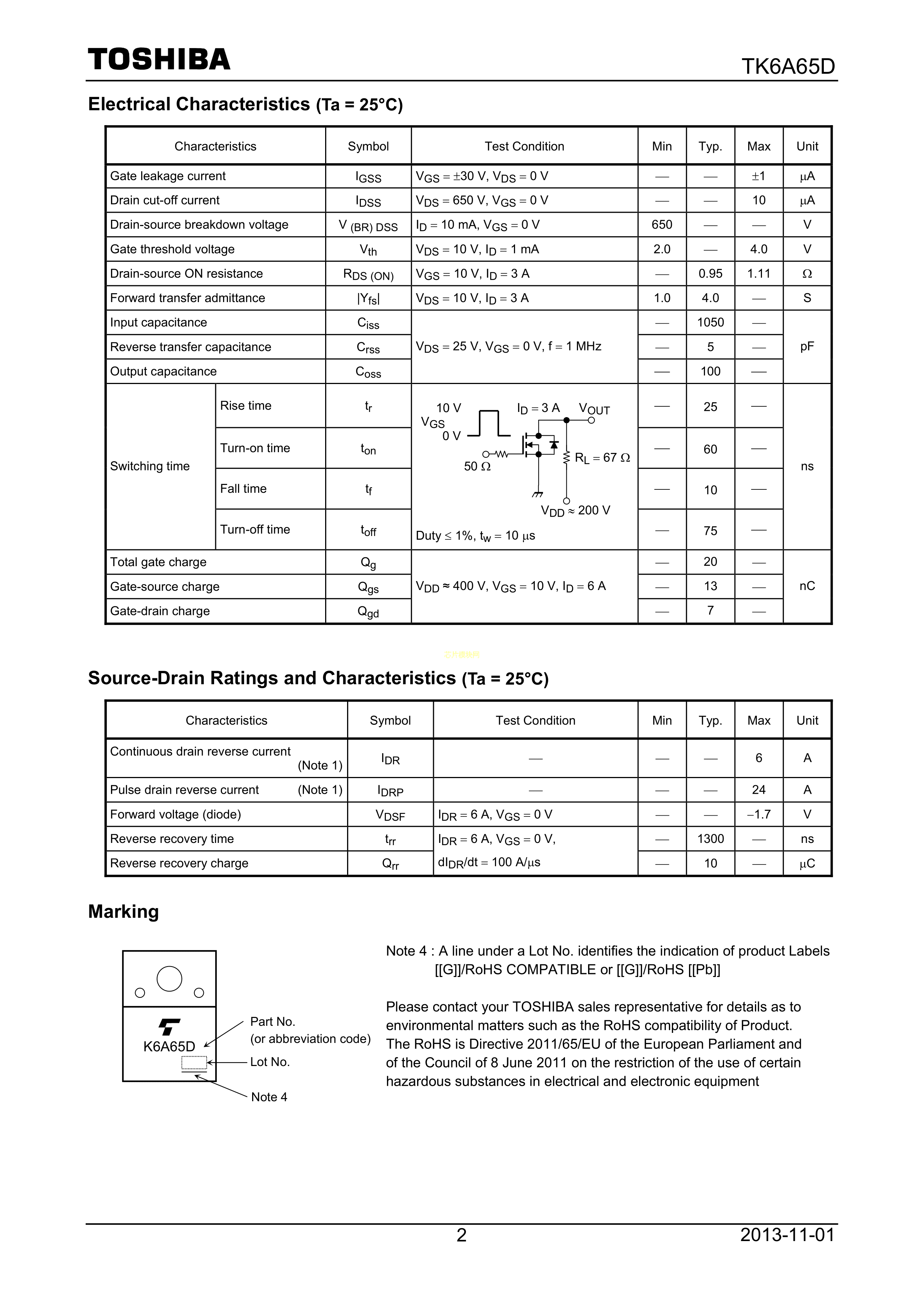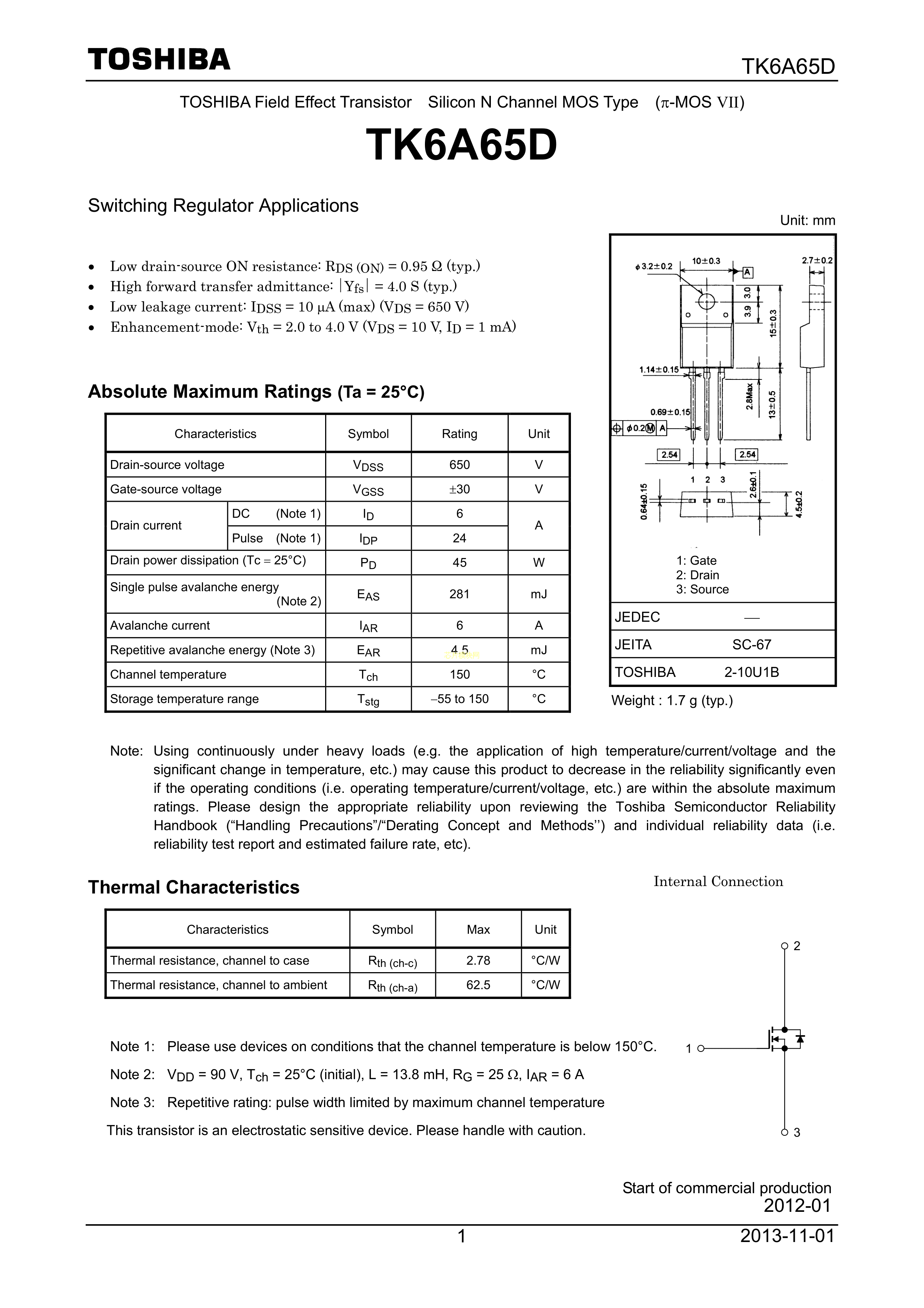 TK6A65D(STA4XM)数据手册SC-67-3封装TOSHIBA(东芝)PDF规格书,中英文下