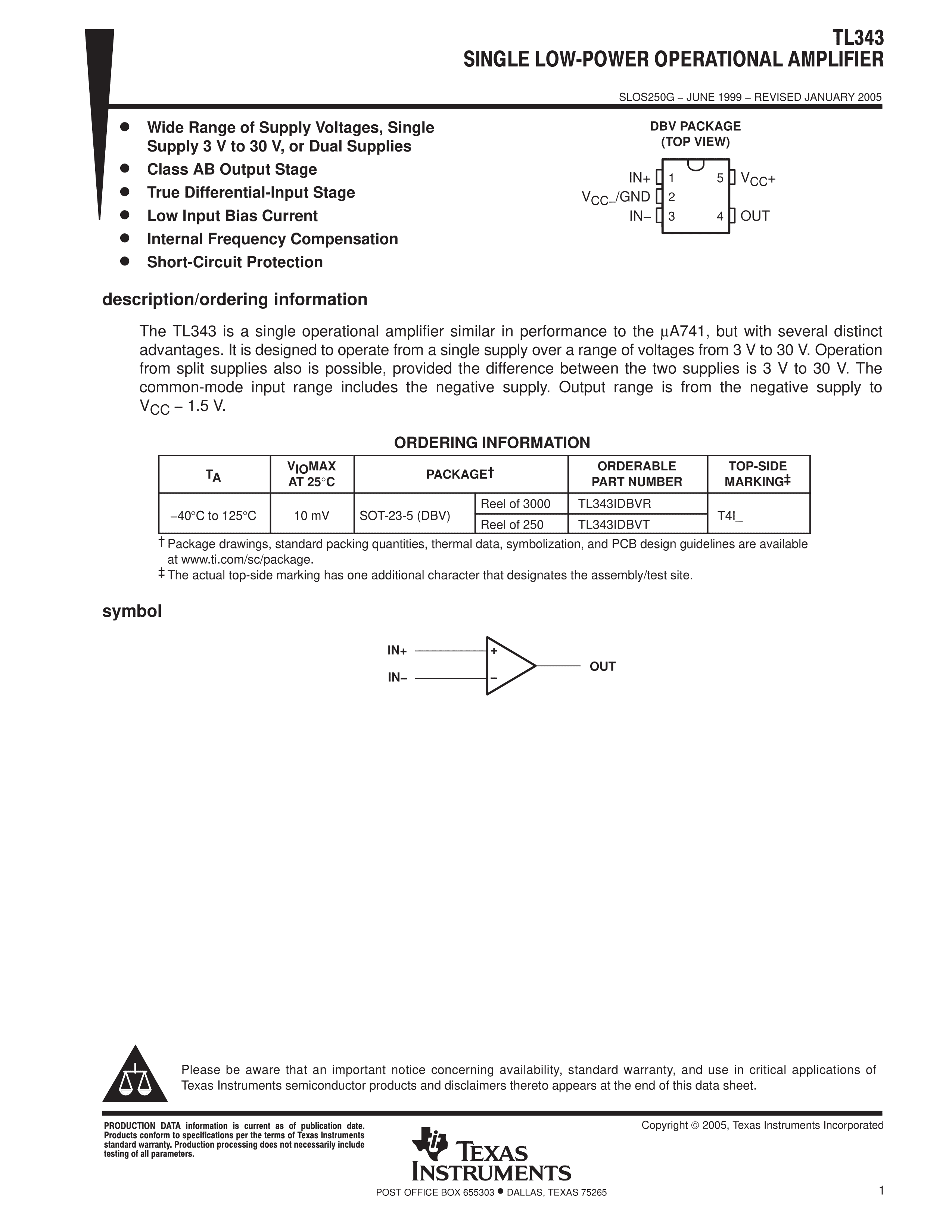 TL343IDBVRG4数据手册SOT-23-5封装TI(德州仪器)PDF规格书,中英文下载