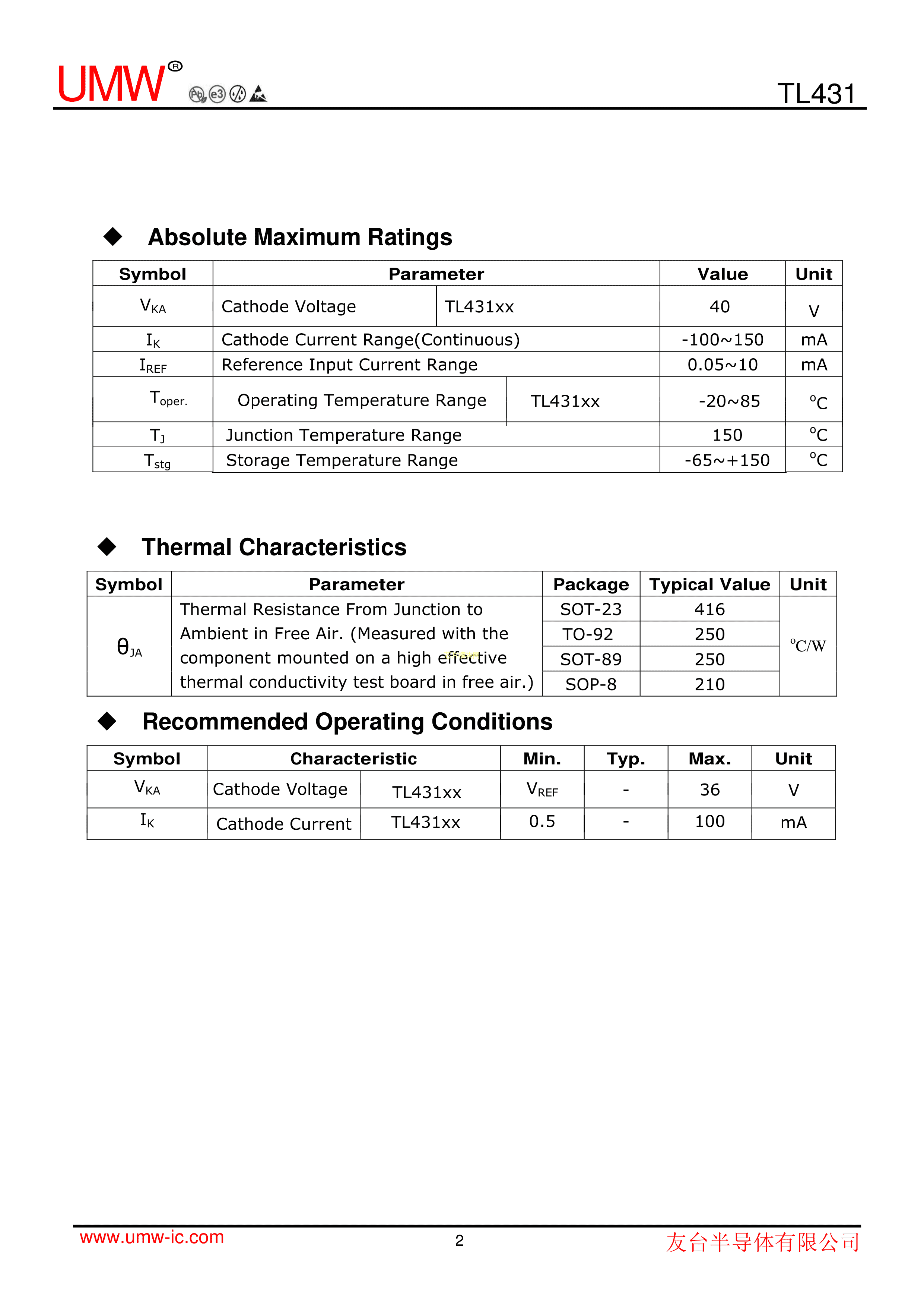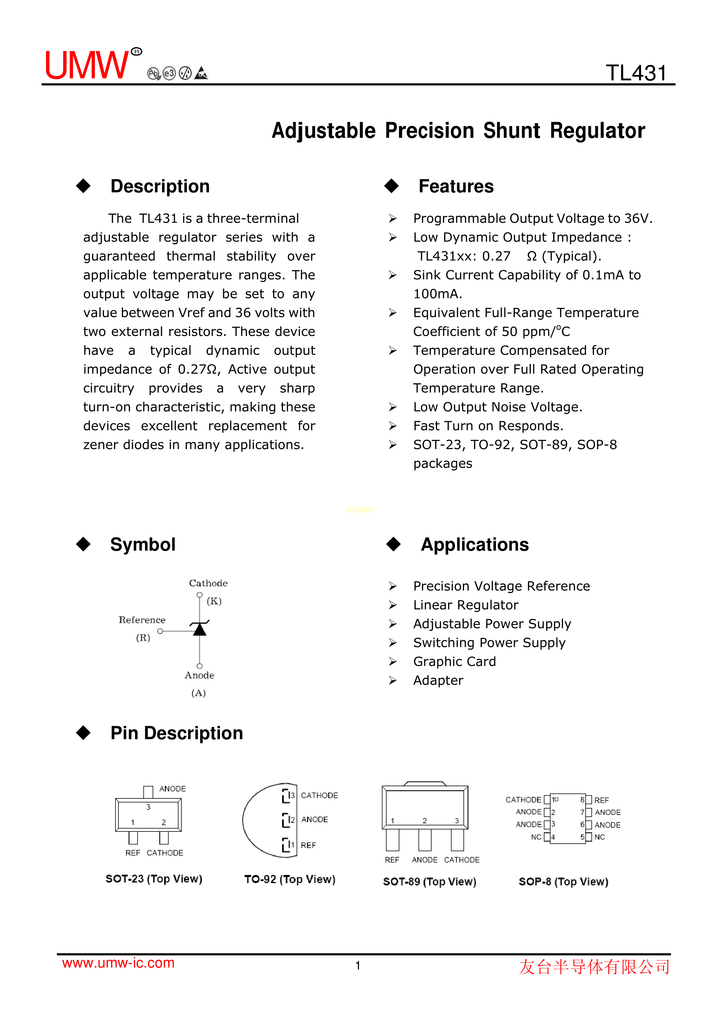 TL431(0.5%)数据手册TO-92封装UMW(友台半导体)PDF规格书,中英文下载
