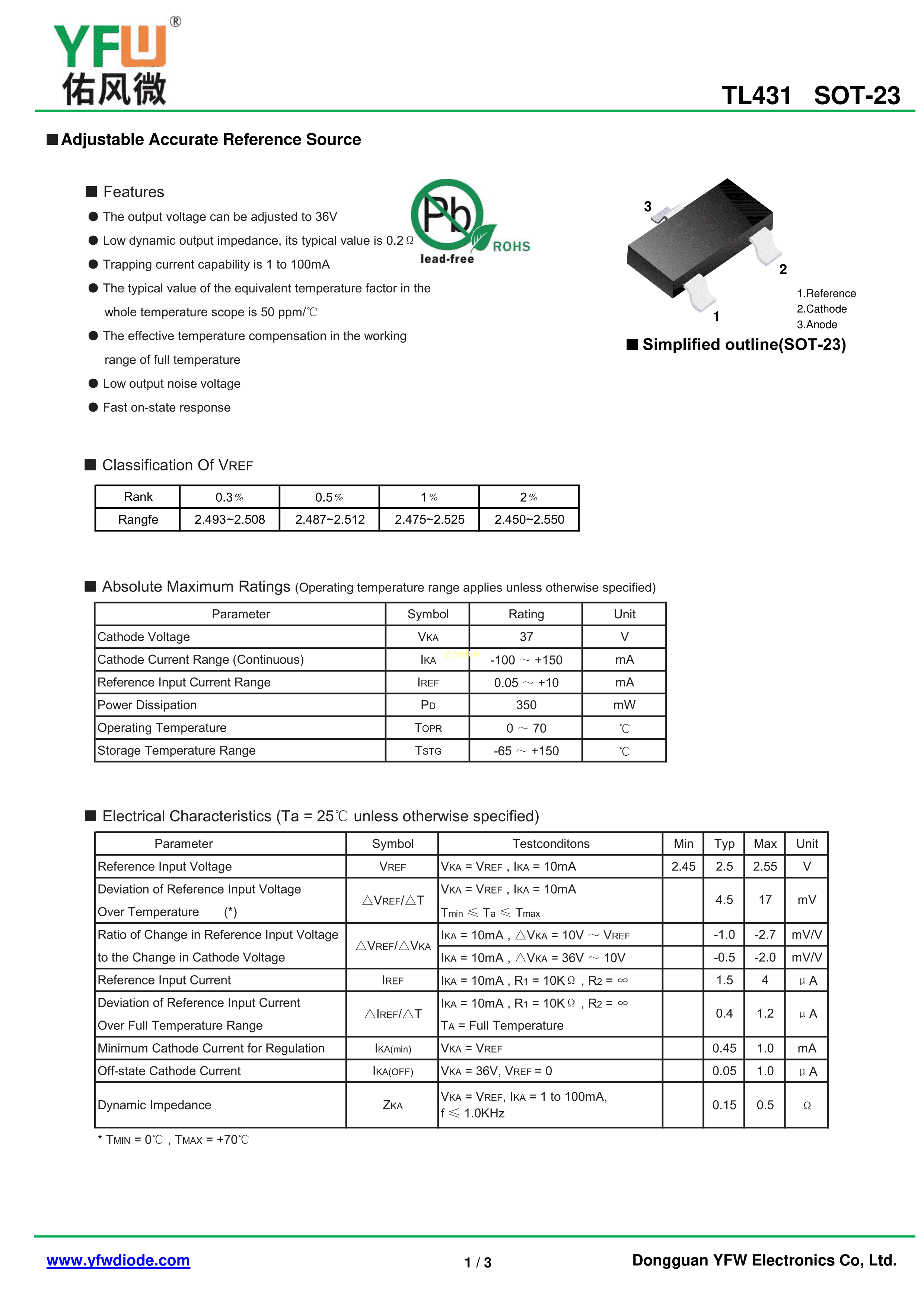 TL431数据手册SOT-23封装YFW(佑风微)PDF规格书,中英文下载